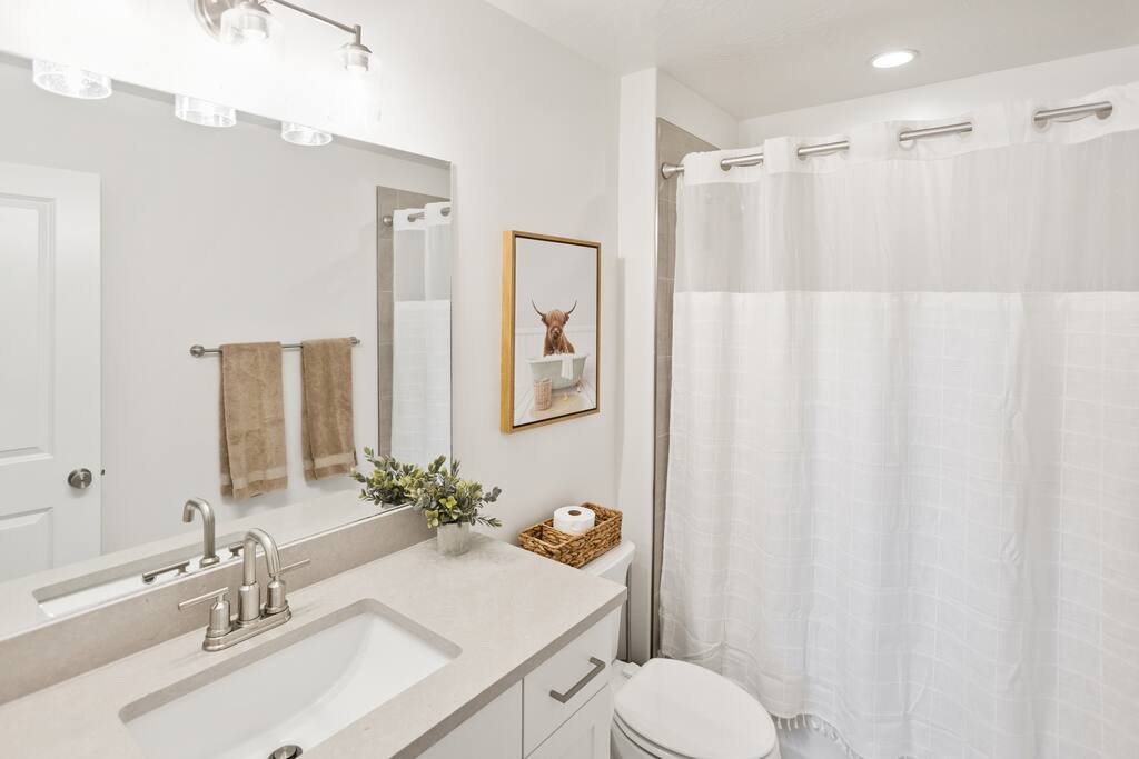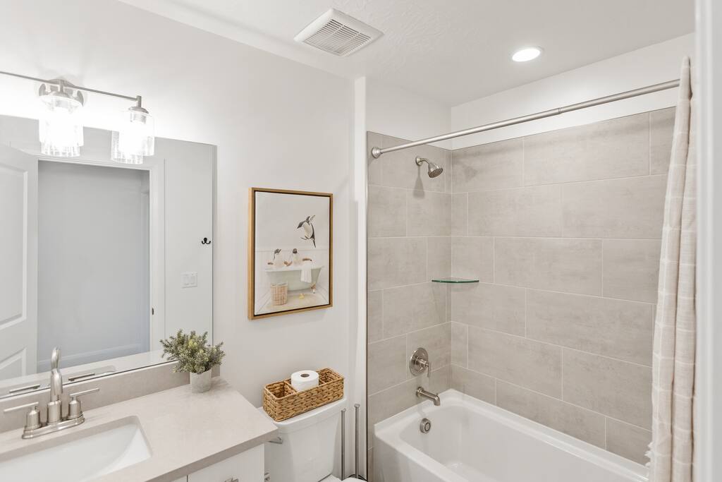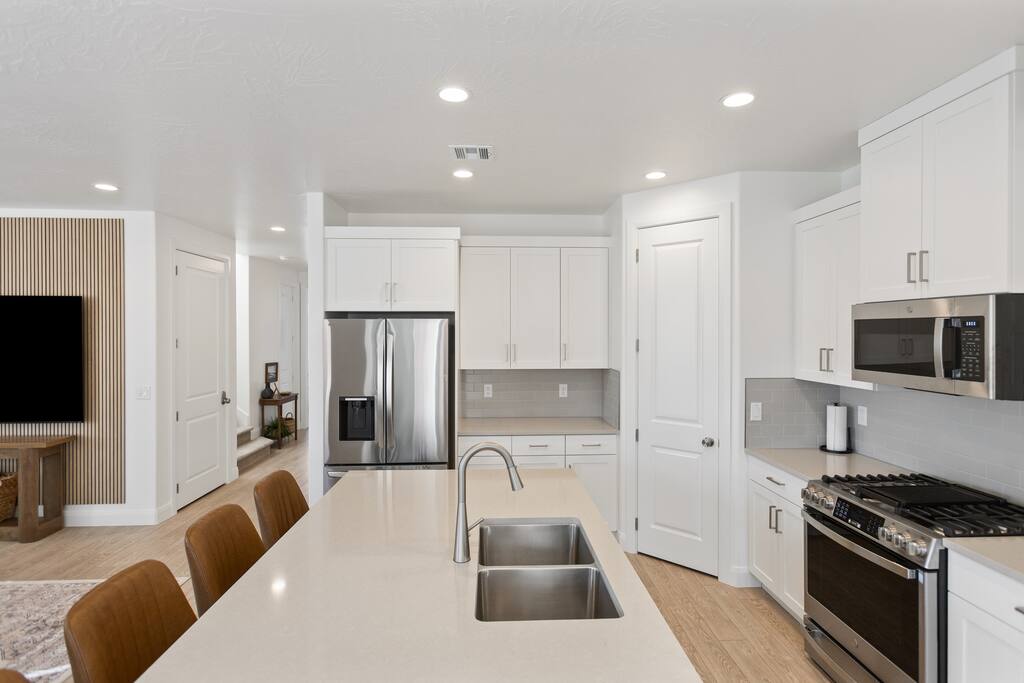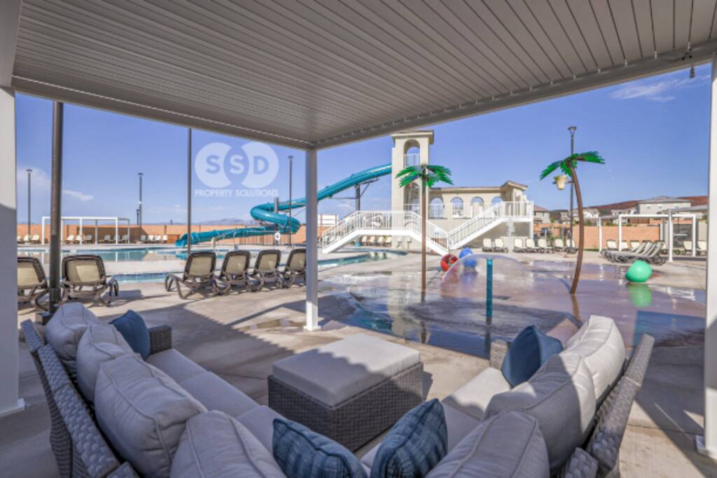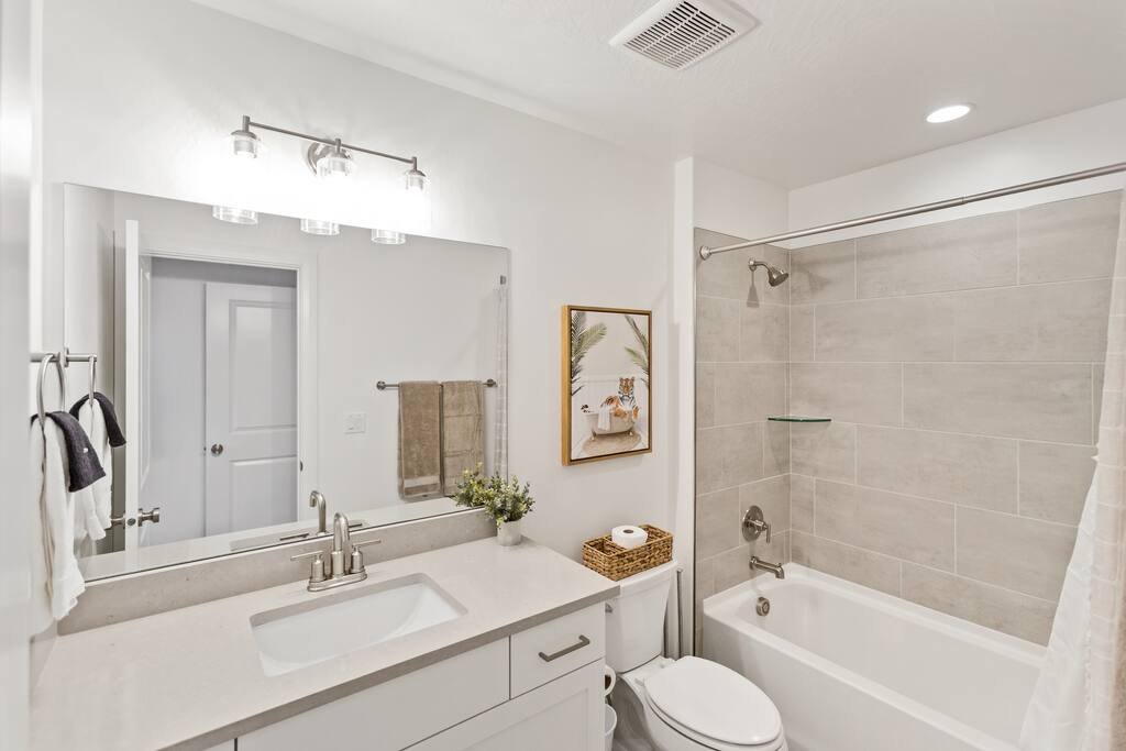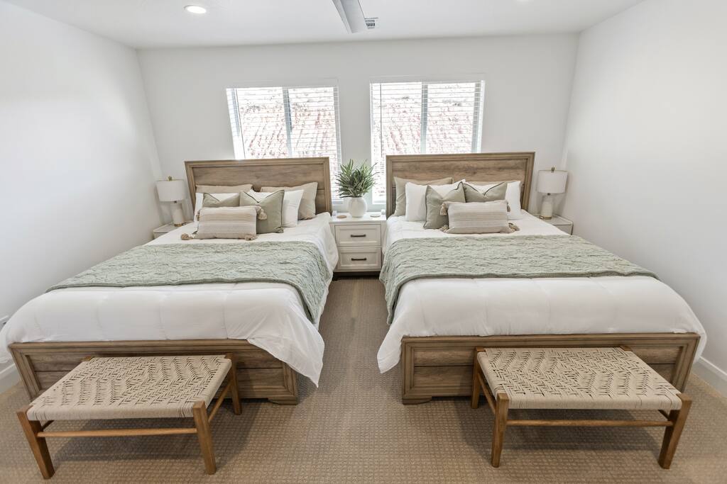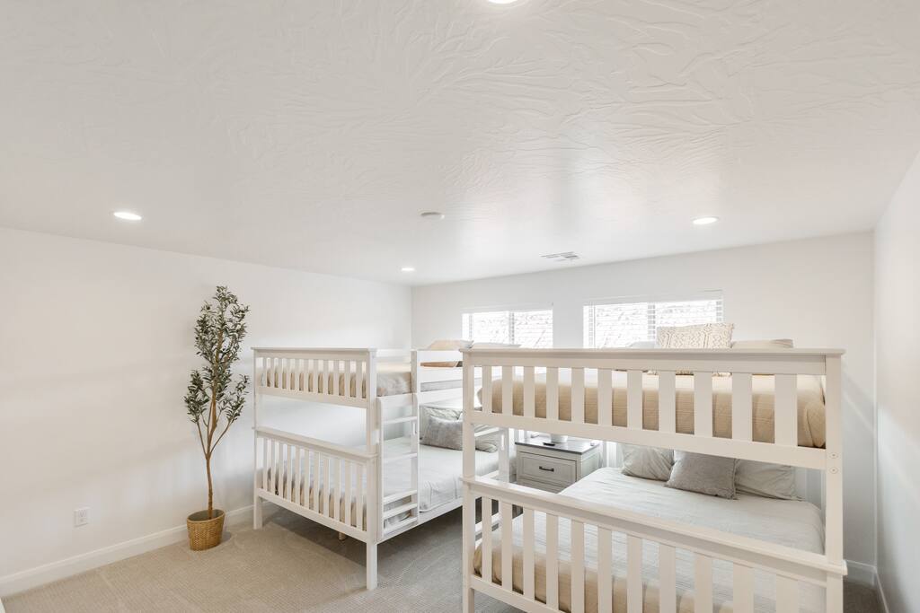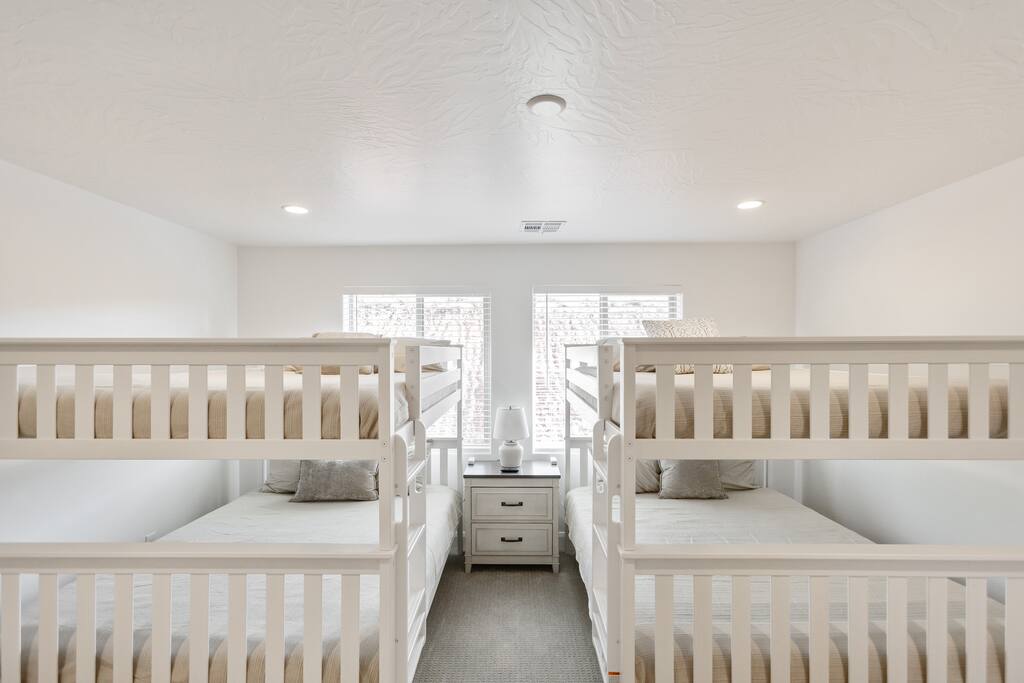 Welcome to Rustico Retreat --> your sunny Southern Utah getaway and home base for Zion days, Sand Hollow adventures, and easy evenings back at the house. Rustico Retreat in Washington, Utah is designed for families and groups who want both comfort and fun: soak in the private hot tub under the stars, grill dinner on the covered patio, challenge the crew to outdoor ping-pong, then head upstairs to the game loft for air hockey, arcade games, and a cozy stash of books and games. MAIN LEVEL --> • Bright open great room w/comfortable seating • Spacious kitchen w/stainless appliances • Dining table + Bar seating for meals • Bedroom 1: King bed + ensuite • Bedroom 2: Queen beds + ensuite UPSTAIRS: --> • Loft with air hockey, arcade, TV + games/books • Laundry room w/Washer + Dryer and supplies • Bedroom 3: King bed + ensuite • Bedroom 4: 2 Queen beds + ensuite • Bedroom 5: Bunk room w/4 Queen beds + ensuite SLEEPING --> • Bedroom 1: King + ensuite (main level) • Bedroom 2: Queen + ensuite (main level) • Bedroom 3: King + ensuite • Bedroom 4: 2 Queens + ensuite • Bedroom 5: Bunk room w/4 Queen beds + ensuite • Queen Air Mattress • Pack-N-Play Portable Crib * We can accommodate 1 infant in this property. If more than 1 infant, please inquire. OUTDOORS --> • Private hot tub • Covered patio with BBQ grill • Outdoor ping-pong table COMMUNITY RESORT AMENITIES --> • Heated pool • Lazy river • Waterslide • Splash pad • Hot tubs • Pickleball courts PARKING --> • 2 garage + 2 driveway • RV/Trailer parking available LOCATION --> Minutes to Zion, Sand Hollow, golf, trails, and dining—so you can explore all day and truly relax at night. WHY YOU’LL LOVE RUSTICO RETREAT--> • Private hot tub (perfect after hiking or lake days) • Covered patio with BBQ grill + outdoor seating • Outdoor ping-pong table for easy family fun • Loft: air hockey + arcade + games + books + TV • Bright open kitchen/living for gathering together • Smart TVs + fast Wi-Fi • Resort-style community amenities: heated pool, lazy river, waterslide, splash pad, hot tubs, and pickleball.