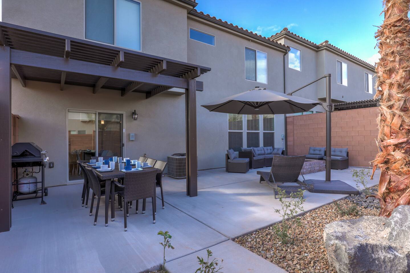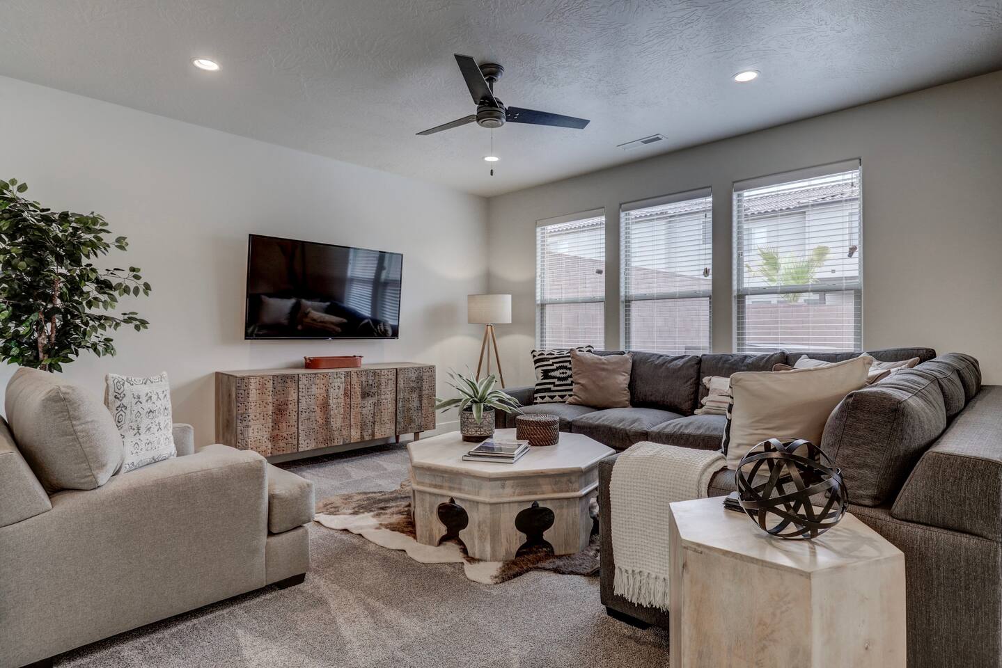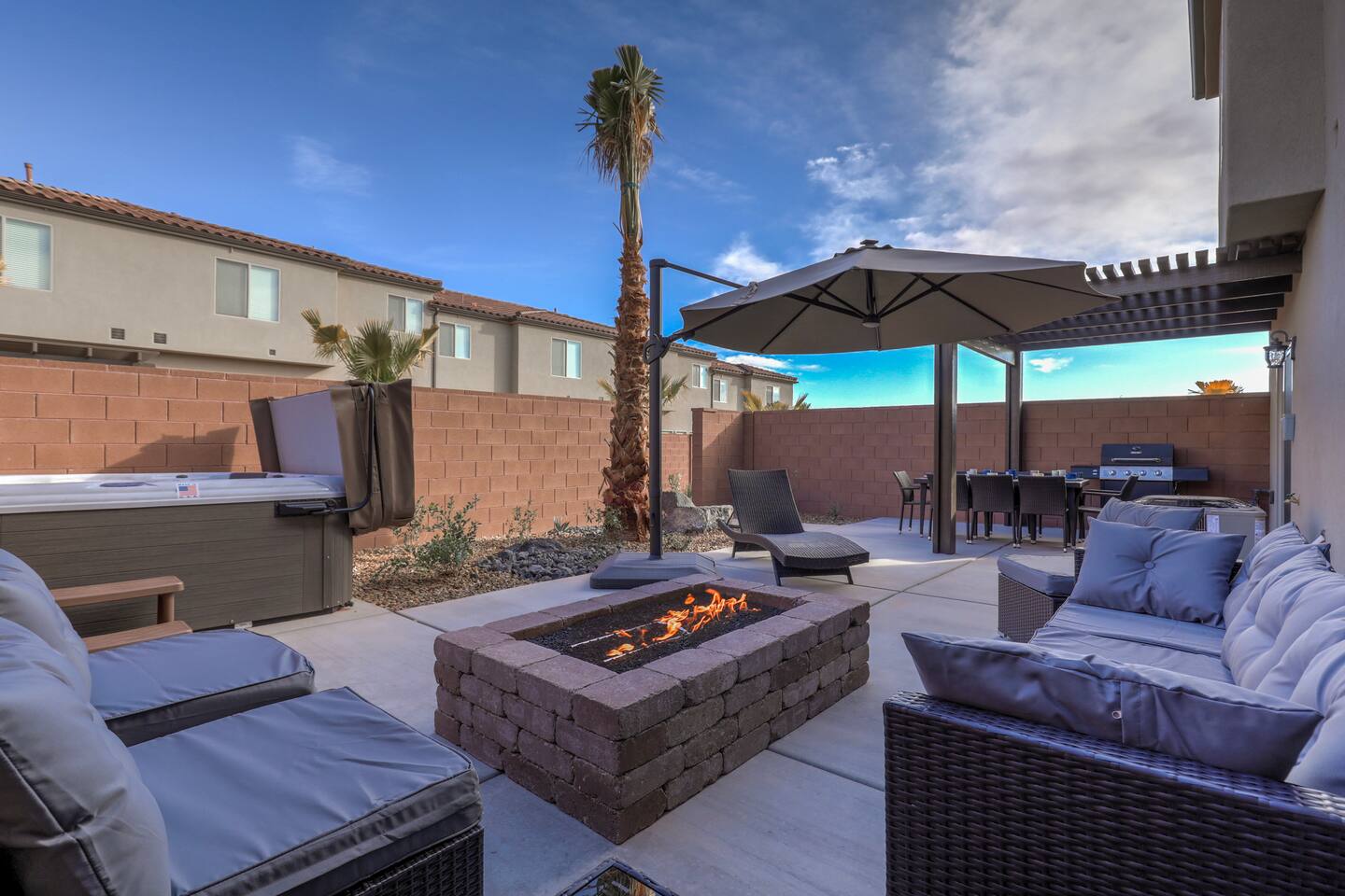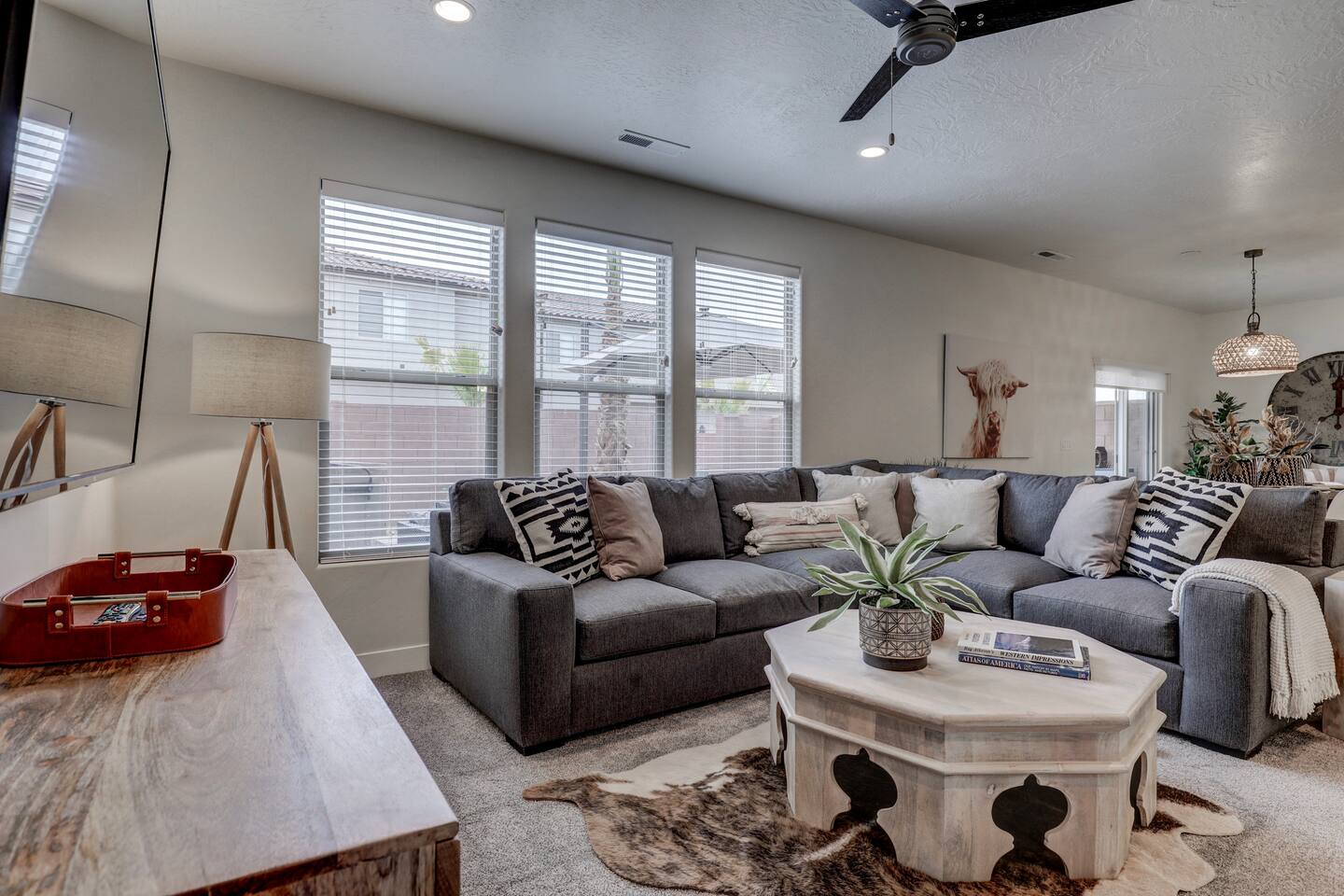 Beautiful home with trendy decor and an open and comfortable layout is optimal for large groups. With two Master Suites, two living areas, four bathrooms and a spacious kitchen, this home is perfect for two families! Backyard includes private hot tub, fire pit, BBQ grill, outdoor dining table with additional outdoor seating allows for true relaxation. Centrally located to Zion National park, championship style golf, amazing hiking, and beautiful St. George, Utah.
