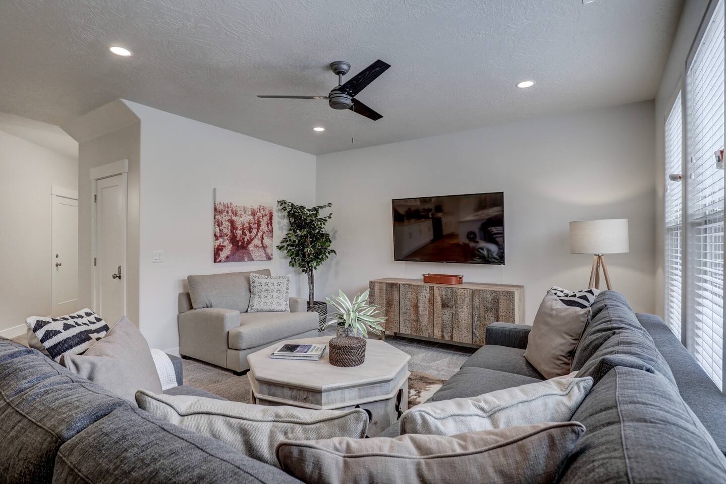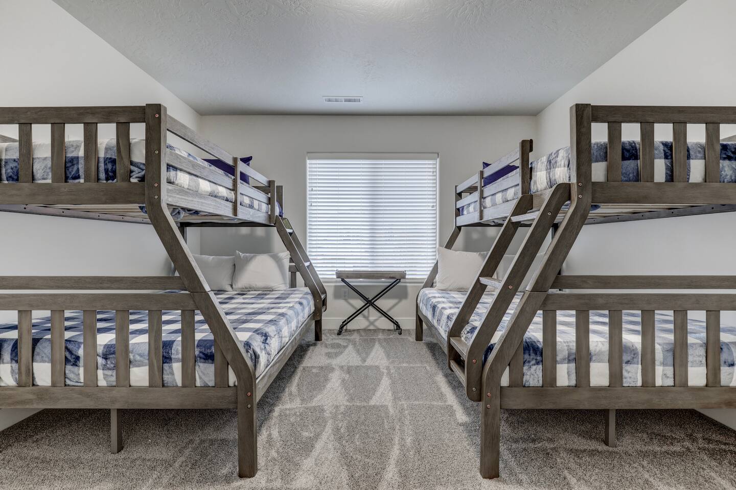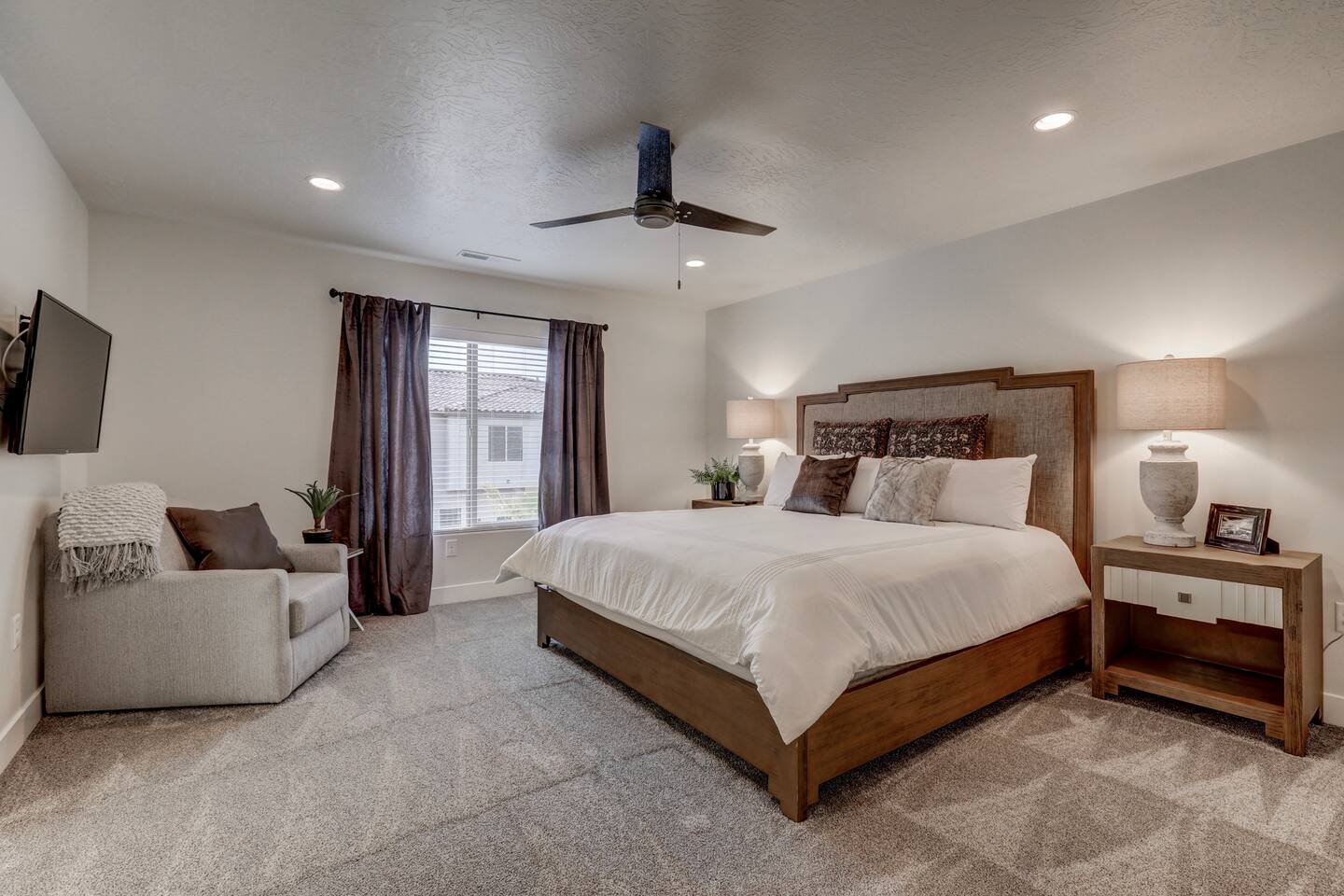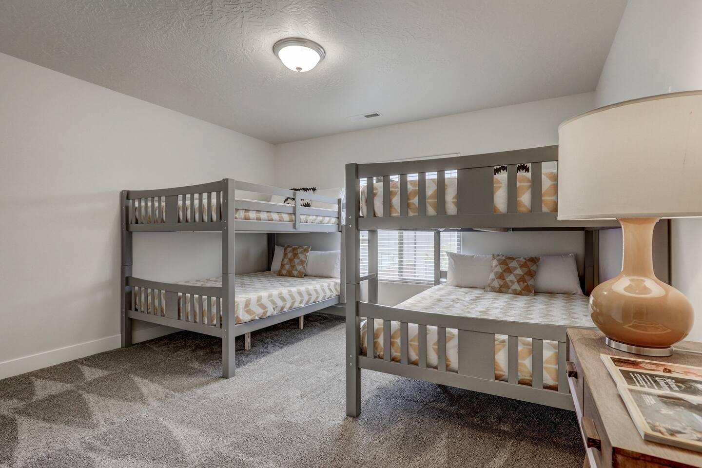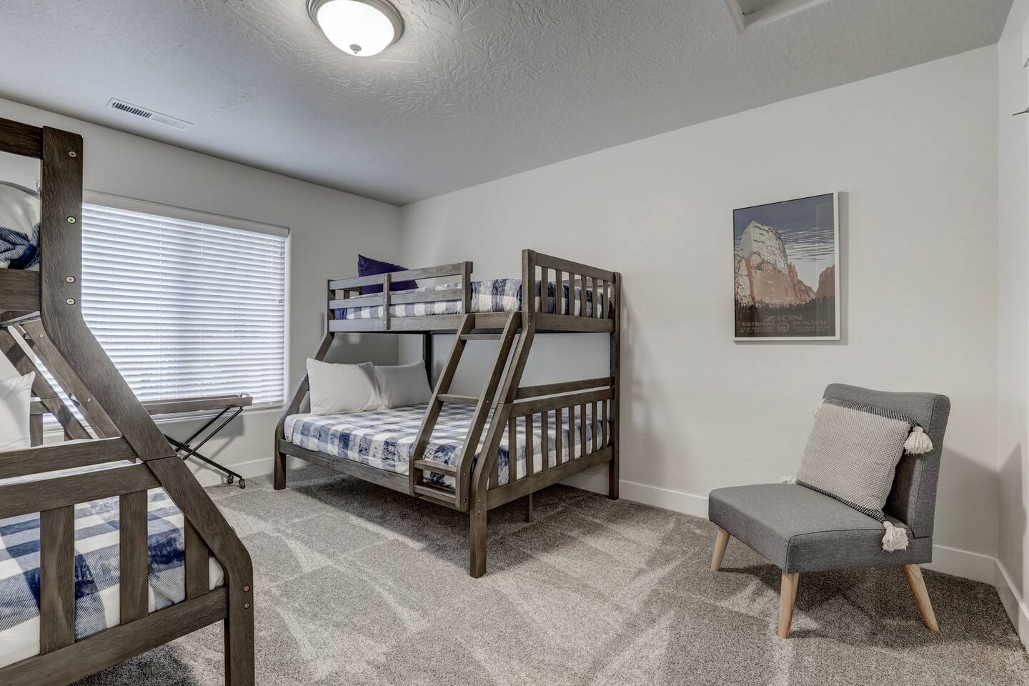 Family friendly, bright, and comfortable, this vacation rental is the ideal home for Southern Utah adventure enthusiasts and families. This well-appointed home can sleep 20 guests comfortably in 4 bedrooms with 4 full bathrooms. Modern design and comfort are embodied in this spacious home with no detail left behind. Perks include a fenced backyard with private hot tub, fire pit, BBQ and comfortable outdoor seating perfect for relaxing after a day of hiking at Zion. Centrally located in Washington, this home is close to conveniences such as grocery shopping, restaurants, entertainment, and sports fields. Looking for an outdoor adventure? Zion National Park is just 45 minutes away and features world class scenery and hiking. Spacious 2500 sq ft home features: • 2 Master Suites • 2 Large Living Rooms • Flatscreen Smart TVs (+ Cable) • Board & Card Games Provided • Upscale Kitchen w/ Cooking Utensils • Private Hot Tub • BBQ Grill • Outdoor Dining Table Seating Eight • Fire Pit & Lounge Seating • 3 Car Garage • 4 Bedrooms w/10 beds • Dog Friendly* • Washer & Dryer • WiFi • Self Check-In Sleeping Accommodations 12 beds sleeps 20 • Master 1 Suite: King • Master 2 Suite: King • Bedroom 3: Four Double Bunk Beds • Bedroom 4: Two Double + Two Single Bunk Beds • Main Level Living Room: Queen Sofa Sleeper • Upstairs Living Room: Queen Sofa Sleeper Additional Sleeping: Pack-N-Play Portable Crib • We can accommodate 1 infant in this property. If more than 1 infant, please inquire. 4 Full Bathrooms: • Bath 1: (upstairs) Master 1 En suite with Double Vanity and Walk-In Shower • Bath 2: (upstairs) Master 2 En suite with Double Vanity and Shower/Tub Combo • Bath 3: (main level) With Walk-In Shower • Bath 4: (upstairs) Double Vanity and Shower/Tub Combo Additional Community Amenities • Community Pool • Common Lawn Area • Boat/RV Parking (First Come, First Serve) * Home is dog friendly and we do not charge a pet fee for one small dog. If you have more than 1 dog or if your dog is larger than 17 pounds - please inquire. We have made exceptions and absolutely willing to consider - pet fee may apply for larger/additional dogs. Please send us a message. We are happy to help!
