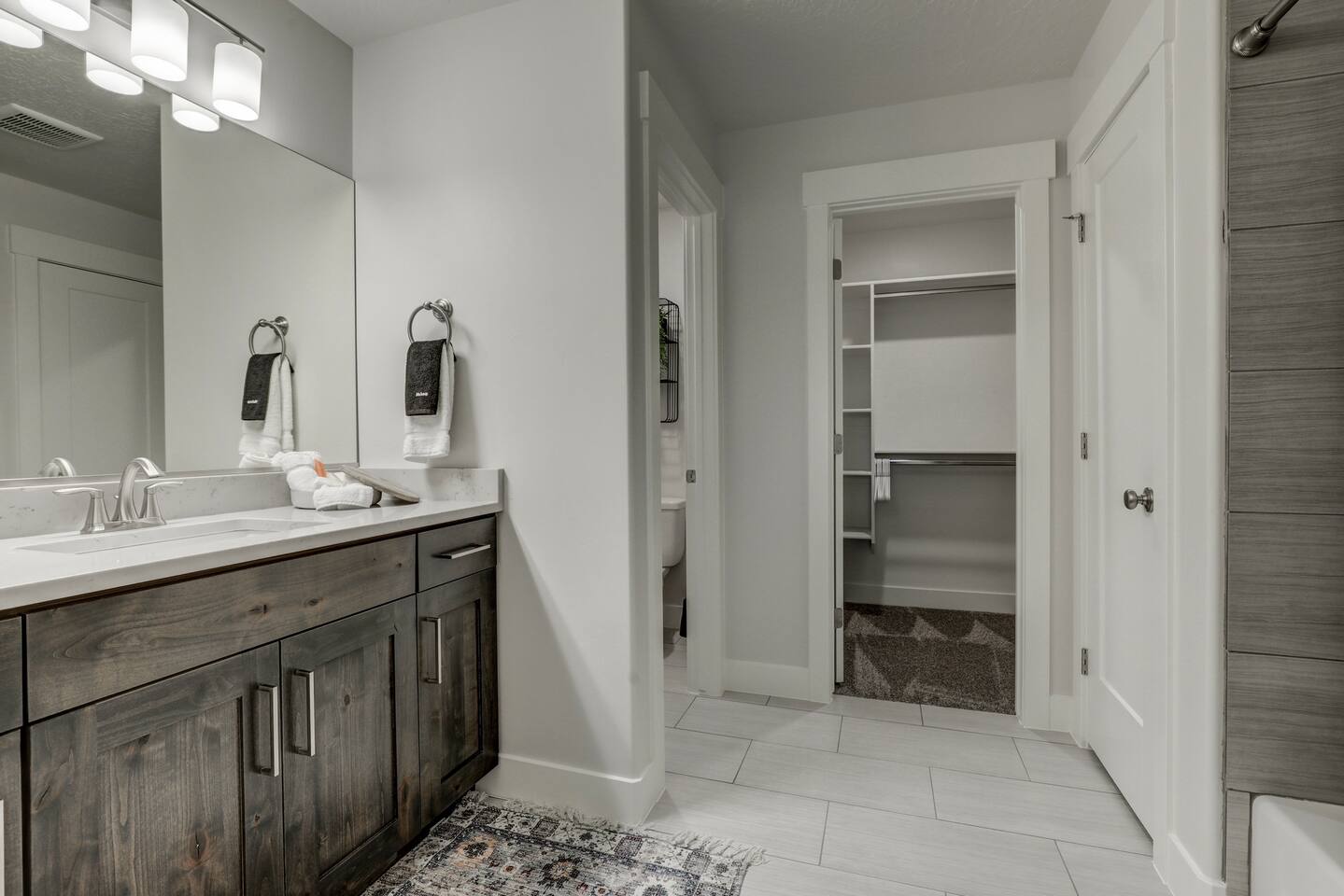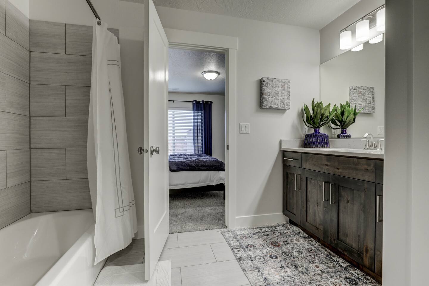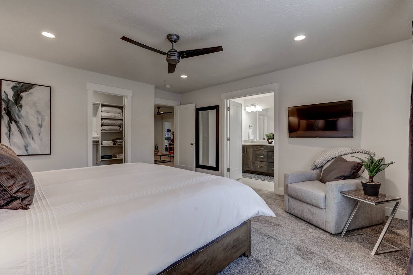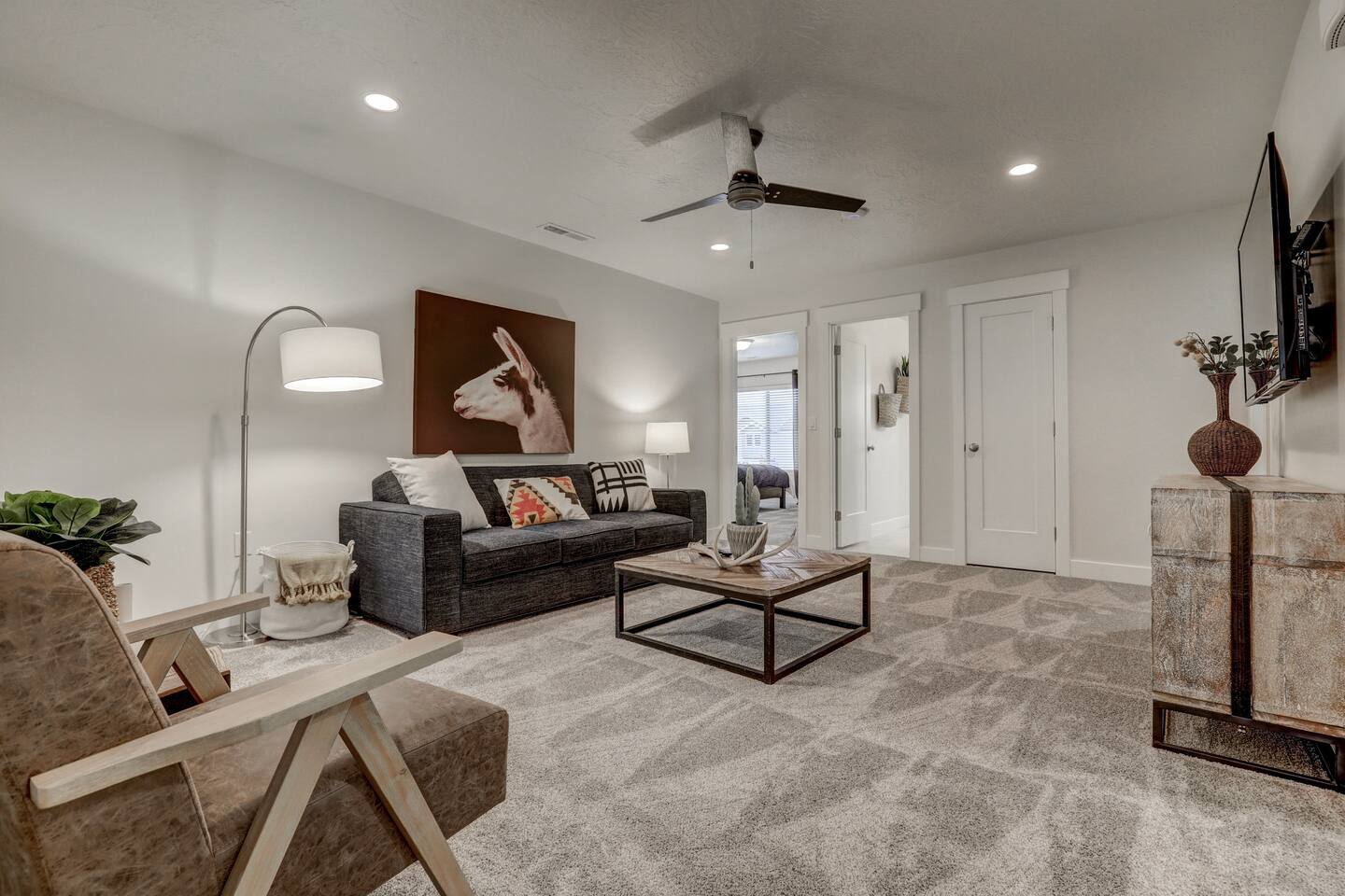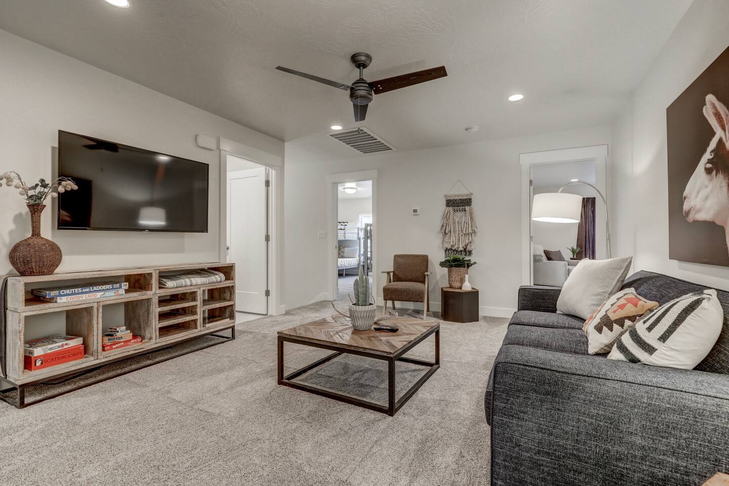 Family friendly, bright, and comfortable, this vacation rental is the ideal home for Southern Utah adventure enthusiasts and families. This well-appointed home can sleep 20 guests comfortably in 4 bedrooms with 4 full bathrooms. Modern design and comfort are embodied in this spacious home with no detail left behind. Perks include a fenced backyard with private hot tub, fire pit, BBQ and comfortable outdoor seating perfect for relaxing after a day of hiking at Zion. Centrally located in Washington, this home is close to conveniences such as grocery shopping, restaurants, entertainment, and sports fields. Looking for an outdoor adventure? Zion National Park is just 45 minutes away and features world class scenery and hiking. Spacious 2500 sq ft home features: • 2 Master Suites • 2 Large Living Rooms • Flatscreen Smart TVs (+ Cable) • Board & Card Games Provided • Upscale Kitchen w/ Cooking Utensils • Private Hot Tub • BBQ Grill • Outdoor Dining Table Seating Eight • Fire Pit & Lounge Seating • 3 Car Garage • 4 Bedrooms w/10 beds • Dog Friendly* • Washer & Dryer • WiFi • Self Check-In Sleeping Accommodations 12 beds sleeps 20 • Master 1 Suite: King • Master 2 Suite: King • Bedroom 3: Four Double Bunk Beds • Bedroom 4: Two Double + Two Single Bunk Beds • Main Level Living Room: Queen Sofa Sleeper • Upstairs Living Room: Queen Sofa Sleeper Additional Sleeping: Pack-N-Play Portable Crib • We can accommodate 1 infant in this property. If more than 1 infant, please inquire. 4 Full Bathrooms: • Bath 1: (upstairs) Master 1 En suite with Double Vanity and Walk-In Shower • Bath 2: (upstairs) Master 2 En suite with Double Vanity and Shower/Tub Combo • Bath 3: (main level) With Walk-In Shower • Bath 4: (upstairs) Double Vanity and Shower/Tub Combo Additional Community Amenities • Community Pool • Common Lawn Area • Boat/RV Parking (First Come, First Serve) * Home is dog friendly and we do not charge a pet fee for one small dog. If you have more than 1 dog or if your dog is larger than 17 pounds - please inquire. We have made exceptions and absolutely willing to consider - pet fee may apply for larger/additional dogs. Please send us a message. We are happy to help!