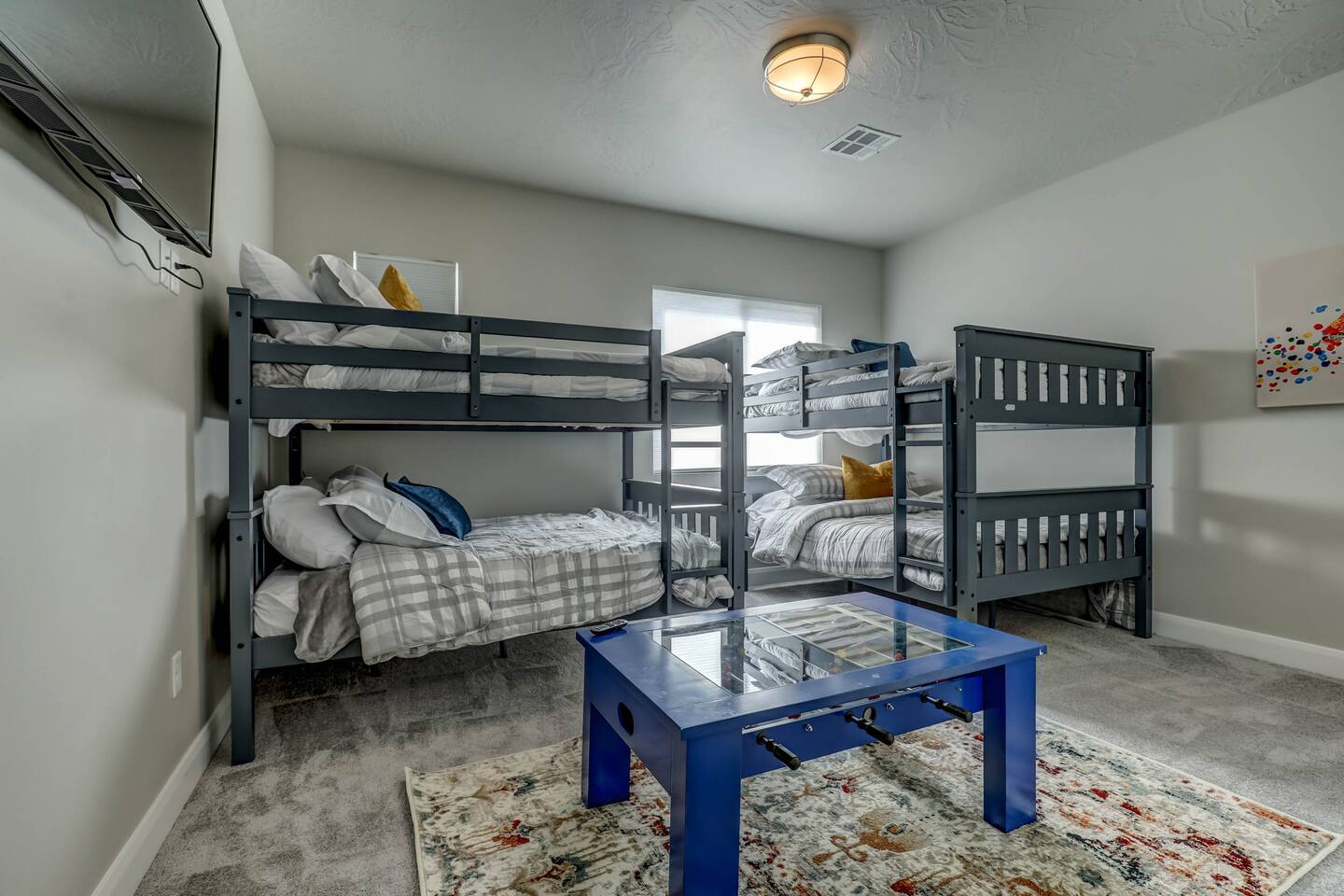 This home will accommodate your group comfortably with sleeping arrangements for up to 12 people with 3 private bedrooms, 3 bathrooms, upstairs balcony, downstairs patio plus a spacious kitchen and living room open area on the main level. Our home offers a fully functional kitchen with traditional drip coffee maker, high-speed internet, 4 Roku smart TVs, luxury bedding and even pool towels! Included at no additional cost in the community area are a fitness center, locker room with showers, indoor kitchen with dining area, foosball and pool table, outdoor BBQ area with seating, and the LARGEST private resort pool in the state of Utah including a splash pad, slide and large lazy river. The pool & all amenities are open 365 days a year from 9 am to 10 pm. The fitness center can be accessed at 6am. Master Suite (Sleeps 2) • 1 King bed • Smart Roku TV • Dresser • Huge walk-in closet that will fit pack and play • Luxurious walk-in shower • Private Balcony Bedroom 2 (Sleeps 2) • King Bed • Dresser + Night Stand • Walk-in Closet • Smart Roku TV Bedroom 3 (Sleeps up to 8) • Two full over full bunk beds • Four double sized mattresses • Closet • Smart Roku TV Queen size air mattress and extra bedding (Sleeps 2) Pack and play (Sleeps 1) * We can accommodate 1 infant in this property. If more than 1 infant, please inquire. Boat, Trailer, & RV Parking: The home has a 2-car garage. There is also additional parking on a first come - first serve basis. There is a designated area for boat, trailer, and RV parking located in the dirt lot in Zion Village Resort. We are not liable for any damaged equipment or the inability to store boats, trailers, or RVs in the designated area.