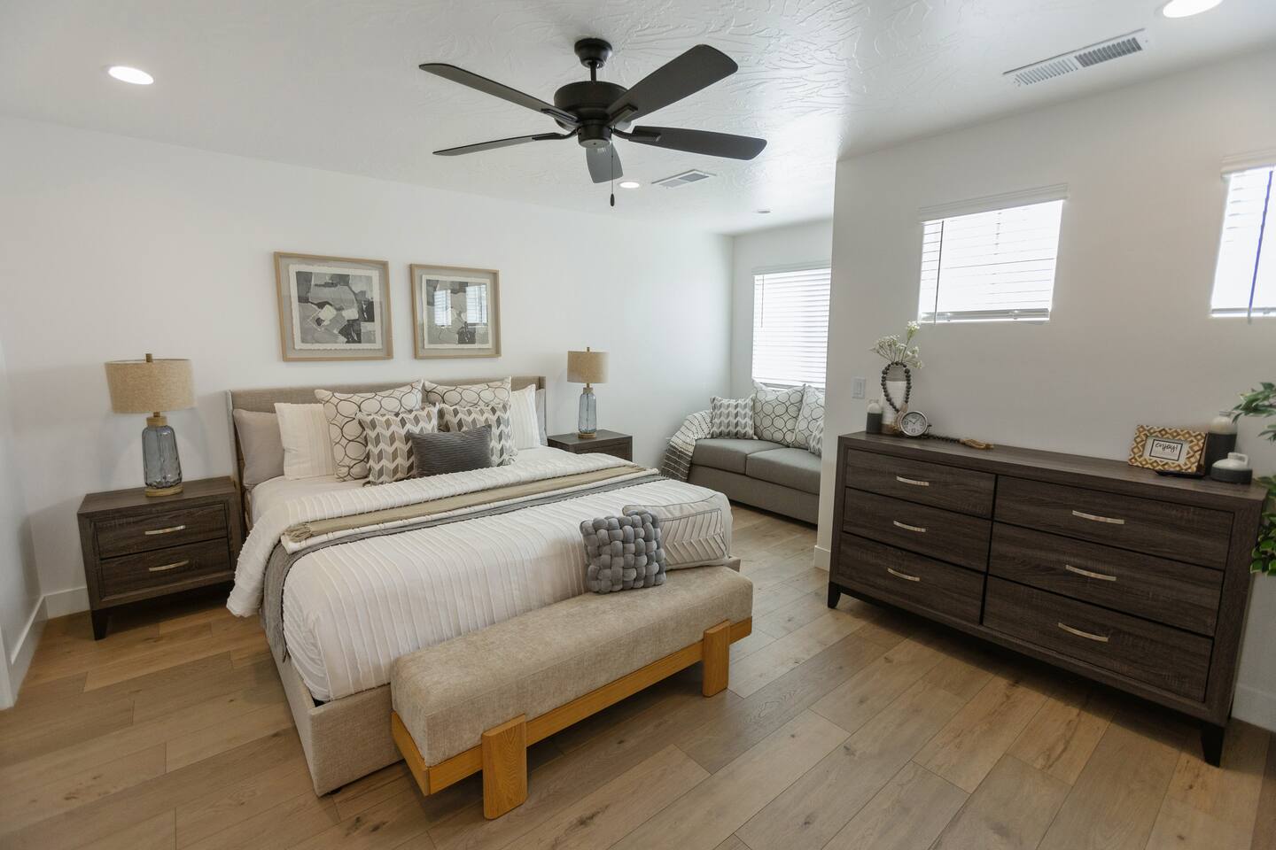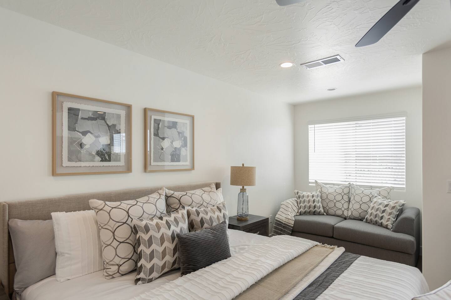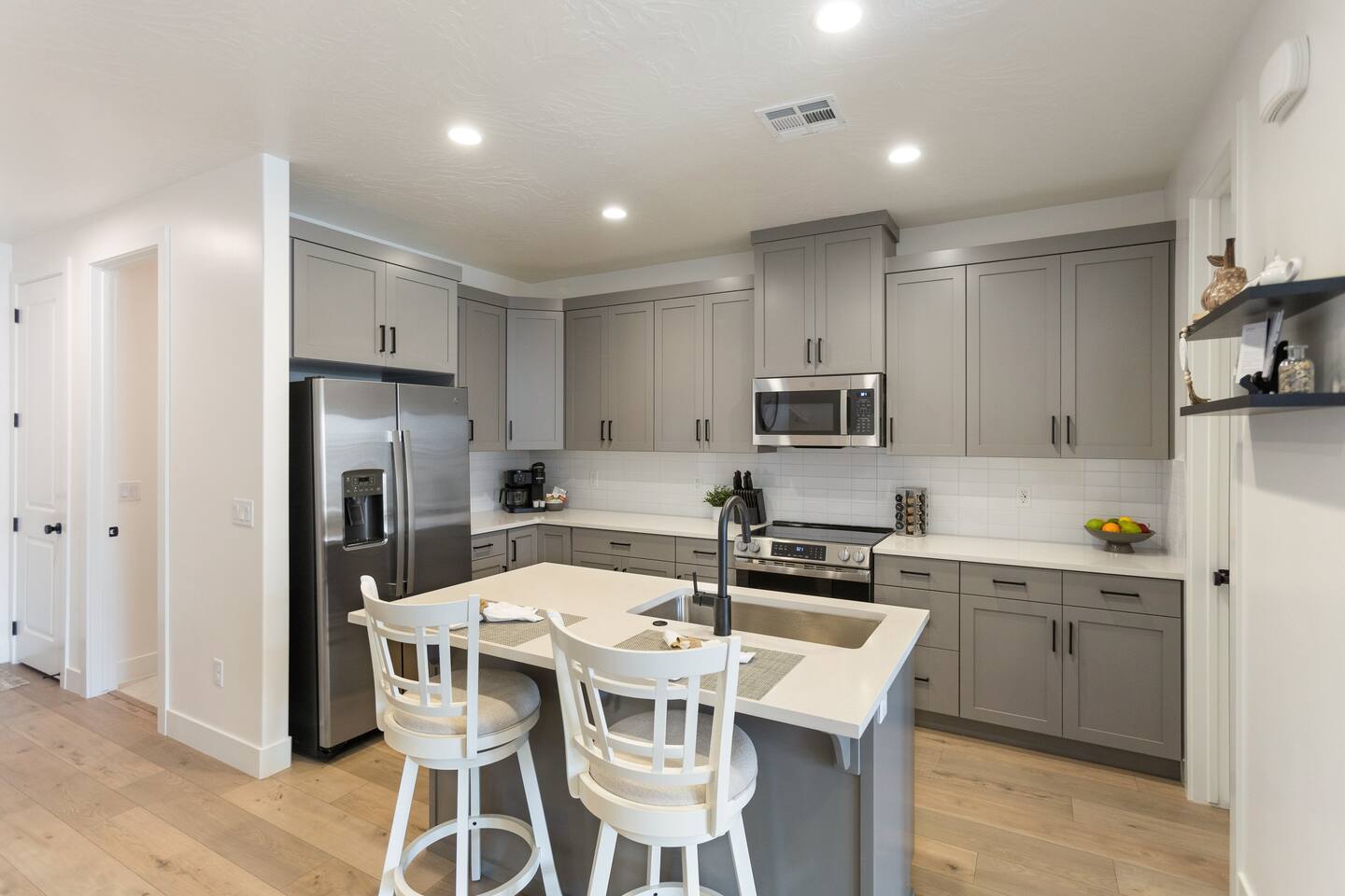 🛏️ Accommodations: 1️⃣ Bedroom: King Bed w/ En suite Bathroom (Sleeps 2) 2️⃣ Bedroom: Queen Bed (Sleeps 2) 3️⃣ Bedroom: Queen Bunk Bed x 2 (Sleeps 4) + Additional: Queen Air Mattress (Sleeps 2) Pack N Play Portable Crib (We can accommodate 1 infant in this property. If more than 1 infant, please inquire.) 📶 Fast WiFi Internet 📺 Smart TVs in all rooms 🚘 Garage w/EV charger 🛏️ Premium Mattresses with Luxury Bedding 🧺 Washer/Dryer w/Laundry Supplies 🍽️ Fully Stocked Kitchen w/New Appliances 🐶 Dog Friendly* 🌄 Courtyard w/Outdoor furniture 🔥 Fire Pit + BBQ Grill w/Propane 💦 Heated Pool All Year (10am - 10pm) 🏓 Pickle Ball Courts (6am - 10pm) 🚘 Parking: The home has a 2-car garage with Level 2 charger for your EV (Don't forget your cord!) There is plenty of parking within the community for Trailers and RVs. 🍽️ Stocked Kitchen Includes: Coffee Maker/Keurig Blender Crockpot Griddle Dishes Glasses Coffee Cups Wine Glasses Kid Dish Set Silverware Knife Set Mixing Bowls Serving Dish and Platter Tupperware Pots & Pans Pyrex Dishes Colander Cookie Sheet Cake Pan Measuring Cups and Spoons Mixing Spoons Whisks and Spatulas Large Serving Spoons Vegetable Peeler Pizza Cutter Ice Cream Scoop Can/Wine Opener Outdoor Utensils for BBQ Grill and MORE!!!! This new home is the perfect rental for your Southern Utah vacation! Even though you'd never want to leave our comfortable professionally designed home, this home is just moments to the fun of Sand Hollow Reservoir and golf course! From the fully stocked kitchen to the bbq on the patio, this spacious home will make you not want to leave! * Home is dog friendly and we do not charge a pet fee for one small dog. If you have more than 1 dog or if your dog is larger than 17 pounds - please inquire. We have made exceptions and absolutely willing to consider - pet fee may apply for larger/additional dogs. Please send us a message. We are happy to help!