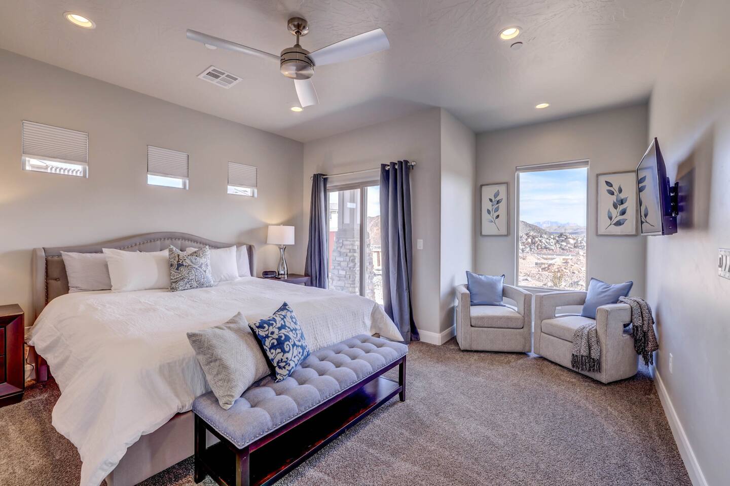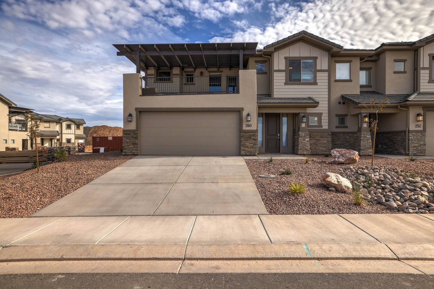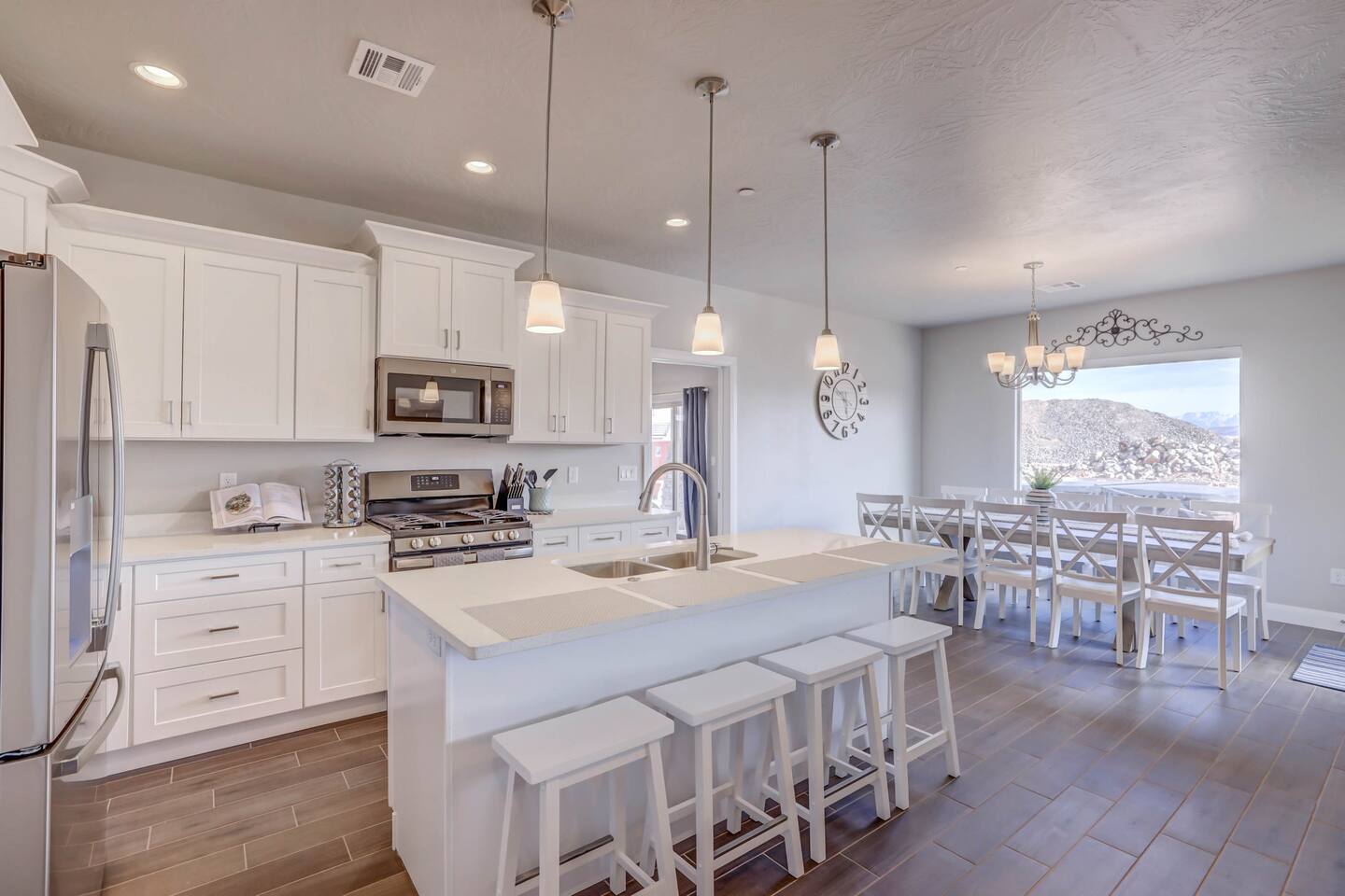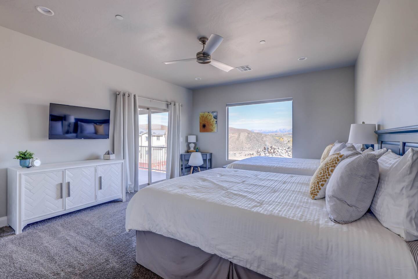 Gather together in the spacious living area on the main level that is perfect for conversation and comfortably seats large groups, complete with 65” Roku Smart TV. The extended dining table seats 10, with additional 4 bar seats at the granite kitchen island. Our gourmet kitchen has oversized cabinets, breakfast bar, top of the line stainless steel appliances, and fully stocked with everything you would need for preparing meals and entertaining a large group. The kids will enjoy the Xbox, art activity books, multiple board and card games located upstairs in the loft/media room or a game of ping pong on the oversized balcony. This amazing home is packed with all sorts of things to do. You'll be making memories with your family and friends as you take the wagon from the garage which is full of pool toys just steps away. Sun bathe poolside, float in the lazy river, or splash around with the kids during the day then relax in the oversized hot tub under the stars. BBQ and dine under the large covered area by the pool, by the fire pit or privately on the back patio at the house. End your day on one of the balconies, with a drink in hand, watching the desert sun set behind the mountains then play Ping Pong on the oversized covered deck. Need to work or kids having online school? No problem, High Speed Internet throughout the home and resort. Home features several working spaces. Our professionally designed, brand new home with private entrance features well-appointed furnishings for comfort and relaxation for families and groups. Enjoy large swimming pool with lazy river, unique lounge spots, hot tub, epic kid splash pad and slide *HEATED & OPEN ALL YEAR* You will also enjoy resort amenities including clubhouse w/ fitness center, pool table, large BBQ grilling area with plenty of seating & fire pits. This amazing home makes for a rejuvenating and fun retreat for multiple families, large groups, and teams. Our 5 bedroom 4.5 bathroom home boasts four master suites and a bunk room. * * * Accommodations * * * SLEEPING CAPACITY: 18 w/12 individual beds MASTER BEDROOM 1: King Bed + Full Bathroom on Main Level (sleeps 2) * Spacious king bed, ceiling fan, flat-screen Roku Smart TV. Includes a large closet, a private patio area outside of the sliding doors to relax in the mornings and evenings. This Master Bedroom has a sitting nook with 2 comfortable chairs perfect for reading or napping and a large bench in front of the TV. Full bathroom with double vanities, large walk-in shower and private toilet area. Stocked with spa toiletries, luxury linens and hair dryer. MASTER BEDROOM 2: King Bed + Full Bathroom (sleeps 2) * Luxurious king bed, ceiling fan, flat-screen Roku Smart TV. Features a large closet, and a private balcony great for watching the sunset in the evenings. Full bathroom with walk-in shower and private toilet area. Stocked with spa toiletries, luxury linens and hair dryer. MASTER BEDROOM 3: King Bed + Full Bathroom (sleeps 2) * Comfortable king bed, ceiling fan, Roku Smart TV, closet for storage space, and access to the Jack-and-Jill shared bathroom. There is a sink and vanity that is private to this room and is stocked with spa toiletries, luxury linens, and hair dryer. MASTER BEDROOM 4: Queen Bed x 2 (sleeps 4) * Two queen-sized beds with balcony. Large bedroom includes ceiling fan, Roku Smart TV, desk and chair, dresser and a full length mirror. Full bathroom in the hall outside the bedroom door stocked with spa toiletries, luxury linens, and hair dryer. BUNK BEDROOM 5: Bunk Beds with Trundle (sleeps 5) * Five bunk beds. Bunk bedroom includes a traditional closet for storage, ceiling fan, Roku Smart TV, art table with activity/coloring supplies and an art board that will entertain kids. ADDITIONAL SLEEPING ACCOMMODATIONS: Queen Inflatable Air Mattress Pack-N-Play Portable Crib * We can accommodate 1 infant in this property. If more than 1 infant, please inquire. UPSTAIRS LOFT/MEDIA ROOM: * Perfect place for the queen inflatable air mattress. Includes 2 chaise loungers, 2 pouf ottomans, and a Roku Smart 55” TV as well as XBOX with unlimited game subscription. Board games and cards as another fun activity for downtime. OVERSIZED COVERED DECK: * Accessed from the loft on the second level. Spacious, extra large 24x20 deck with ping pong table, comfortable large sectional sofa. Perfect place to read, do early morning yoga or meditation, play games, or relax. The deck also is a great place to sleep under the stars on the queen inflatable air mattress. GOURMET KITCHEN: * Large kitchen completely outfitted with new stainless-steel appliances and gorgeous granite countertops. You will be able to cook a Thanksgiving feast in our fully stocked kitchen. You will find everything you will need to prepare meals for a large group (see detailed list at bottom) PATIO: BBQ grill with grill utensils and propane tank provided Hot Tub will be cleaned and running at 102 upon arrival GARAGE: Large 2 Car Parking Ping Pong Table with paddles and balls (Full Size) Wagon + Bucket of Pool Toys Water Softener LAUNDRY ROOM: Washing Machines and Dryers available for your use (one in laundry room and another upstairs in hall) Iron & Ironing Board Laundry Detergent & Dryer Sheets First Aid Kit * Fire Extinguisher 24 Cabana Towels for Hot Tub/Pool in lower cabinets in laundry room on main We know many want to know what exactly is included in a “fully stocked” kitchen. This kitchen will not disappoint. GOURMET EQUIPPED KITCHEN: Coffee Maker Keurig Blender Crockpot Griddle Dishes Glasses: Tall and Short Coffee Cups Wine Glasses Kid Dish Set Silverware Knife Set Spice Rack Mixing Bowls Serving Dishes and Platters Tupperware Pots & Pans Pyrex Dishes Colander Cookie Sheets Cake Pans Measuring Cups and Spoons Mixing Spoons Whisks and Spatulas Large Serving Spoons Vegetable Peeler Pizza Cutter Ice Cream Scoop Can/Wine Opener Outdoor Utensils for BBQ Grill and MORE!!!! St George area dominates as the world's outdoor play p