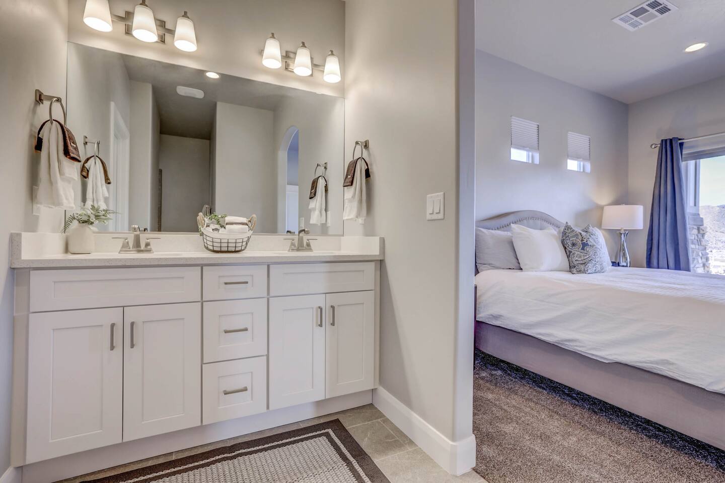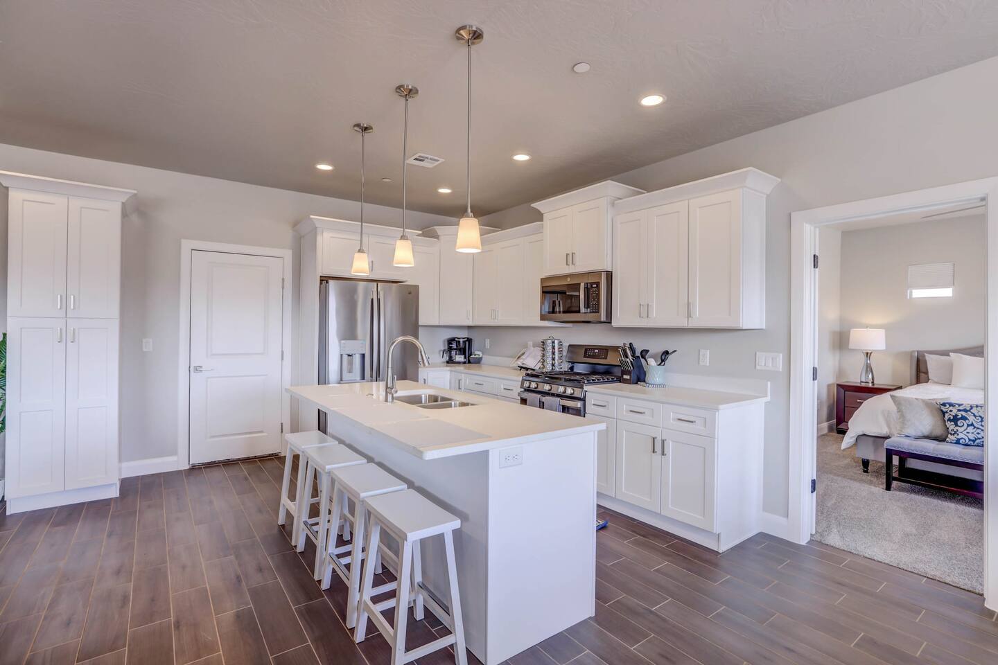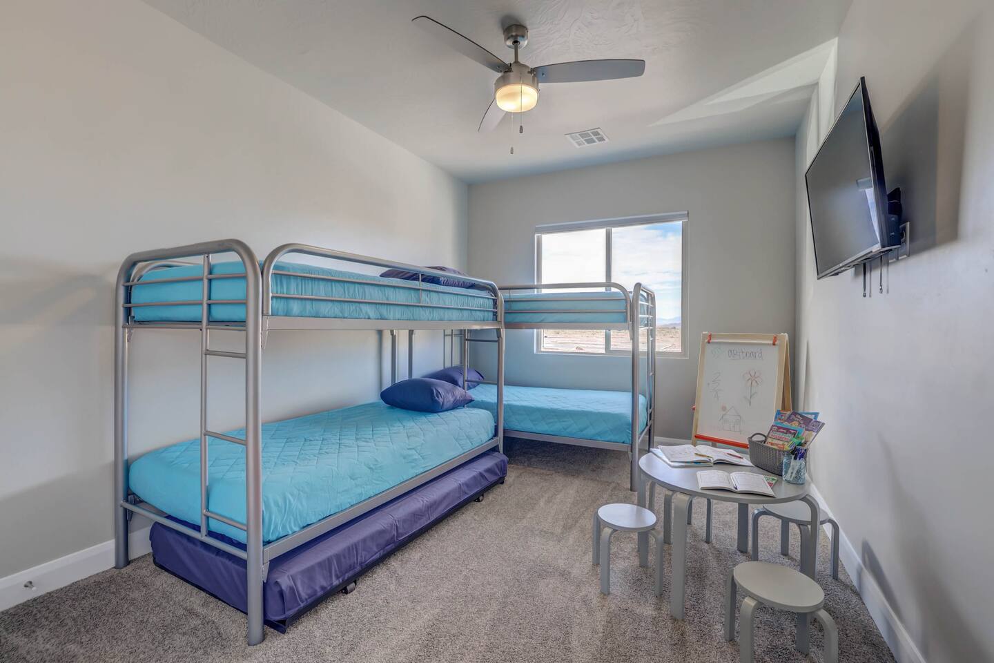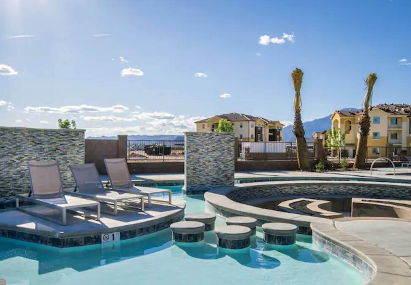 Gather together in the spacious living area on the main level that is perfect for conversation and comfortably seats large groups, complete with 65” Roku Smart TV. The extended dining table seats 10, with additional 4 bar seats at the granite kitchen island. Our gourmet kitchen has oversized cabinets, breakfast bar, top of the line stainless steel appliances, and fully stocked with everything you would need for preparing meals and entertaining a large group. The kids will enjoy the Xbox, art activity books, multiple board and card games located upstairs in the loft/media room or a game of ping pong on the oversized balcony. This amazing home is packed with all sorts of things to do. You'll be making memories with your family and friends as you take the wagon from the garage which is full of pool toys just steps away. Sun bathe poolside, float in the lazy river, or splash around with the kids during the day then relax in the oversized hot tub under the stars. BBQ and dine under the large covered area by the pool, by the fire pit or privately on the back patio at the house. End your day on one of the balconies, with a drink in hand, watching the desert sun set behind the mountains then play Ping Pong on the oversized covered deck. Need to work or kids having online school? No problem, High Speed Internet throughout the home and resort. Home features several working spaces. Our professionally designed, brand new home with private entrance features well-appointed furnishings for comfort and relaxation for families and groups. Enjoy large swimming pool with lazy river, unique lounge spots, hot tub, epic kid splash pad and slide *HEATED & OPEN ALL YEAR* You will also enjoy resort amenities including clubhouse w/ fitness center, pool table, large BBQ grilling area with plenty of seating & fire pits. This amazing home makes for a rejuvenating and fun retreat for multiple families, large groups, and teams. Our 5 bedroom 4.5 bathroom home boasts four master suites and a bunk room. * * * Accommodations * * * SLEEPING CAPACITY: 18 w/12 individual beds MASTER BEDROOM 1: King Bed + Full Bathroom on Main Level (sleeps 2) * Spacious king bed, ceiling fan, flat-screen Roku Smart TV. Includes a large closet, a private patio area outside of the sliding doors to relax in the mornings and evenings. This Master Bedroom has a sitting nook with 2 comfortable chairs perfect for reading or napping and a large bench in front of the TV. Full bathroom with double vanities, large walk-in shower and private toilet area. Stocked with spa toiletries, luxury linens and hair dryer. MASTER BEDROOM 2: King Bed + Full Bathroom (sleeps 2) * Luxurious king bed, ceiling fan, flat-screen Roku Smart TV. Features a large closet, and a private balcony great for watching the sunset in the evenings. Full bathroom with walk-in shower and private toilet area. Stocked with spa toiletries, luxury linens and hair dryer. MASTER BEDROOM 3: King Bed + Full Bathroom (sleeps 2) * Comfortable king bed, ceiling fan, Roku Smart TV, closet for storage space, and access to the Jack-and-Jill shared bathroom. There is a sink and vanity that is private to this room and is stocked with spa toiletries, luxury linens, and hair dryer. MASTER BEDROOM 4: Queen Bed x 2 (sleeps 4) * Two queen-sized beds with balcony. Large bedroom includes ceiling fan, Roku Smart TV, desk and chair, dresser and a full length mirror. Full bathroom in the hall outside the bedroom door stocked with spa toiletries, luxury linens, and hair dryer. BUNK BEDROOM 5: Bunk Beds with Trundle (sleeps 5) * Five bunk beds. Bunk bedroom includes a traditional closet for storage, ceiling fan, Roku Smart TV, art table with activity/coloring supplies and an art board that will entertain kids. ADDITIONAL SLEEPING ACCOMMODATIONS: Queen Inflatable Air Mattress Pack-N-Play Portable Crib * We can accommodate 1 infant in this property. If more than 1 infant, please inquire. UPSTAIRS LOFT/MEDIA ROOM: * Perfect place for the queen inflatable air mattress. Includes 2 chaise loungers, 2 pouf ottomans, and a Roku Smart 55” TV as well as XBOX with unlimited game subscription. Board games and cards as another fun activity for downtime. OVERSIZED COVERED DECK: * Accessed from the loft on the second level. Spacious, extra large 24x20 deck with ping pong table, comfortable large sectional sofa. Perfect place to read, do early morning yoga or meditation, play games, or relax. The deck also is a great place to sleep under the stars on the queen inflatable air mattress. GOURMET KITCHEN: * Large kitchen completely outfitted with new stainless-steel appliances and gorgeous granite countertops. You will be able to cook a Thanksgiving feast in our fully stocked kitchen. You will find everything you will need to prepare meals for a large group (see detailed list at bottom) PATIO: BBQ grill with grill utensils and propane tank provided Hot Tub will be cleaned and running at 102 upon arrival GARAGE: Large 2 Car Parking Ping Pong Table with paddles and balls (Full Size) Wagon + Bucket of Pool Toys Water Softener LAUNDRY ROOM: Washing Machines and Dryers available for your use (one in laundry room and another upstairs in hall) Iron & Ironing Board Laundry Detergent & Dryer Sheets First Aid Kit * Fire Extinguisher 24 Cabana Towels for Hot Tub/Pool in lower cabinets in laundry room on main We know many want to know what exactly is included in a “fully stocked” kitchen. This kitchen will not disappoint. GOURMET EQUIPPED KITCHEN: Coffee Maker Keurig Blender Crockpot Griddle Dishes Glasses: Tall and Short Coffee Cups Wine Glasses Kid Dish Set Silverware Knife Set Spice Rack Mixing Bowls Serving Dishes and Platters Tupperware Pots & Pans Pyrex Dishes Colander Cookie Sheets Cake Pans Measuring Cups and Spoons Mixing Spoons Whisks and Spatulas Large Serving Spoons Vegetable Peeler Pizza Cutter Ice Cream Scoop Can/Wine Opener Outdoor Utensils for BBQ Grill and MORE!!!! St George area dominates as the world's outdoor play p