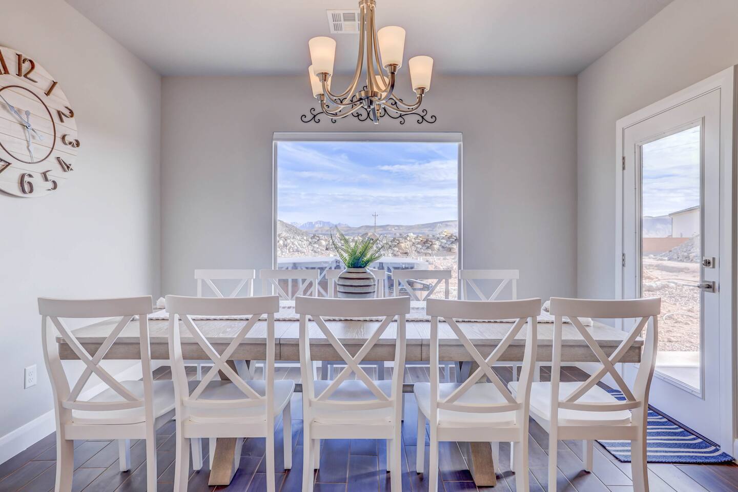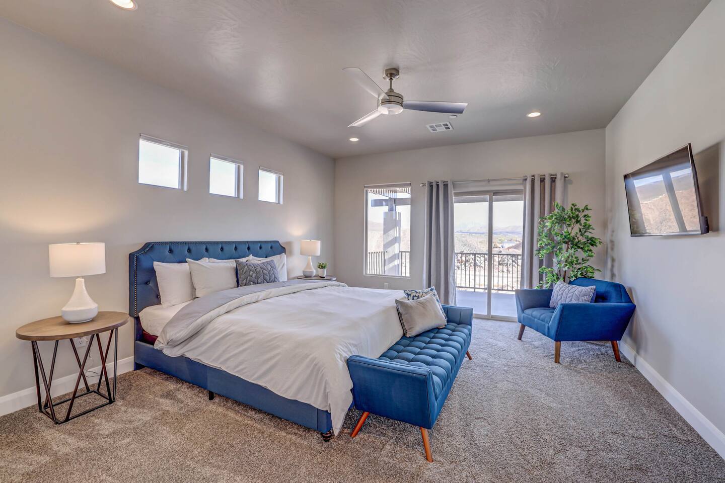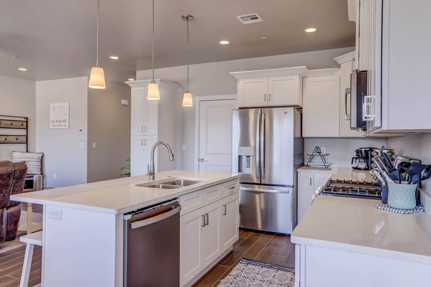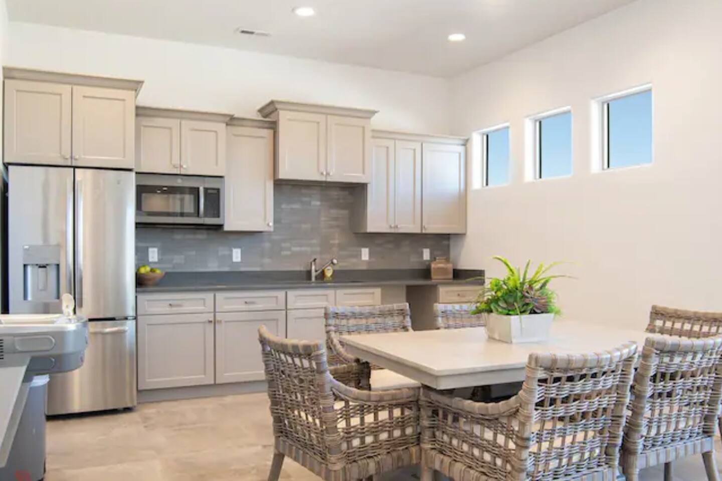 Gather together in the spacious living area on the main level that is perfect for conversation and comfortably seats large groups, complete with 65” Roku Smart TV. The extended dining table seats 10, with additional 4 bar seats at the granite kitchen island. Our gourmet kitchen has oversized cabinets, breakfast bar, top of the line stainless steel appliances, and fully stocked with everything you would need for preparing meals and entertaining a large group. The kids will enjoy the Xbox, art activity books, multiple board and card games located upstairs in the loft/media room or a game of ping pong on the oversized balcony. This amazing home is packed with all sorts of things to do. You'll be making memories with your family and friends as you take the wagon from the garage which is full of pool toys just steps away. Sun bathe poolside, float in the lazy river, or splash around with the kids during the day then relax in the oversized hot tub under the stars. BBQ and dine under the large covered area by the pool, by the fire pit or privately on the back patio at the house. End your day on one of the balconies, with a drink in hand, watching the desert sun set behind the mountains then play Ping Pong on the oversized covered deck. Need to work or kids having online school? No problem, High Speed Internet throughout the home and resort. Home features several working spaces. Our professionally designed, brand new home with private entrance features well-appointed furnishings for comfort and relaxation for families and groups. Enjoy large swimming pool with lazy river, unique lounge spots, hot tub, epic kid splash pad and slide *HEATED & OPEN ALL YEAR* You will also enjoy resort amenities including clubhouse w/ fitness center, pool table, large BBQ grilling area with plenty of seating & fire pits. This amazing home makes for a rejuvenating and fun retreat for multiple families, large groups, and teams. Our 5 bedroom 4.5 bathroom home boasts four master suites and a bunk room. * * * Accommodations * * * SLEEPING CAPACITY: 18 w/12 individual beds MASTER BEDROOM 1: King Bed + Full Bathroom on Main Level (sleeps 2) * Spacious king bed, ceiling fan, flat-screen Roku Smart TV. Includes a large closet, a private patio area outside of the sliding doors to relax in the mornings and evenings. This Master Bedroom has a sitting nook with 2 comfortable chairs perfect for reading or napping and a large bench in front of the TV. Full bathroom with double vanities, large walk-in shower and private toilet area. Stocked with spa toiletries, luxury linens and hair dryer. MASTER BEDROOM 2: King Bed + Full Bathroom (sleeps 2) * Luxurious king bed, ceiling fan, flat-screen Roku Smart TV. Features a large closet, and a private balcony great for watching the sunset in the evenings. Full bathroom with walk-in shower and private toilet area. Stocked with spa toiletries, luxury linens and hair dryer. MASTER BEDROOM 3: King Bed + Full Bathroom (sleeps 2) * Comfortable king bed, ceiling fan, Roku Smart TV, closet for storage space, and access to the Jack-and-Jill shared bathroom. There is a sink and vanity that is private to this room and is stocked with spa toiletries, luxury linens, and hair dryer. MASTER BEDROOM 4: Queen Bed x 2 (sleeps 4) * Two queen-sized beds with balcony. Large bedroom includes ceiling fan, Roku Smart TV, desk and chair, dresser and a full length mirror. Full bathroom in the hall outside the bedroom door stocked with spa toiletries, luxury linens, and hair dryer. BUNK BEDROOM 5: Bunk Beds with Trundle (sleeps 5) * Five bunk beds. Bunk bedroom includes a traditional closet for storage, ceiling fan, Roku Smart TV, art table with activity/coloring supplies and an art board that will entertain kids. ADDITIONAL SLEEPING ACCOMMODATIONS: Queen Inflatable Air Mattress Pack-N-Play Portable Crib * We can accommodate 1 infant in this property. If more than 1 infant, please inquire. UPSTAIRS LOFT/MEDIA ROOM: * Perfect place for the queen inflatable air mattress. Includes 2 chaise loungers, 2 pouf ottomans, and a Roku Smart 55” TV as well as XBOX with unlimited game subscription. Board games and cards as another fun activity for downtime. OVERSIZED COVERED DECK: * Accessed from the loft on the second level. Spacious, extra large 24x20 deck with ping pong table, comfortable large sectional sofa. Perfect place to read, do early morning yoga or meditation, play games, or relax. The deck also is a great place to sleep under the stars on the queen inflatable air mattress. GOURMET KITCHEN: * Large kitchen completely outfitted with new stainless-steel appliances and gorgeous granite countertops. You will be able to cook a Thanksgiving feast in our fully stocked kitchen. You will find everything you will need to prepare meals for a large group (see detailed list at bottom) PATIO: BBQ grill with grill utensils and propane tank provided Hot Tub will be cleaned and running at 102 upon arrival GARAGE: Large 2 Car Parking Ping Pong Table with paddles and balls (Full Size) Wagon + Bucket of Pool Toys Water Softener LAUNDRY ROOM: Washing Machines and Dryers available for your use (one in laundry room and another upstairs in hall) Iron & Ironing Board Laundry Detergent & Dryer Sheets First Aid Kit * Fire Extinguisher 24 Cabana Towels for Hot Tub/Pool in lower cabinets in laundry room on main We know many want to know what exactly is included in a “fully stocked” kitchen. This kitchen will not disappoint. GOURMET EQUIPPED KITCHEN: Coffee Maker Keurig Blender Crockpot Griddle Dishes Glasses: Tall and Short Coffee Cups Wine Glasses Kid Dish Set Silverware Knife Set Spice Rack Mixing Bowls Serving Dishes and Platters Tupperware Pots & Pans Pyrex Dishes Colander Cookie Sheets Cake Pans Measuring Cups and Spoons Mixing Spoons Whisks and Spatulas Large Serving Spoons Vegetable Peeler Pizza Cutter Ice Cream Scoop Can/Wine Opener Outdoor Utensils for BBQ Grill and MORE!!!! St George area dominates as the world's outdoor play p