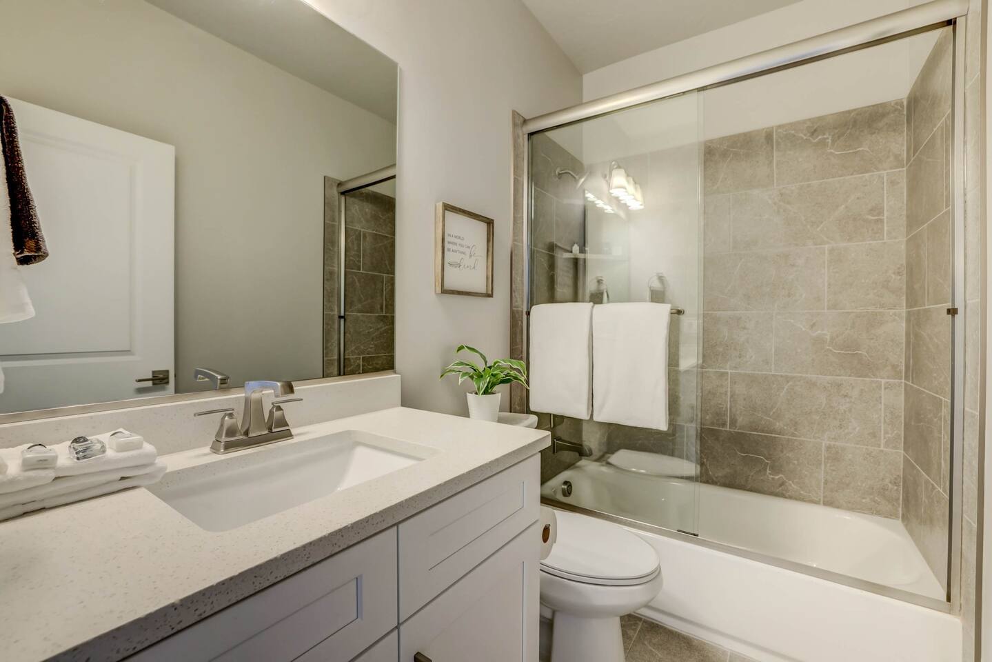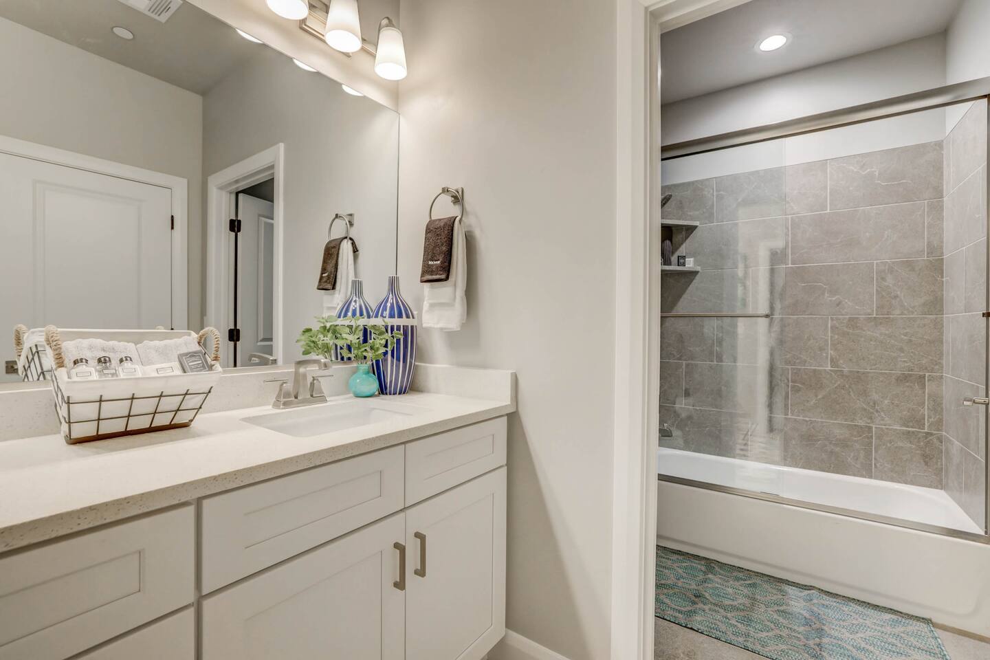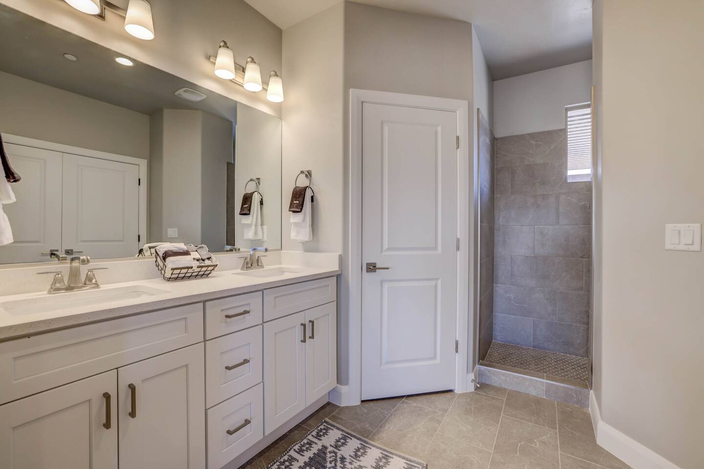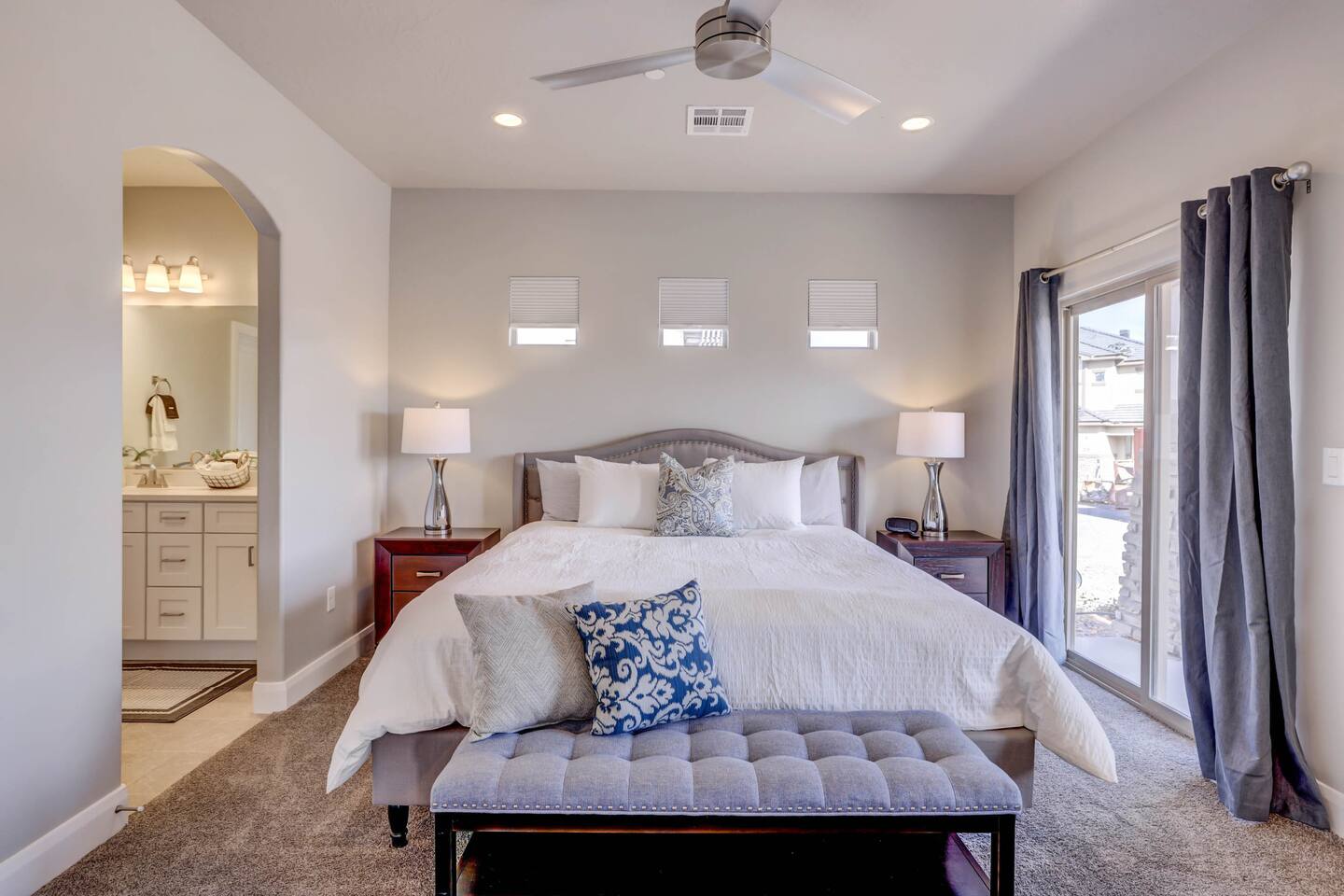 Gather together in the spacious living area on the main level that is perfect for conversation and comfortably seats large groups, complete with 65” Roku Smart TV. The extended dining table seats 10, with additional 4 bar seats at the granite kitchen island. Our gourmet kitchen has oversized cabinets, breakfast bar, top of the line stainless steel appliances, and fully stocked with everything you would need for preparing meals and entertaining a large group. The kids will enjoy the Xbox, art activity books, multiple board and card games located upstairs in the loft/media room or a game of ping pong on the oversized balcony. This amazing home is packed with all sorts of things to do. You'll be making memories with your family and friends as you take the wagon from the garage which is full of pool toys just steps away. Sun bathe poolside, float in the lazy river, or splash around with the kids during the day then relax in the oversized hot tub under the stars. BBQ and dine under the large covered area by the pool, by the fire pit or privately on the back patio at the house. End your day on one of the balconies, with a drink in hand, watching the desert sun set behind the mountains then play Ping Pong on the oversized covered deck. Need to work or kids having online school? No problem, High Speed Internet throughout the home and resort. Home features several working spaces. Our professionally designed, brand new home with private entrance features well-appointed furnishings for comfort and relaxation for families and groups. Enjoy large swimming pool with lazy river, unique lounge spots, hot tub, epic kid splash pad and slide *HEATED & OPEN ALL YEAR* You will also enjoy resort amenities including clubhouse w/ fitness center, pool table, large BBQ grilling area with plenty of seating & fire pits. This amazing home makes for a rejuvenating and fun retreat for multiple families, large groups, and teams. Our 5 bedroom 4.5 bathroom home boasts four master suites and a bunk room. * * * Accommodations * * * SLEEPING CAPACITY: 18 w/12 individual beds MASTER BEDROOM 1: King Bed + Full Bathroom on Main Level (sleeps 2) * Spacious king bed, ceiling fan, flat-screen Roku Smart TV. Includes a large closet, a private patio area outside of the sliding doors to relax in the mornings and evenings. This Master Bedroom has a sitting nook with 2 comfortable chairs perfect for reading or napping and a large bench in front of the TV. Full bathroom with double vanities, large walk-in shower and private toilet area. Stocked with spa toiletries, luxury linens and hair dryer. MASTER BEDROOM 2: King Bed + Full Bathroom (sleeps 2) * Luxurious king bed, ceiling fan, flat-screen Roku Smart TV. Features a large closet, and a private balcony great for watching the sunset in the evenings. Full bathroom with walk-in shower and private toilet area. Stocked with spa toiletries, luxury linens and hair dryer. MASTER BEDROOM 3: King Bed + Full Bathroom (sleeps 2) * Comfortable king bed, ceiling fan, Roku Smart TV, closet for storage space, and access to the Jack-and-Jill shared bathroom. There is a sink and vanity that is private to this room and is stocked with spa toiletries, luxury linens, and hair dryer. MASTER BEDROOM 4: Queen Bed x 2 (sleeps 4) * Two queen-sized beds with balcony. Large bedroom includes ceiling fan, Roku Smart TV, desk and chair, dresser and a full length mirror. Full bathroom in the hall outside the bedroom door stocked with spa toiletries, luxury linens, and hair dryer. BUNK BEDROOM 5: Bunk Beds with Trundle (sleeps 5) * Five bunk beds. Bunk bedroom includes a traditional closet for storage, ceiling fan, Roku Smart TV, art table with activity/coloring supplies and an art board that will entertain kids. ADDITIONAL SLEEPING ACCOMMODATIONS: Queen Inflatable Air Mattress Pack-N-Play Portable Crib * We can accommodate 1 infant in this property. If more than 1 infant, please inquire. UPSTAIRS LOFT/MEDIA ROOM: * Perfect place for the queen inflatable air mattress. Includes 2 chaise loungers, 2 pouf ottomans, and a Roku Smart 55” TV as well as XBOX with unlimited game subscription. Board games and cards as another fun activity for downtime. OVERSIZED COVERED DECK: * Accessed from the loft on the second level. Spacious, extra large 24x20 deck with ping pong table, comfortable large sectional sofa. Perfect place to read, do early morning yoga or meditation, play games, or relax. The deck also is a great place to sleep under the stars on the queen inflatable air mattress. GOURMET KITCHEN: * Large kitchen completely outfitted with new stainless-steel appliances and gorgeous granite countertops. You will be able to cook a Thanksgiving feast in our fully stocked kitchen. You will find everything you will need to prepare meals for a large group (see detailed list at bottom) PATIO: BBQ grill with grill utensils and propane tank provided Hot Tub will be cleaned and running at 102 upon arrival GARAGE: Large 2 Car Parking Ping Pong Table with paddles and balls (Full Size) Wagon + Bucket of Pool Toys Water Softener LAUNDRY ROOM: Washing Machines and Dryers available for your use (one in laundry room and another upstairs in hall) Iron & Ironing Board Laundry Detergent & Dryer Sheets First Aid Kit * Fire Extinguisher 24 Cabana Towels for Hot Tub/Pool in lower cabinets in laundry room on main We know many want to know what exactly is included in a “fully stocked” kitchen. This kitchen will not disappoint. GOURMET EQUIPPED KITCHEN: Coffee Maker Keurig Blender Crockpot Griddle Dishes Glasses: Tall and Short Coffee Cups Wine Glasses Kid Dish Set Silverware Knife Set Spice Rack Mixing Bowls Serving Dishes and Platters Tupperware Pots & Pans Pyrex Dishes Colander Cookie Sheets Cake Pans Measuring Cups and Spoons Mixing Spoons Whisks and Spatulas Large Serving Spoons Vegetable Peeler Pizza Cutter Ice Cream Scoop Can/Wine Opener Outdoor Utensils for BBQ Grill and MORE!!!! St George area dominates as the world's outdoor play p