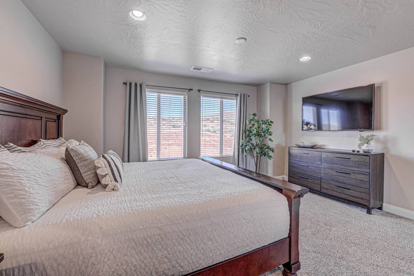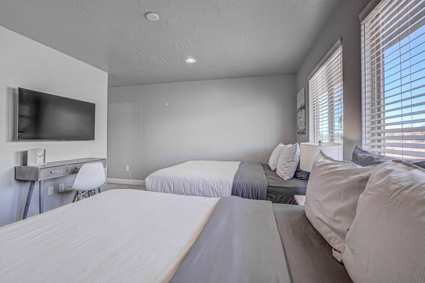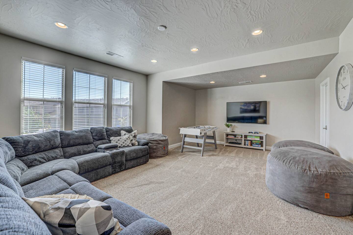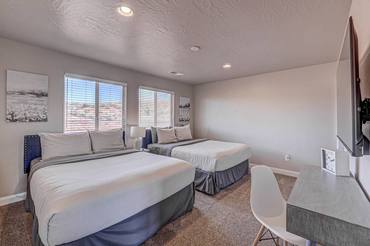 Our home is spotless, modern with superior furnishings throughout making this the perfect home for families and large groups for your upcoming getaway to Southern Utah. Our goal is to exceed your vacation experience in every way and cleanliness is our top priority. To make it easy, we provide you with detailed PreStay information to help plan your trip, keyless entry with Self Check-In and offer personal assistance at any time. We are available 24/7 so do not hesitate to reach out with any questions - We are always happy to help! * SLEEPING ACCOMMODATIONS * Master 1: King (sleeps 2) Main level Master 2: Queen (sleeps 2) Main level Master 3: King (sleeps 2) Upstairs Bedroom 4: Queen x 2 (sleeps 4) Upstairs Other: Queen Inflatable Air Mattress (sleeps 2) Full Mattress Bean Bag Convertible x 3 (sleeps 3) Pack N Play Crib (sleeps 1 infant) * We can accommodate 1 infant in this property. If more than 1 infant, please inquire. Total Sleeping Capacity: 16 Total Beds: 5 + 3 additional options * 4 FULL BATHROOMS * Two bathrooms on main level and 2 additional full bathrooms upstairs We provide Shampoo, Conditioner, Soap, Hair dryer, and Towels (Pool Towels too!) * FEATURES * Fast WiFi Ping Pong Table Foosball Table xBox w/Unlimited Gaming Subscription 5 Roku TVs, DVD player + Movies, Board games, Cards and Books! Fully Stocked Kitchen w/New Appliances 2 Desks in quiet areas for Work/School Washer + Dryer BBQ Grill w/Propane Covered Patio w/comfortable seating w/beautiful views Oversized 2 Car Garage Free RV/Trailer Parking Walking paths and Park Community Heated Swimming Pool + Hot Tub * PARKING * Oversized Garage (2 vehicles) Driveway (2 vehicles) Free additional parking throughout community for RV/Trailers on a first come - first serve basis * FULLY STOCKED KITCHEN * Drip Coffee Maker + Keurig Blender Crockpot Griddle Dishes Glasses Coffee Cups Wine Glasses Kid Dish Set Silverware Knife Set Mixing Bowls Serving Dishes + Platter Tupperware Pots + Pans Pyrex Dishes Colander Cookie Sheets Cake Pans Measuring Cups + Spoons Mixing + Serving Spoons Whisks + Spatulas Vegetable Peeler Pizza Cutter Ice Cream Scoop Can/Wine Opener Outdoor Utensils for BBQ Grill Cooking Spray/Oil Spices Aluminum Foil Ziplocks and MORE!!!! Please contact us with any questions - We are always happy to help! *** We have additional properties in Southern Utah that are new with open calendars and would love to host your group. * READ our reviews to hear from thousands of previous guests and their experience with us and why we are the best choice for your Southern Utah Vacation Rental.