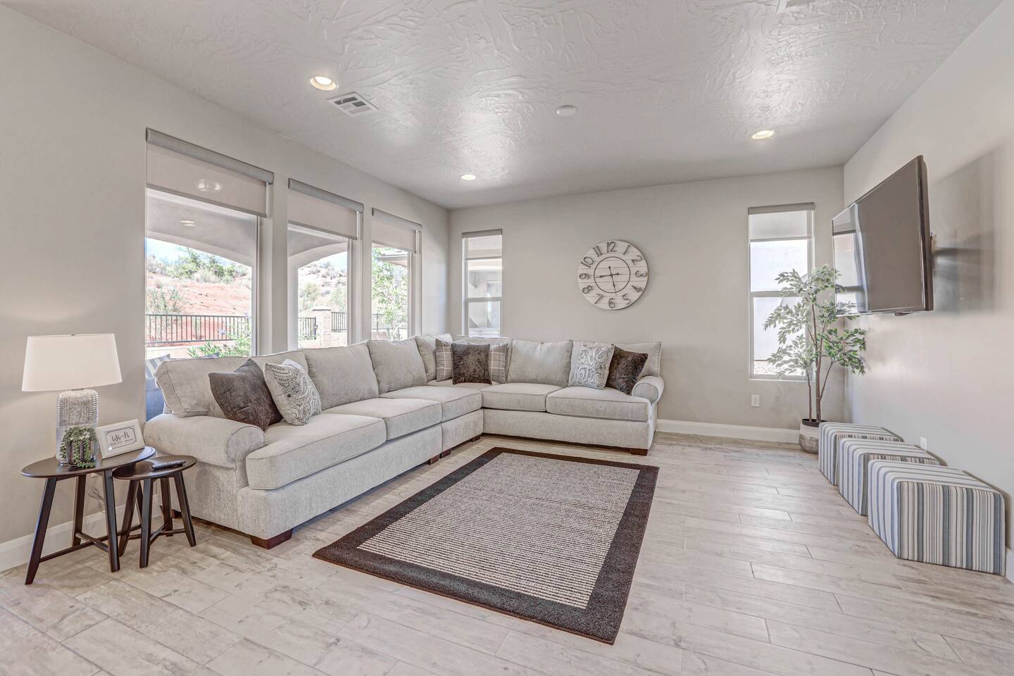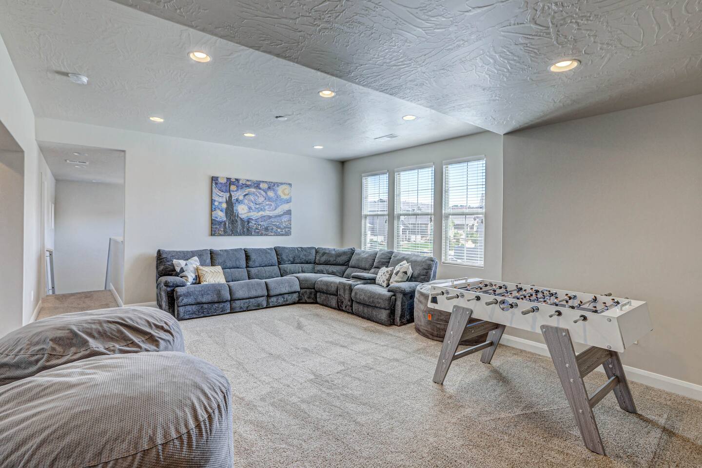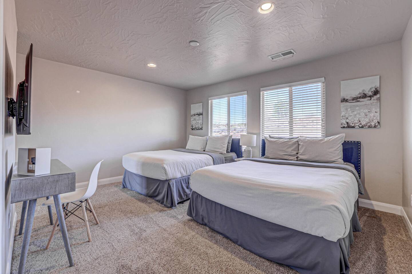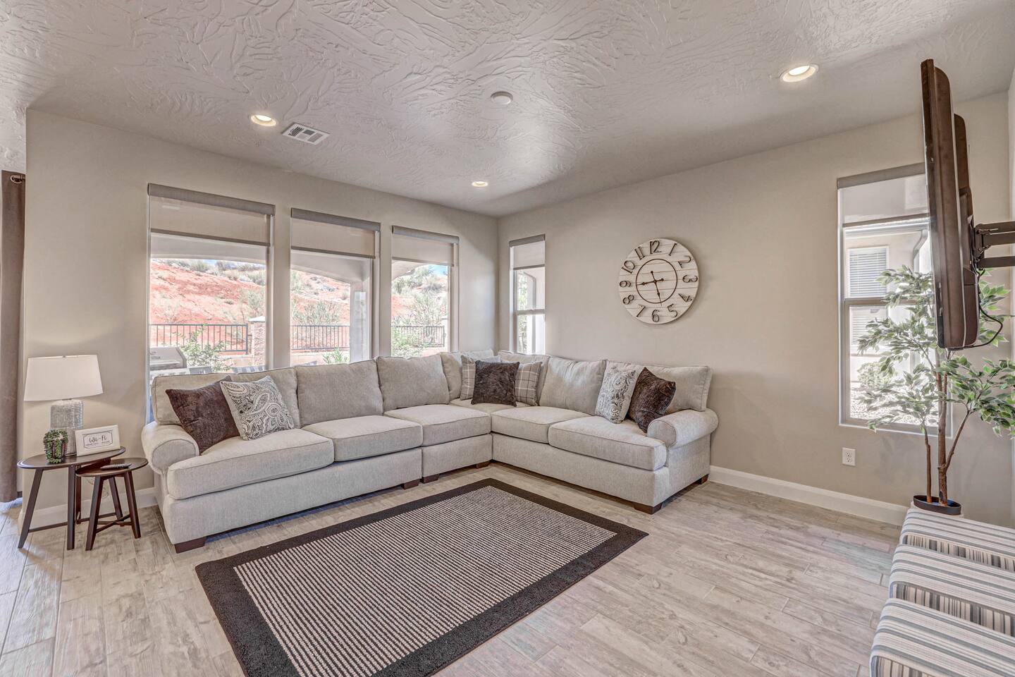 Our home is spotless, modern with superior furnishings throughout making this the perfect home for families and large groups for your upcoming getaway to Southern Utah. Our goal is to exceed your vacation experience in every way and cleanliness is our top priority. To make it easy, we provide you with detailed PreStay information to help plan your trip, keyless entry with Self Check-In and offer personal assistance at any time. We are available 24/7 so do not hesitate to reach out with any questions - We are always happy to help! * SLEEPING ACCOMMODATIONS * Master 1: King (sleeps 2) Main level Master 2: Queen (sleeps 2) Main level Master 3: King (sleeps 2) Upstairs Bedroom 4: Queen x 2 (sleeps 4) Upstairs Other: Queen Inflatable Air Mattress (sleeps 2) Full Mattress Bean Bag Convertible x 3 (sleeps 3) Pack N Play Crib (sleeps 1 infant) * We can accommodate 1 infant in this property. If more than 1 infant, please inquire. Total Sleeping Capacity: 16 Total Beds: 5 + 3 additional options * 4 FULL BATHROOMS * Two bathrooms on main level and 2 additional full bathrooms upstairs We provide Shampoo, Conditioner, Soap, Hair dryer, and Towels (Pool Towels too!) * FEATURES * Fast WiFi Ping Pong Table Foosball Table xBox w/Unlimited Gaming Subscription 5 Roku TVs, DVD player + Movies, Board games, Cards and Books! Fully Stocked Kitchen w/New Appliances 2 Desks in quiet areas for Work/School Washer + Dryer BBQ Grill w/Propane Covered Patio w/comfortable seating w/beautiful views Oversized 2 Car Garage Free RV/Trailer Parking Walking paths and Park Community Heated Swimming Pool + Hot Tub * PARKING * Oversized Garage (2 vehicles) Driveway (2 vehicles) Free additional parking throughout community for RV/Trailers on a first come - first serve basis * FULLY STOCKED KITCHEN * Drip Coffee Maker + Keurig Blender Crockpot Griddle Dishes Glasses Coffee Cups Wine Glasses Kid Dish Set Silverware Knife Set Mixing Bowls Serving Dishes + Platter Tupperware Pots + Pans Pyrex Dishes Colander Cookie Sheets Cake Pans Measuring Cups + Spoons Mixing + Serving Spoons Whisks + Spatulas Vegetable Peeler Pizza Cutter Ice Cream Scoop Can/Wine Opener Outdoor Utensils for BBQ Grill Cooking Spray/Oil Spices Aluminum Foil Ziplocks and MORE!!!! Please contact us with any questions - We are always happy to help! *** We have additional properties in Southern Utah that are new with open calendars and would love to host your group. * READ our reviews to hear from thousands of previous guests and their experience with us and why we are the best choice for your Southern Utah Vacation Rental.