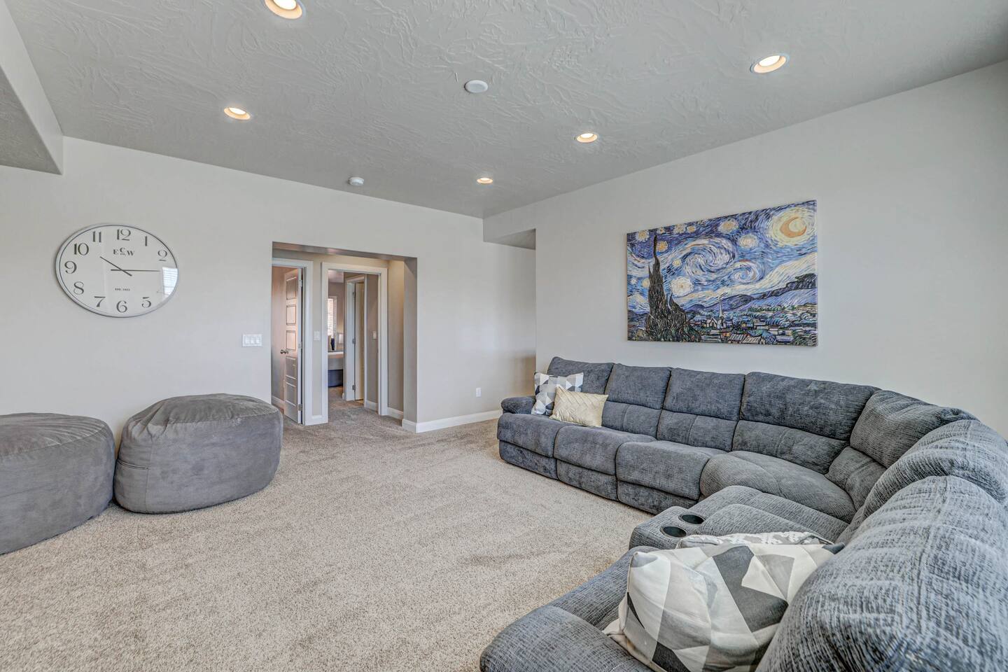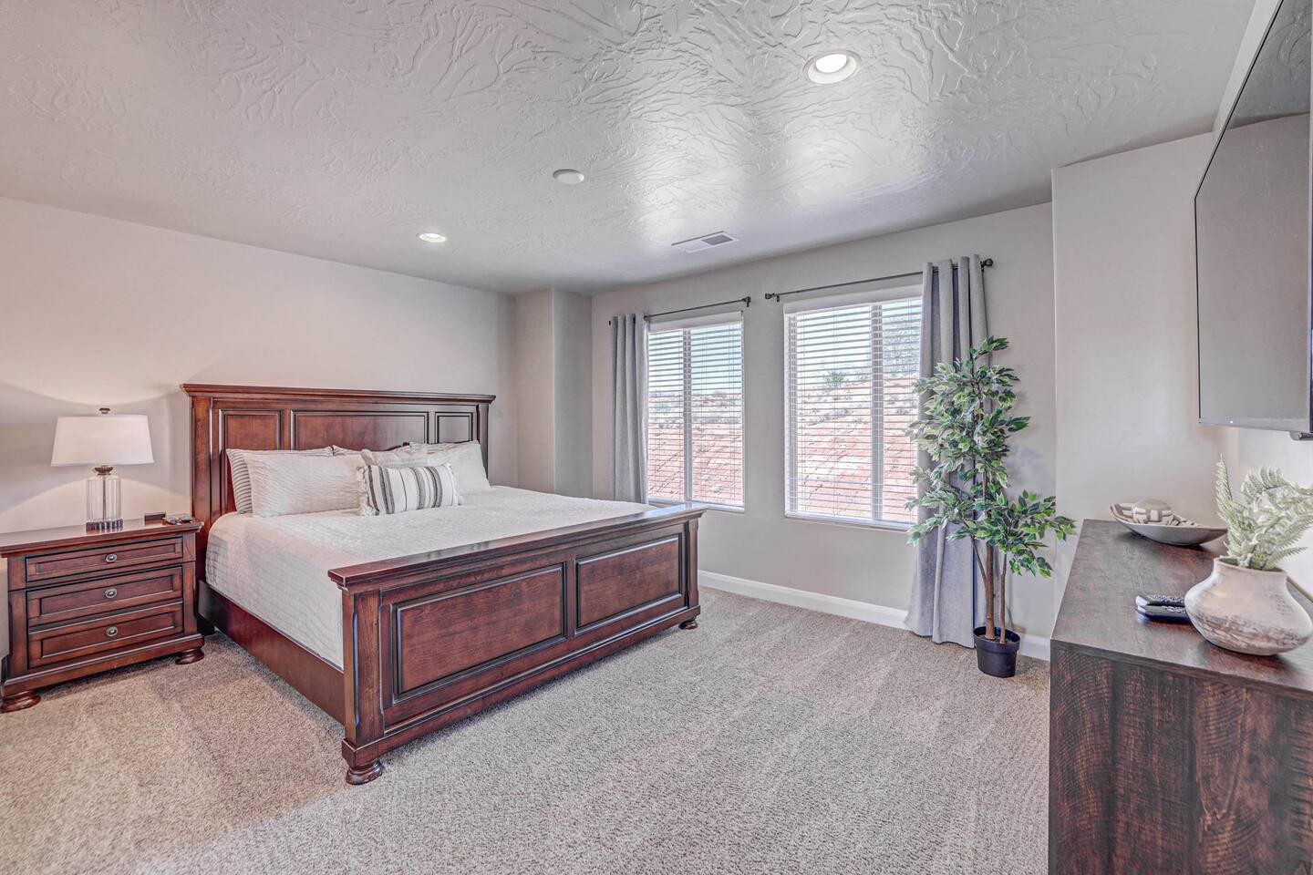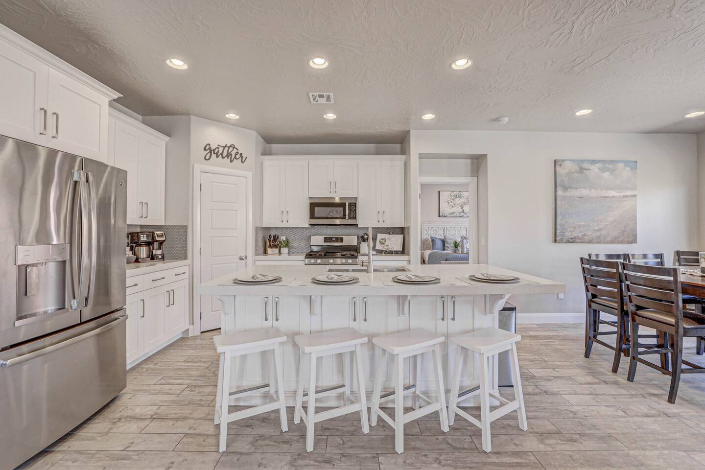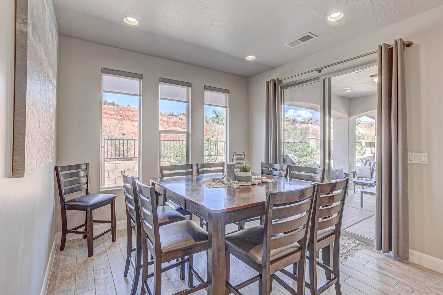 Our home is spotless, modern with superior furnishings throughout making this the perfect home for families and large groups for your upcoming getaway to Southern Utah. Our goal is to exceed your vacation experience in every way and cleanliness is our top priority. To make it easy, we provide you with detailed PreStay information to help plan your trip, keyless entry with Self Check-In and offer personal assistance at any time. We are available 24/7 so do not hesitate to reach out with any questions - We are always happy to help! * SLEEPING ACCOMMODATIONS * Master 1: King (sleeps 2) Main level Master 2: Queen (sleeps 2) Main level Master 3: King (sleeps 2) Upstairs Bedroom 4: Queen x 2 (sleeps 4) Upstairs Other: Queen Inflatable Air Mattress (sleeps 2) Full Mattress Bean Bag Convertible x 3 (sleeps 3) Pack N Play Crib (sleeps 1 infant) * We can accommodate 1 infant in this property. If more than 1 infant, please inquire. Total Sleeping Capacity: 16 Total Beds: 5 + 3 additional options * 4 FULL BATHROOMS * Two bathrooms on main level and 2 additional full bathrooms upstairs We provide Shampoo, Conditioner, Soap, Hair dryer, and Towels (Pool Towels too!) * FEATURES * Fast WiFi Ping Pong Table Foosball Table xBox w/Unlimited Gaming Subscription 5 Roku TVs, DVD player + Movies, Board games, Cards and Books! Fully Stocked Kitchen w/New Appliances 2 Desks in quiet areas for Work/School Washer + Dryer BBQ Grill w/Propane Covered Patio w/comfortable seating w/beautiful views Oversized 2 Car Garage Free RV/Trailer Parking Walking paths and Park Community Heated Swimming Pool + Hot Tub * PARKING * Oversized Garage (2 vehicles) Driveway (2 vehicles) Free additional parking throughout community for RV/Trailers on a first come - first serve basis * FULLY STOCKED KITCHEN * Drip Coffee Maker + Keurig Blender Crockpot Griddle Dishes Glasses Coffee Cups Wine Glasses Kid Dish Set Silverware Knife Set Mixing Bowls Serving Dishes + Platter Tupperware Pots + Pans Pyrex Dishes Colander Cookie Sheets Cake Pans Measuring Cups + Spoons Mixing + Serving Spoons Whisks + Spatulas Vegetable Peeler Pizza Cutter Ice Cream Scoop Can/Wine Opener Outdoor Utensils for BBQ Grill Cooking Spray/Oil Spices Aluminum Foil Ziplocks and MORE!!!! Please contact us with any questions - We are always happy to help! *** We have additional properties in Southern Utah that are new with open calendars and would love to host your group. * READ our reviews to hear from thousands of previous guests and their experience with us and why we are the best choice for your Southern Utah Vacation Rental.