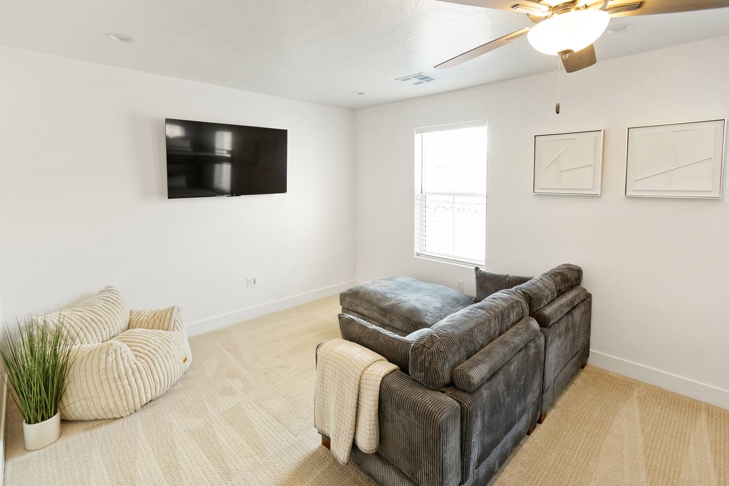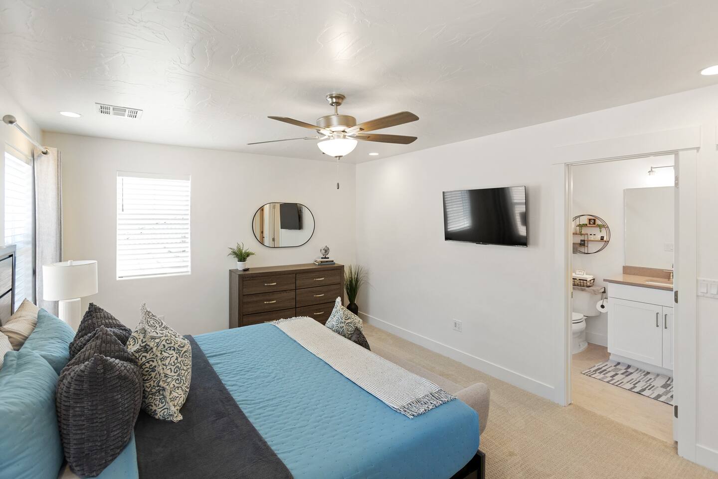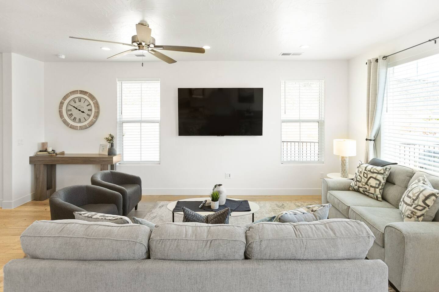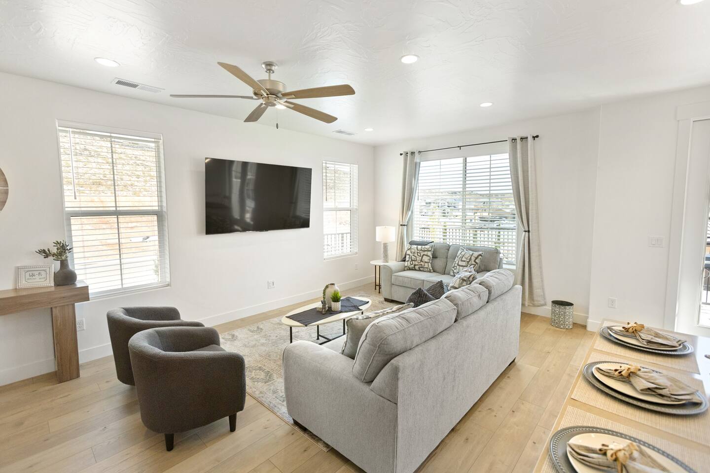Experience the best of Southern Utah from the comfort of this BRAND NEW 2200 square foot home boasting 3 bedrooms and 3.5 bathrooms accommodating up to 10 guests. Perfectly located to National + State Parks, shopping, restaurants, golfing, pickle ball, miles of hiking and biking trails. Our home is spotless, modern with superior furnishings throughout making this the perfect home for your upcoming getaway to Southern Utah. Our goal is to exceed your vacation experience in every way and cleanliness is our top priority. To make it easy, we offer Self Check-In with keyless entry and offer personal assistance at any time. * SLEEPING ACCOMMODATIONS * Master Main Level: KING (sleeps 2) Master Upstairs: KING (sleeps 2) Bedroom 3 Upstairs : Queen x 4 (sleeps up to 8) * Also provided is a Pack N Play Crib (sleeps 1 infant) * BATHROOMS - 3 + 1/2 * Bath 1: Master Main Level Ensuite w/Walk-In Shower Bath 2: Master Upstairs Ensuite w/Walk-In Shower Bath 3: Bedroom 3 Upstairs Ensuite w/Shower+Tub Combo Bath 4: Half bath off entry on main level * FEATURES * Fast WiFi Smart Roku TVs in every room Premium Mattresses with Luxury Bedding Fully Stocked Kitchen w/New Appliances Desk for Work/School Oversized Garage w/EV charger BBQ Grill w/Propane Washer and Dryer w/Laundry Supplies * PARKING * Oversized Garage w/EV Charger Additional Spaces on side of home RV/Trailer Parking across the street * PRIVATE COMMUNITY AMENITIES * Heated Pool Open All Year (10am-10pm) Large Hot Tub (10am - 10pm) Pickle Ball Courts (6am - 10pm)