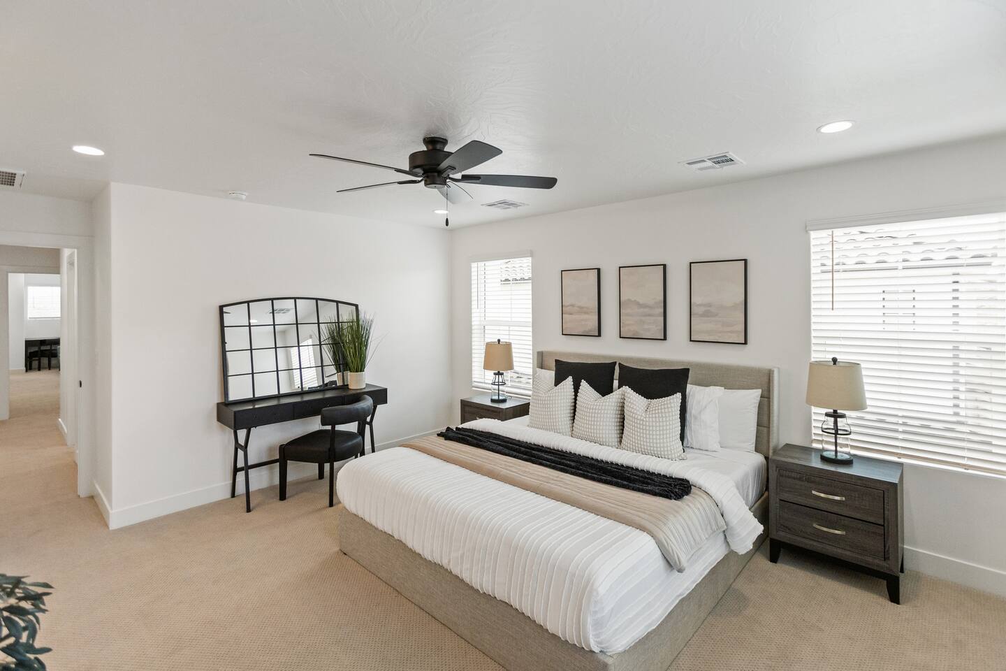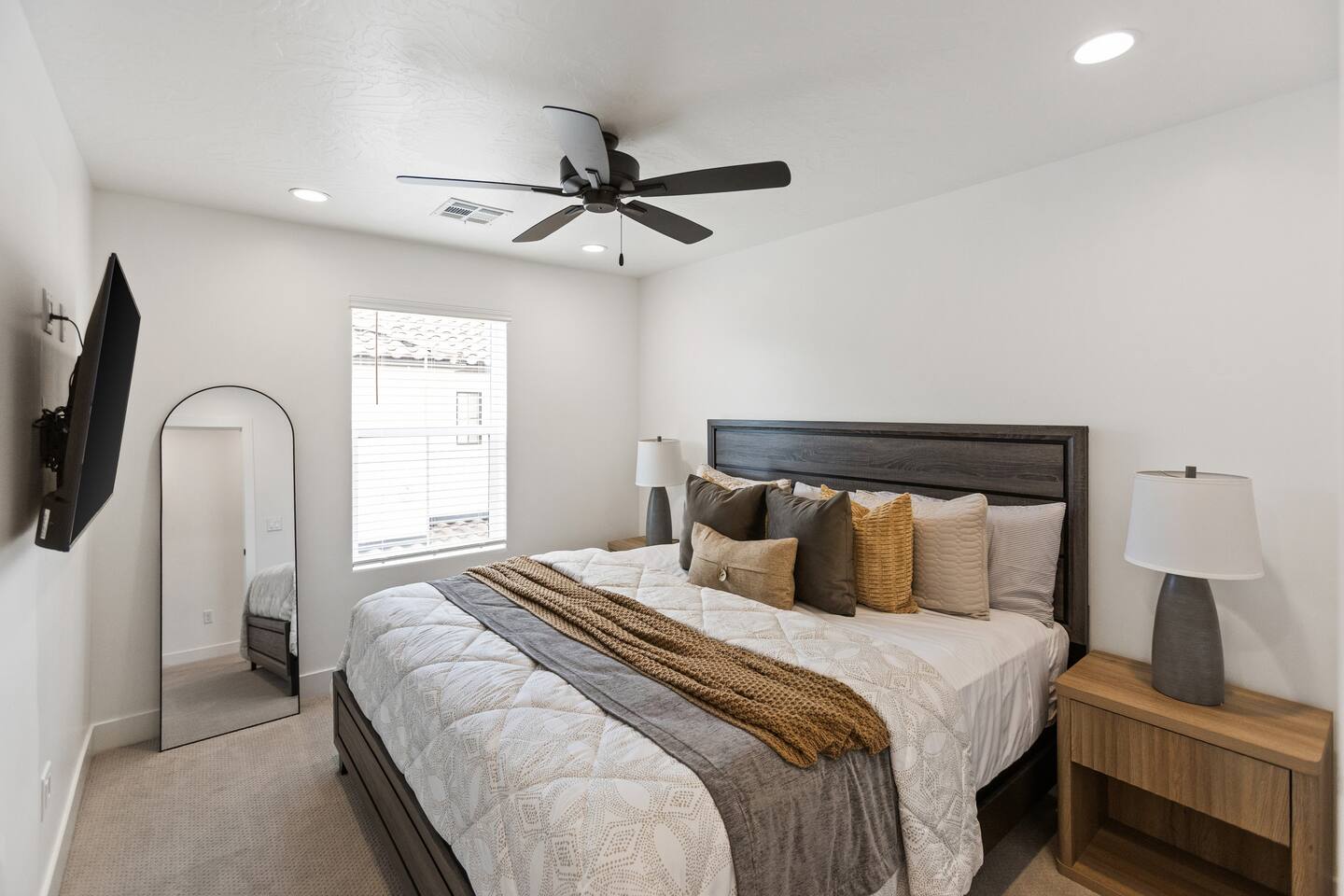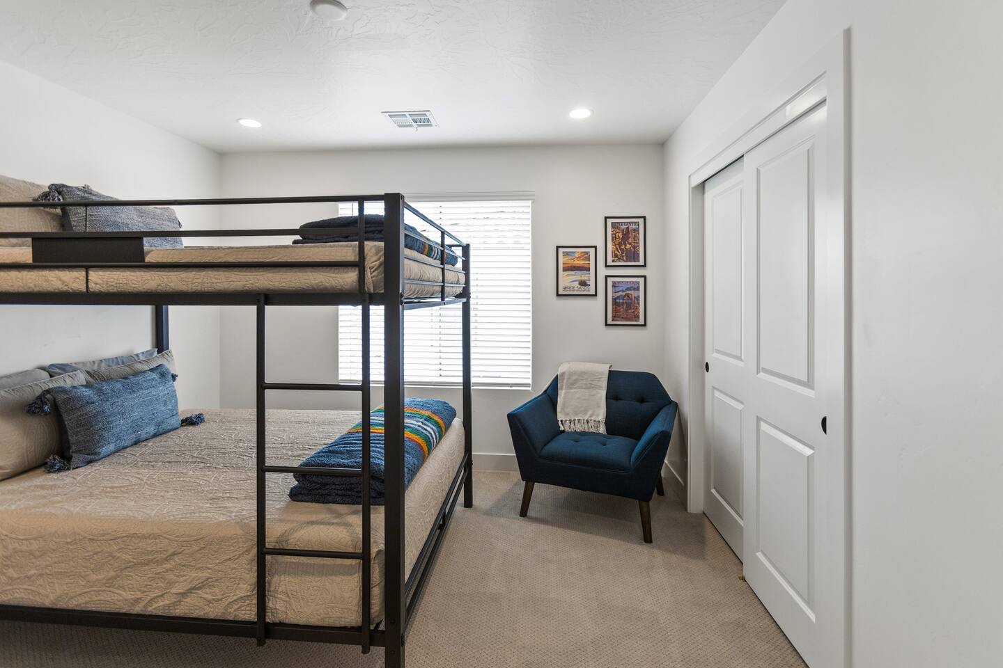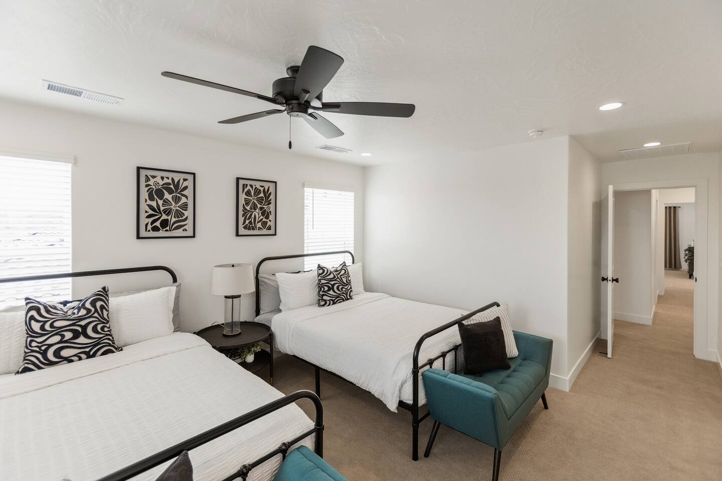 Our home is spotless, modern with superior furnishings throughout making this the perfect home for your upcoming getaway to Southern Utah. Our goal is to exceed your vacation experience in every way and cleanliness is our top priority. To make it easy, we provide you with excellent communication, keyless entry with Self Check-In and offer personal assistance at any time during your stay. We are available 24/7 so do not hesitate to reach out with any questions - We are always happy to help! * SLEEPING ACCOMMODATIONS * Master 1: King (sleeps 2) Master 2: Queen x 2 (sleeps 4) Master 3: King (sleeps 2) Bedroom 4: Queen x 2 Bunk Beds (sleeps 4) Other: Pack N Play Crib (sleeps 1 infant) * We can accommodate 1 infant in this property. If more than 1 infant, please inquire. * BATHROOMS * Bath 1: 1/2 bath off entry (main level) Bath 2: Master 1 Ensuite w/Walk-In Shower Bath 3: Master 2 Ensuite w/Walk-In Shower Bath 4: Between Master 3 and Bunk Room w/Shower & Tub Combo * FEATURES * Fast WiFi Smart Roku TVs Oversized Garage w/EV charger Premium Mattresses with Luxury Bedding Washer + Dryer w/Laundry Supplies Fully Stocked Kitchen w/New Appliances Desk for Work/School BBQ Grill w/Propane Pickle ball Courts w/Equipment Provided RV/Trailer Parking * PARKING * 2-Car Garage w/EV Charger RV/Trailer Parking throughout community Additional parking spaces available on first come - first serve basis * STOCKED KITCHEN * Coffee Maker/Keurig Blender Crockpot Griddle Dishes Glasses Coffee Cups Wine Glasses Kid Dish Set Silverware Knife Set Mixing Bowls Serving Dish and Platter Tupperware Pots & Pans Pyrex Dishes Colander Cookie Sheet Cake Pan Measuring Cups and Spoons Mixing Spoons Whisks and Spatulas Large Serving Spoons Vegetable Peeler Pizza Cutter Ice Cream Scoop Can/Wine Opener Outdoor Utensils for BBQ Grill and MORE!!!! Experience the best of Southern Utah from the comfort of this NEW 2200 square foot home boasting 4 bedrooms and 3.5 bathrooms. Perfectly located close to National + State Parks, shopping, restaurants, golfing, pickle ball, miles of hiking and biking trails. Book Today and Save with Discounted Rates!