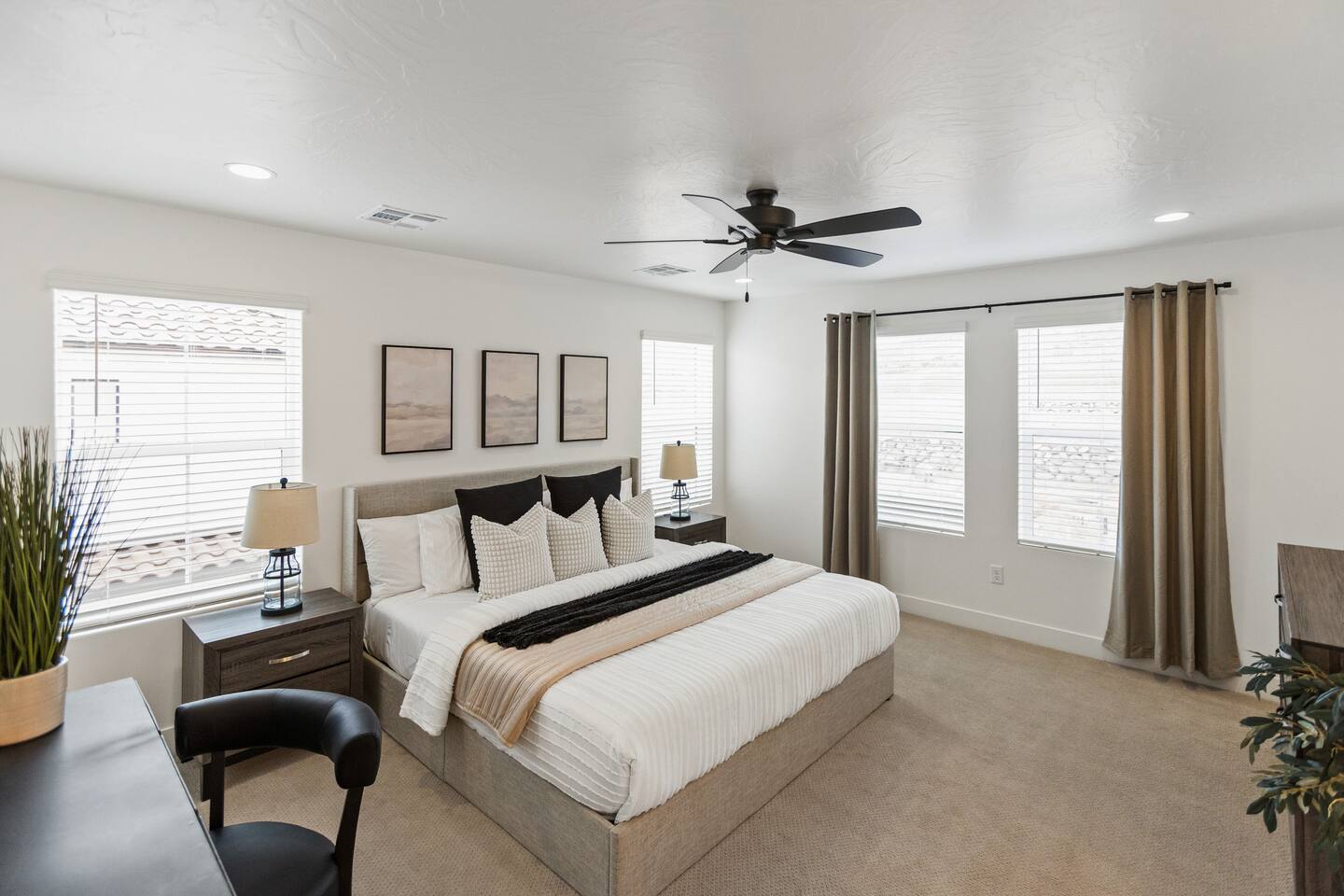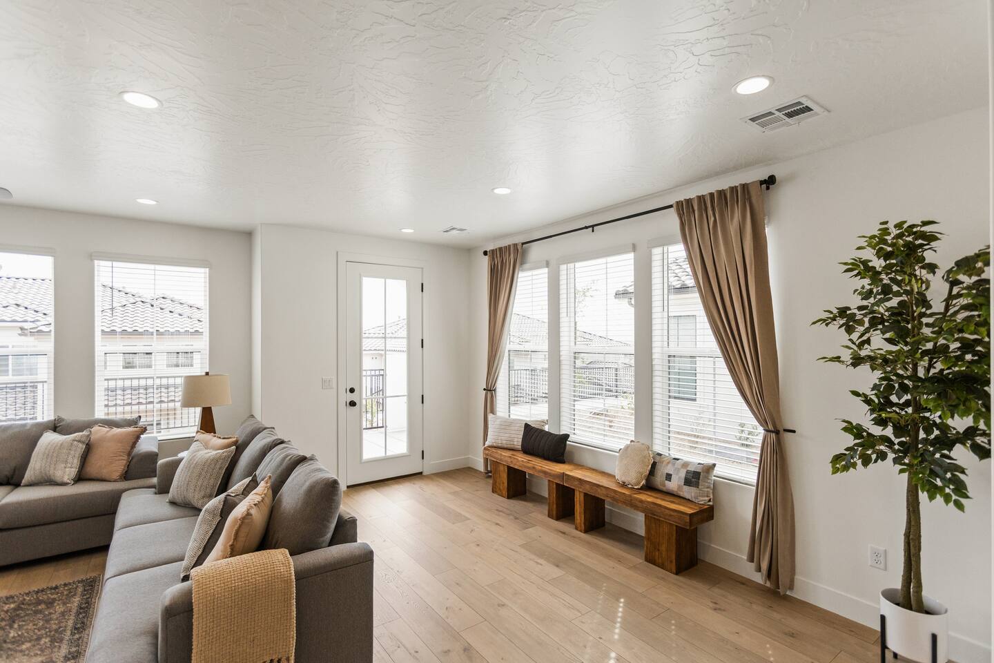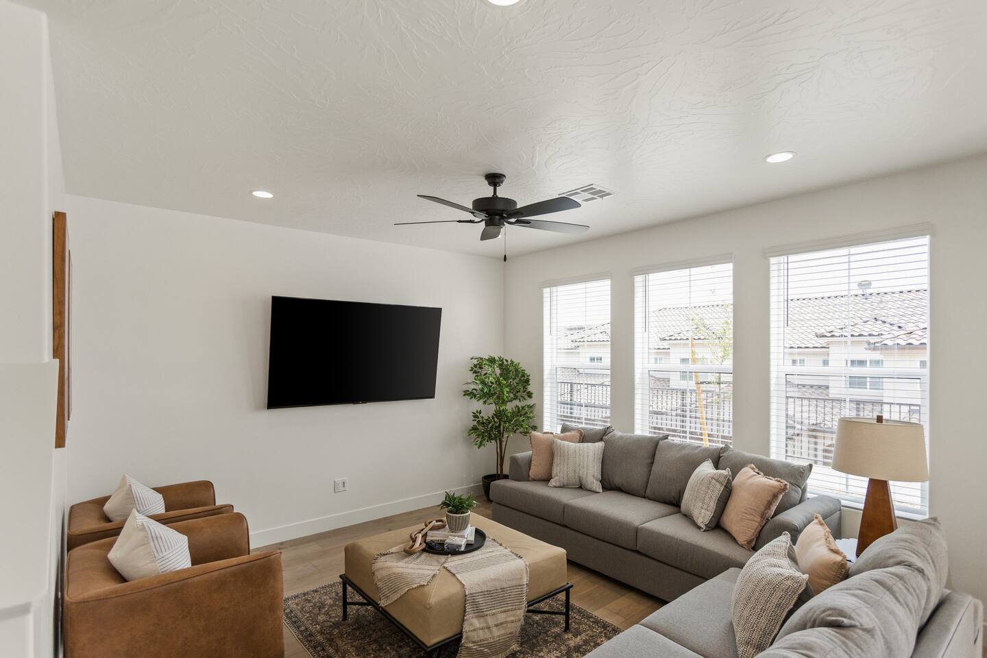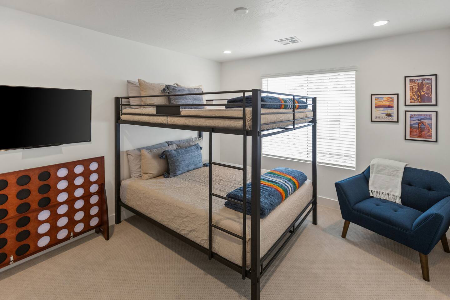 Our home is spotless, modern with superior furnishings throughout making this the perfect home for your upcoming getaway to Southern Utah. Our goal is to exceed your vacation experience in every way and cleanliness is our top priority. To make it easy, we provide you with excellent communication, keyless entry with Self Check-In and offer personal assistance at any time during your stay. We are available 24/7 so do not hesitate to reach out with any questions - We are always happy to help! * SLEEPING ACCOMMODATIONS * Master 1: King (sleeps 2) Master 2: Queen x 2 (sleeps 4) Master 3: King (sleeps 2) Bedroom 4: Queen x 2 Bunk Beds (sleeps 4) Other: Pack N Play Crib (sleeps 1 infant) * We can accommodate 1 infant in this property. If more than 1 infant, please inquire. * BATHROOMS * Bath 1: 1/2 bath off entry (main level) Bath 2: Master 1 Ensuite w/Walk-In Shower Bath 3: Master 2 Ensuite w/Walk-In Shower Bath 4: Between Master 3 and Bunk Room w/Shower & Tub Combo * FEATURES * Fast WiFi Smart Roku TVs Oversized Garage w/EV charger Premium Mattresses with Luxury Bedding Washer + Dryer w/Laundry Supplies Fully Stocked Kitchen w/New Appliances Desk for Work/School BBQ Grill w/Propane Pickle ball Courts w/Equipment Provided RV/Trailer Parking * PARKING * 2-Car Garage w/EV Charger RV/Trailer Parking throughout community Additional parking spaces available on first come - first serve basis * STOCKED KITCHEN * Coffee Maker/Keurig Blender Crockpot Griddle Dishes Glasses Coffee Cups Wine Glasses Kid Dish Set Silverware Knife Set Mixing Bowls Serving Dish and Platter Tupperware Pots & Pans Pyrex Dishes Colander Cookie Sheet Cake Pan Measuring Cups and Spoons Mixing Spoons Whisks and Spatulas Large Serving Spoons Vegetable Peeler Pizza Cutter Ice Cream Scoop Can/Wine Opener Outdoor Utensils for BBQ Grill and MORE!!!! Experience the best of Southern Utah from the comfort of this NEW 2200 square foot home boasting 4 bedrooms and 3.5 bathrooms. Perfectly located close to National + State Parks, shopping, restaurants, golfing, pickle ball, miles of hiking and biking trails. Book Today and Save with Discounted Rates!