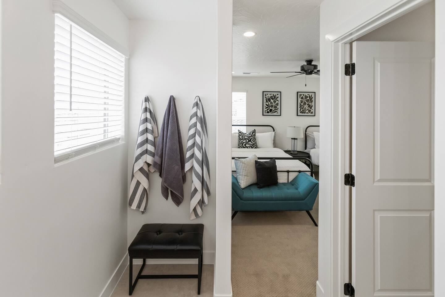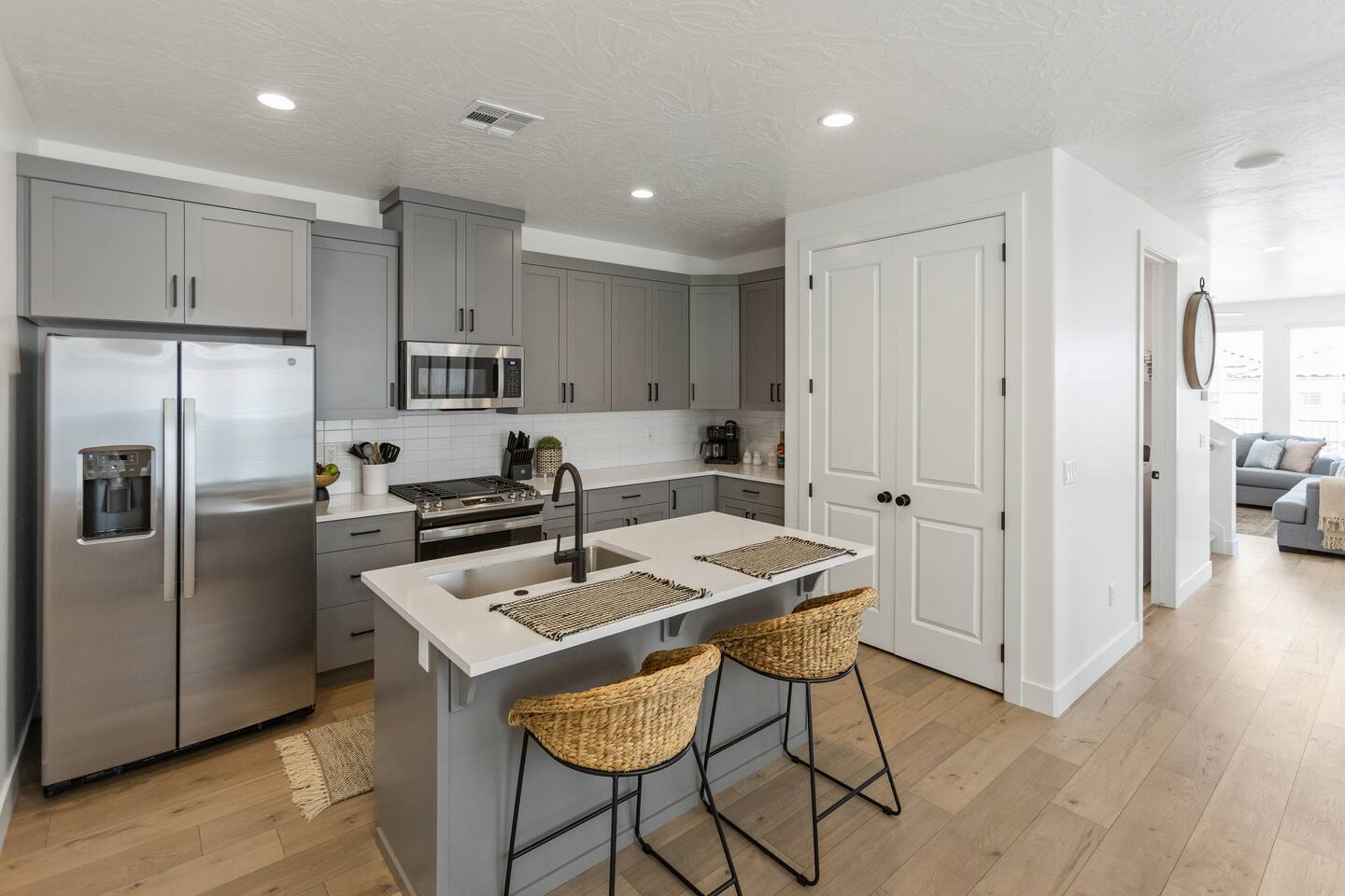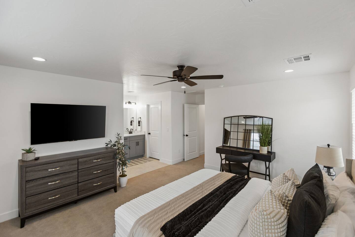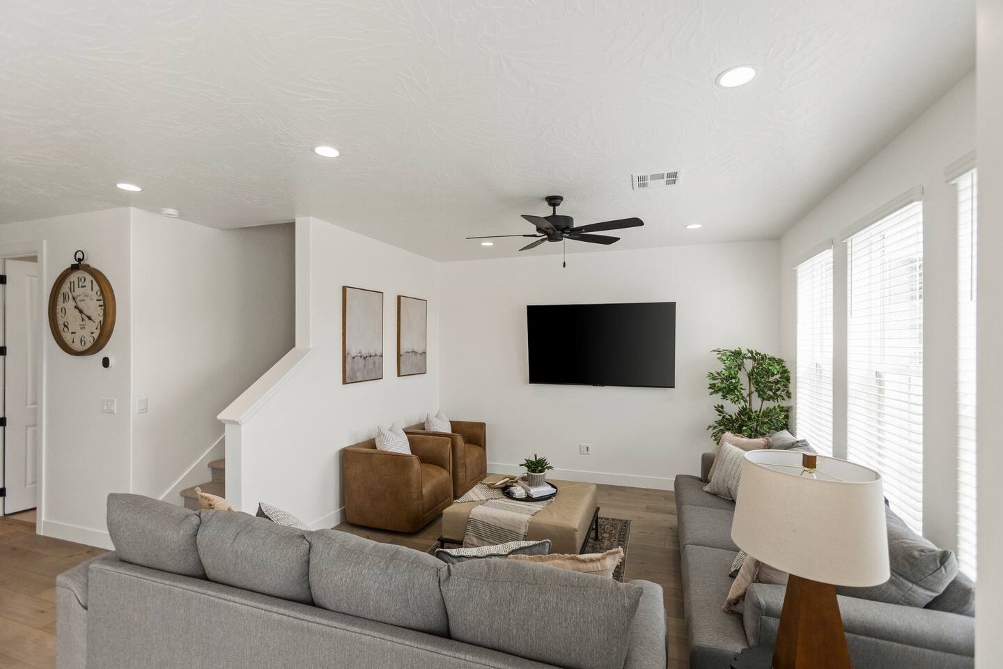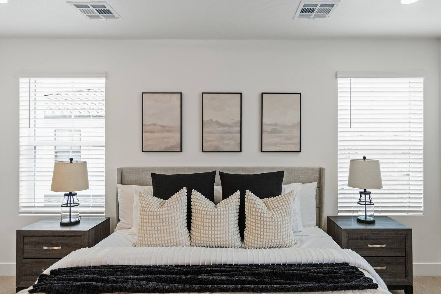 Our home is spotless, modern with superior furnishings throughout making this the perfect home for your upcoming getaway to Southern Utah. Our goal is to exceed your vacation experience in every way and cleanliness is our top priority. To make it easy, we provide you with excellent communication, keyless entry with Self Check-In and offer personal assistance at any time during your stay. We are available 24/7 so do not hesitate to reach out with any questions - We are always happy to help! * SLEEPING ACCOMMODATIONS * Master 1: King (sleeps 2) Master 2: Queen x 2 (sleeps 4) Master 3: King (sleeps 2) Bedroom 4: Queen x 2 Bunk Beds (sleeps 4) Other: Pack N Play Crib (sleeps 1 infant) * We can accommodate 1 infant in this property. If more than 1 infant, please inquire. * BATHROOMS * Bath 1: 1/2 bath off entry (main level) Bath 2: Master 1 Ensuite w/Walk-In Shower Bath 3: Master 2 Ensuite w/Walk-In Shower Bath 4: Between Master 3 and Bunk Room w/Shower & Tub Combo * FEATURES * Fast WiFi Smart Roku TVs Oversized Garage w/EV charger Premium Mattresses with Luxury Bedding Washer + Dryer w/Laundry Supplies Fully Stocked Kitchen w/New Appliances Desk for Work/School BBQ Grill w/Propane Pickle ball Courts w/Equipment Provided RV/Trailer Parking * PARKING * 2-Car Garage w/EV Charger RV/Trailer Parking throughout community Additional parking spaces available on first come - first serve basis * STOCKED KITCHEN * Coffee Maker/Keurig Blender Crockpot Griddle Dishes Glasses Coffee Cups Wine Glasses Kid Dish Set Silverware Knife Set Mixing Bowls Serving Dish and Platter Tupperware Pots & Pans Pyrex Dishes Colander Cookie Sheet Cake Pan Measuring Cups and Spoons Mixing Spoons Whisks and Spatulas Large Serving Spoons Vegetable Peeler Pizza Cutter Ice Cream Scoop Can/Wine Opener Outdoor Utensils for BBQ Grill and MORE!!!! Experience the best of Southern Utah from the comfort of this NEW 2200 square foot home boasting 4 bedrooms and 3.5 bathrooms. Perfectly located close to National + State Parks, shopping, restaurants, golfing, pickle ball, miles of hiking and biking trails. Book Today and Save with Discounted Rates!