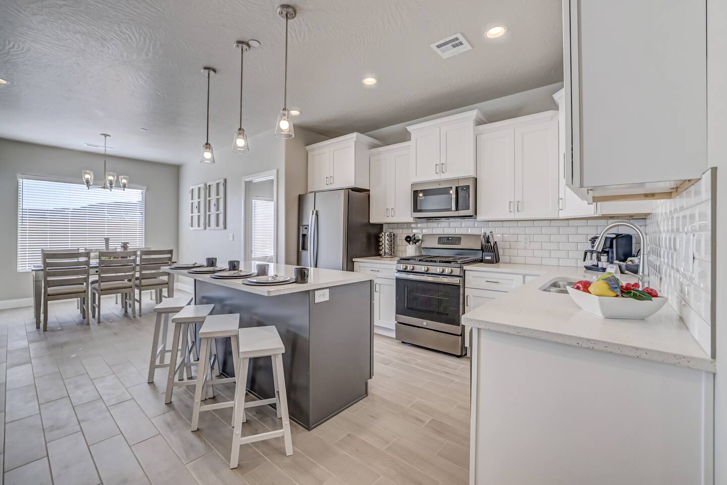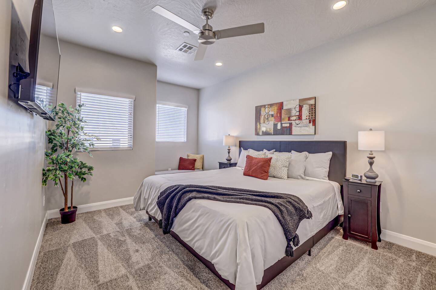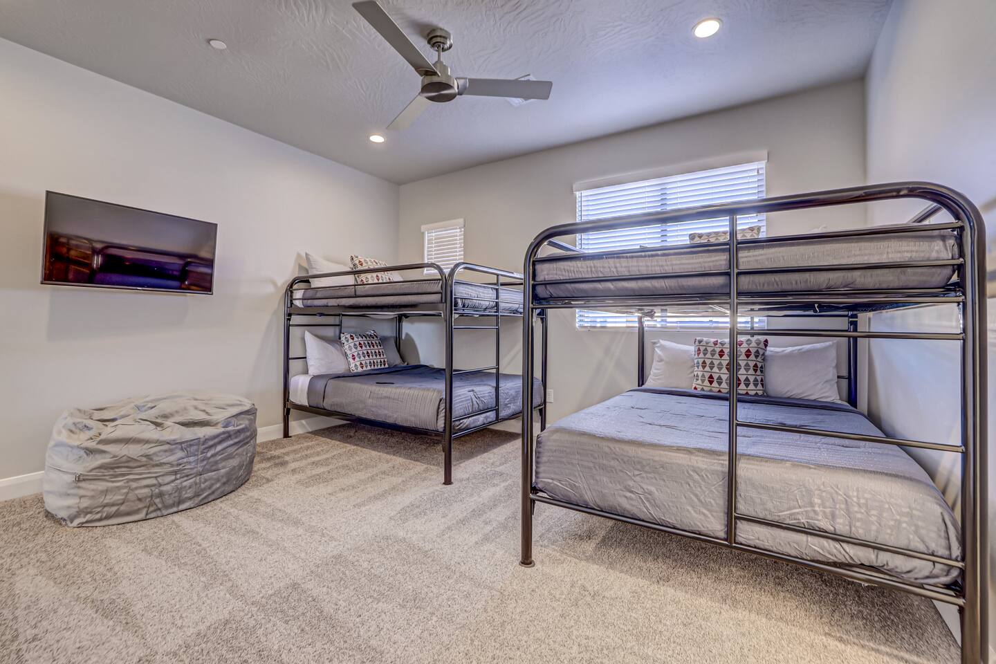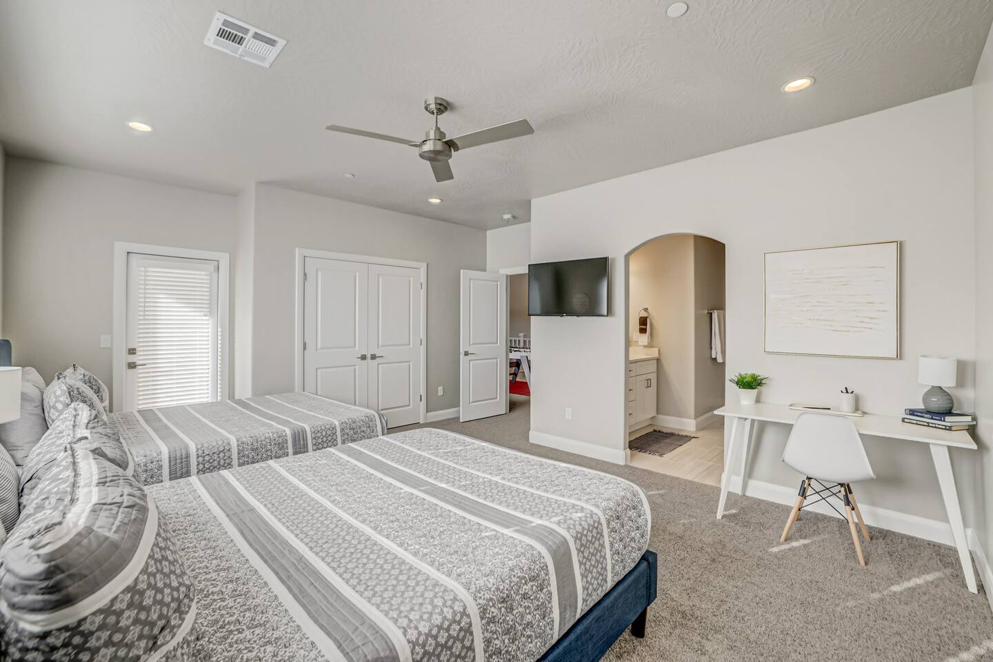 Modern meets natural beauty and desert mountain living in this new Zion Village home! The bright, well-appointed living room features plenty of seating for large groups, a flat-screen smart TV, perfect for relaxing after a day exploring Zion or Sand Hollow Parks. Fire up the gas fire pit, cook dinner on the grill on the patio, and sip a cold drink as you relax in the oversized, private hot tub under the stars. The gourmet kitchen is fully equipped, featuring granite counters and brand new stainless steel appliances to help you whip up meals with ease! Zion Village Resort amenities are the best you will find in Southern Utah. Cool off with a dip in the resort swimming pool w/lazy river, unique lounge areas, hot tub, kid splash pad and slide *HEATED & OPEN ALL YEAR* Additional Zion Village Resort amenities include: clubhouse w/fitness center, pool table, BBQ grilling area, fire pit, basketball and pickle ball courts & more! Come and experience Zion Village Resort and you see why everyone is talking about the best resort in Southern Utah! This amazing home makes for a rejuvenating and fun retreat for multiple families, large groups, and teams. This home has it all as far as things to do in the home. • Full-Size Foosball Table • Oversized, Private Hot-Tub • Fire Pit • High Speed Internet • 6 Roku Smart TVs • Work Space When it's time for bed, retreat to the master suite for a blissful night's sleep. All of our beds feature premium mattresses and various comfortable pillow options. Three bedrooms have large beds perfect for couples, flat-screen smart TVs, ceiling fans, black-out curtains and closets allows you to really settle in during your stay. Kids love the bunk room with 2 large bean bags. Bedrooms are setup with the traveling family in mind! * SLEEPING ACCOMMODATIONS * Master Suite 1: King Bed, Flat-screen Smart TV, Bench, Nightstands with Lamps, Ceiling Fan, Walkout to Private Backyard, and Closet. Ensuite Bathroom with Double Vanity, Walk-in Shower and separate Toilet Room. *MAIN LEVEL Master Suite 2: Queen Bed x 2, Flat-screen Smart TV, Desk with Chairs, Nightstands with Lamps, Ceiling Fan, Walkout to Balcony, and Large Closet. Ensuite Bathroom with Double Vanity, Walk-in Shower and separate Toilet Room. Master Suite 3: King Bed, Flat-screen Smart TV, Bench, Ceiling Fan, and Closet. Bunk Bedroom 4: Full Bunk Beds x 4 - this is the kids favorite. Also, Oversized Bean Bags x2 that convert into full mattresses. Sleeps up to 12 kids! Pack-N-Play Portable Crib, Queen Inflatable Air Mattress and additional bedding in upstairs Master Closet. * We can accommodate 1 infant in this property. If more than 1 infant, please inquire. - Sleeps up to 18 total with kids - If you have a larger group, we have several properties in Zion Village Resort and would love to help accommodate your group with one of our other properties @ Zion Village Resort. * Home is dog friendly and we do not charge a pet fee for one small dog. If you have more than 1 dog or if your dog is larger than 17 pounds - please inquire. We have made exceptions and absolutely willing to consider - pet fee may apply for larger/additional dogs. Please send us a message. We are happy to help! We know many want to know what exactly is included in a “fully stocked” kitchen. This kitchen will not disappoint. GOURMET EQUIPPED KITCHEN: Coffee Maker (Drip and Keurig) Blender Crockpot Griddle Dishes for 18+ Glasses for 18+ Coffee Cups for 12 Wine Glasses for 12 Kid Dish Set Silverware for 18+ Knife Set Mixing Bowls Serving Dishes and Platters Tupperware Pots & Pans Pyrex Dishes Colander Cookie Sheets Cake Pans Measuring Cups and Spoons Mixing Spoons Whisks and Spatulas Large Serving Spoons Vegetable Peeler Pizza Cutter Ice Cream Scoop Can/Wine Opener Outdoor Utensils for BBQ Grill and MORE!!!!