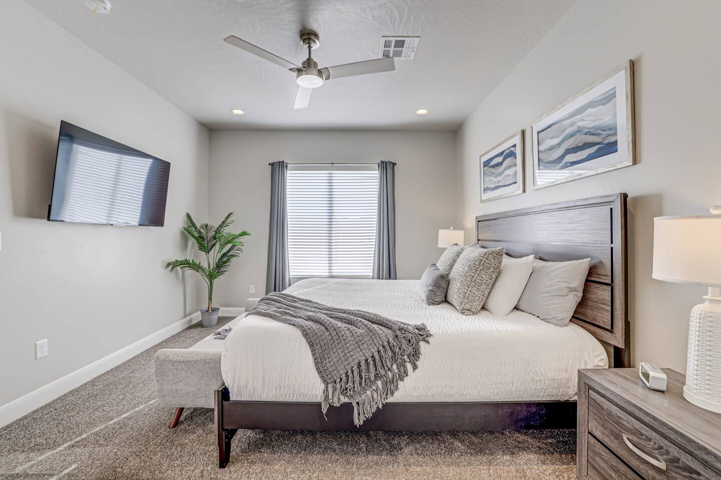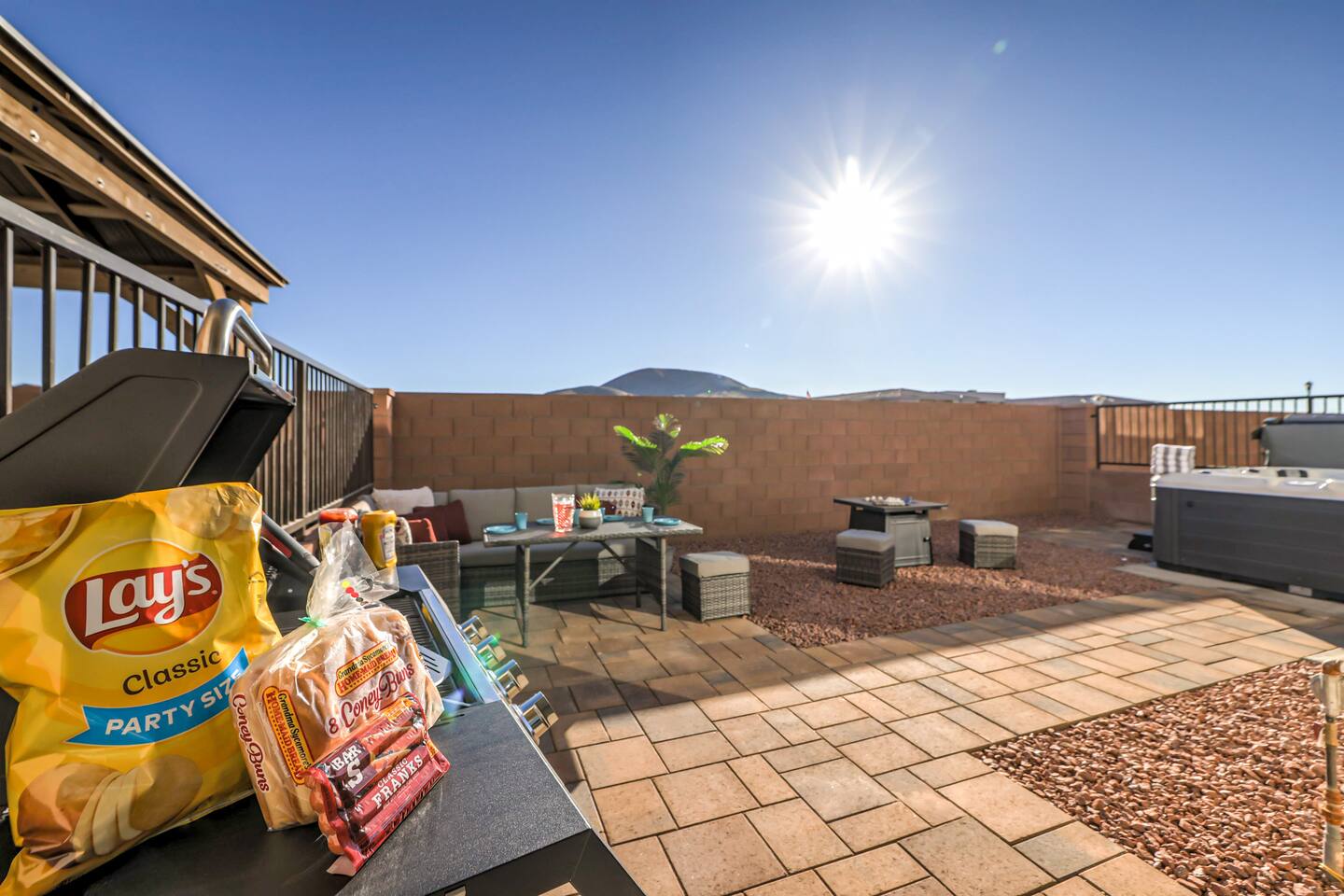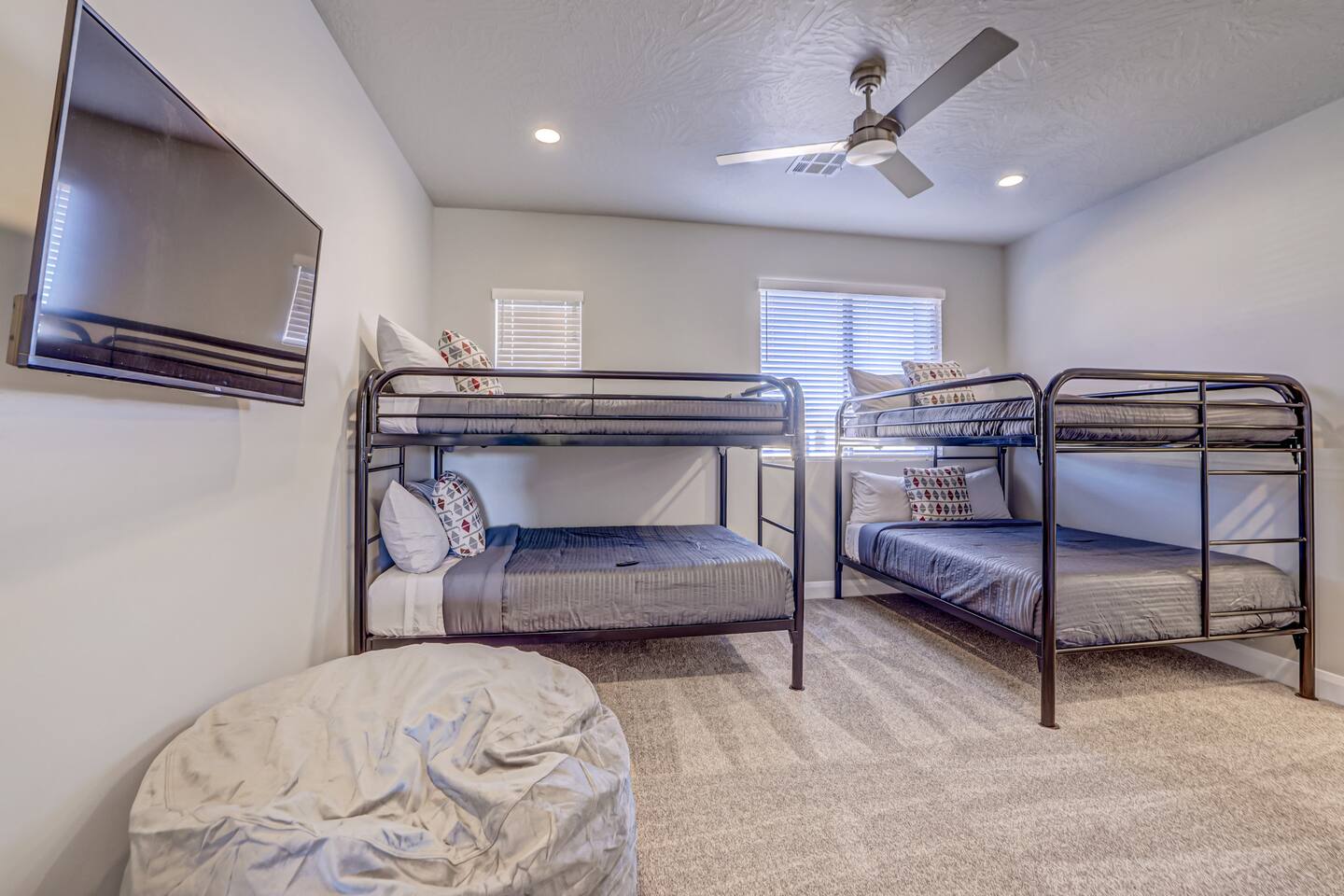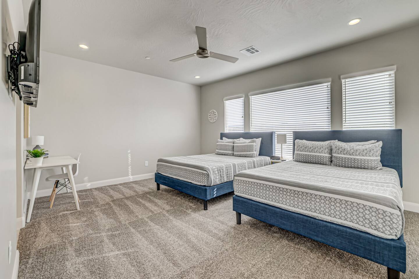 Modern meets natural beauty and desert mountain living in this new Zion Village home! The bright, well-appointed living room features plenty of seating for large groups, a flat-screen smart TV, perfect for relaxing after a day exploring Zion or Sand Hollow Parks. Fire up the gas fire pit, cook dinner on the grill on the patio, and sip a cold drink as you relax in the oversized, private hot tub under the stars. The gourmet kitchen is fully equipped, featuring granite counters and brand new stainless steel appliances to help you whip up meals with ease! Zion Village Resort amenities are the best you will find in Southern Utah. Cool off with a dip in the resort swimming pool w/lazy river, unique lounge areas, hot tub, kid splash pad and slide *HEATED & OPEN ALL YEAR* Additional Zion Village Resort amenities include: clubhouse w/fitness center, pool table, BBQ grilling area, fire pit, basketball and pickle ball courts & more! Come and experience Zion Village Resort and you see why everyone is talking about the best resort in Southern Utah! This amazing home makes for a rejuvenating and fun retreat for multiple families, large groups, and teams. This home has it all as far as things to do in the home. • Full-Size Foosball Table • Oversized, Private Hot-Tub • Fire Pit • High Speed Internet • 6 Roku Smart TVs • Work Space When it's time for bed, retreat to the master suite for a blissful night's sleep. All of our beds feature premium mattresses and various comfortable pillow options. Three bedrooms have large beds perfect for couples, flat-screen smart TVs, ceiling fans, black-out curtains and closets allows you to really settle in during your stay. Kids love the bunk room with 2 large bean bags. Bedrooms are setup with the traveling family in mind! * SLEEPING ACCOMMODATIONS * Master Suite 1: King Bed, Flat-screen Smart TV, Bench, Nightstands with Lamps, Ceiling Fan, Walkout to Private Backyard, and Closet. Ensuite Bathroom with Double Vanity, Walk-in Shower and separate Toilet Room. *MAIN LEVEL Master Suite 2: Queen Bed x 2, Flat-screen Smart TV, Desk with Chairs, Nightstands with Lamps, Ceiling Fan, Walkout to Balcony, and Large Closet. Ensuite Bathroom with Double Vanity, Walk-in Shower and separate Toilet Room. Master Suite 3: King Bed, Flat-screen Smart TV, Bench, Ceiling Fan, and Closet. Bunk Bedroom 4: Full Bunk Beds x 4 - this is the kids favorite. Also, Oversized Bean Bags x2 that convert into full mattresses. Sleeps up to 12 kids! Pack-N-Play Portable Crib, Queen Inflatable Air Mattress and additional bedding in upstairs Master Closet. * We can accommodate 1 infant in this property. If more than 1 infant, please inquire. - Sleeps up to 18 total with kids - If you have a larger group, we have several properties in Zion Village Resort and would love to help accommodate your group with one of our other properties @ Zion Village Resort. * Home is dog friendly and we do not charge a pet fee for one small dog. If you have more than 1 dog or if your dog is larger than 17 pounds - please inquire. We have made exceptions and absolutely willing to consider - pet fee may apply for larger/additional dogs. Please send us a message. We are happy to help! We know many want to know what exactly is included in a “fully stocked” kitchen. This kitchen will not disappoint. GOURMET EQUIPPED KITCHEN: Coffee Maker (Drip and Keurig) Blender Crockpot Griddle Dishes for 18+ Glasses for 18+ Coffee Cups for 12 Wine Glasses for 12 Kid Dish Set Silverware for 18+ Knife Set Mixing Bowls Serving Dishes and Platters Tupperware Pots & Pans Pyrex Dishes Colander Cookie Sheets Cake Pans Measuring Cups and Spoons Mixing Spoons Whisks and Spatulas Large Serving Spoons Vegetable Peeler Pizza Cutter Ice Cream Scoop Can/Wine Opener Outdoor Utensils for BBQ Grill and MORE!!!!