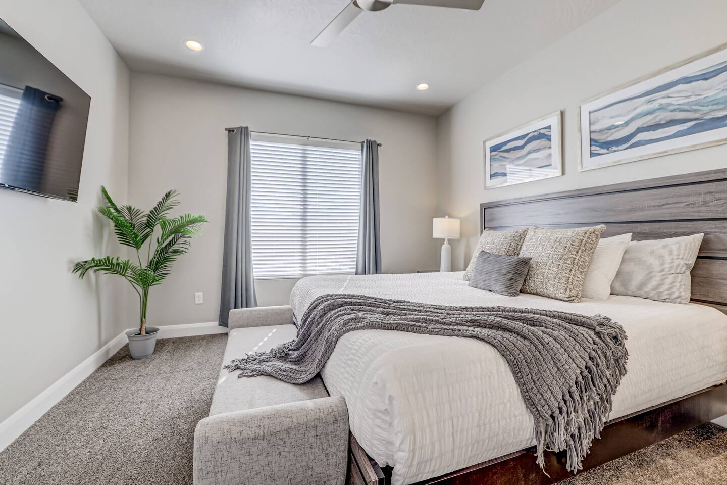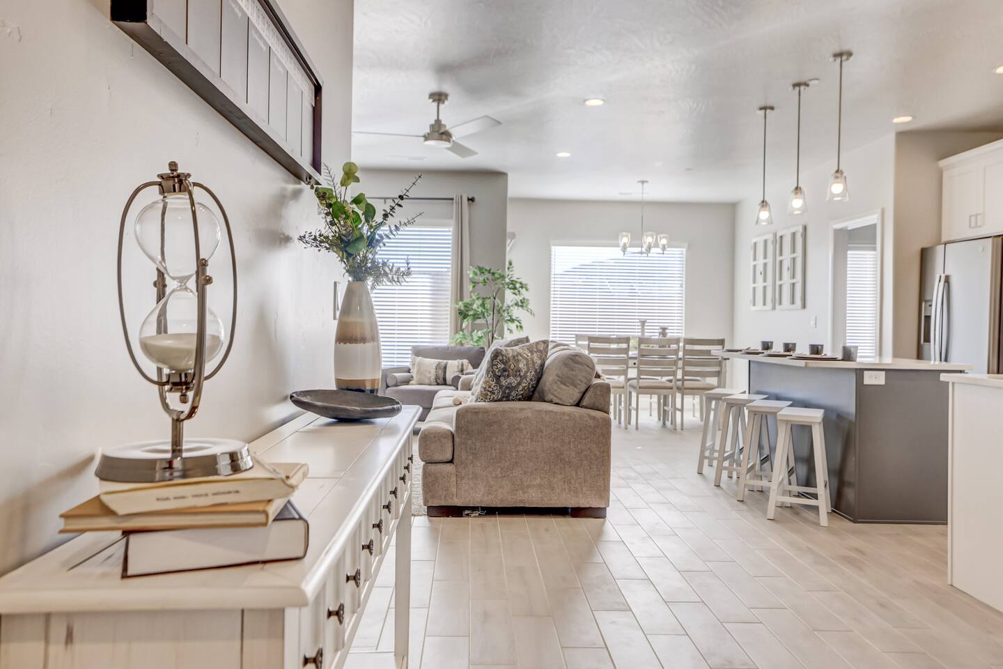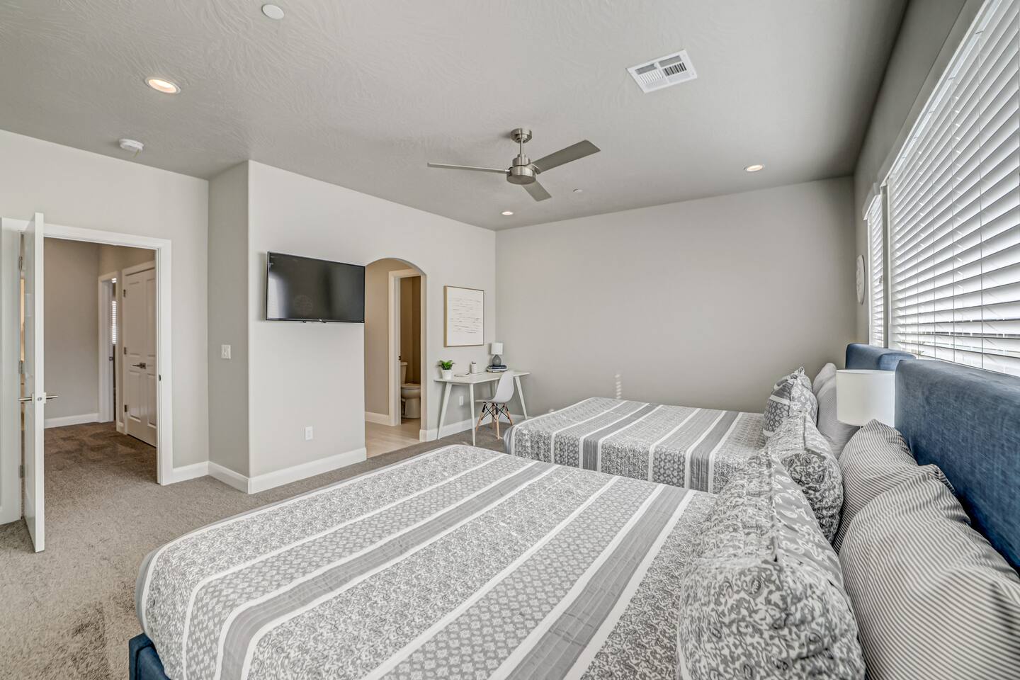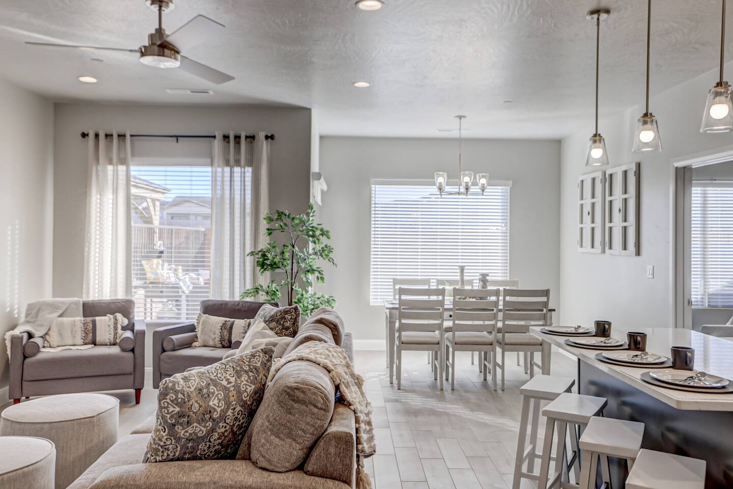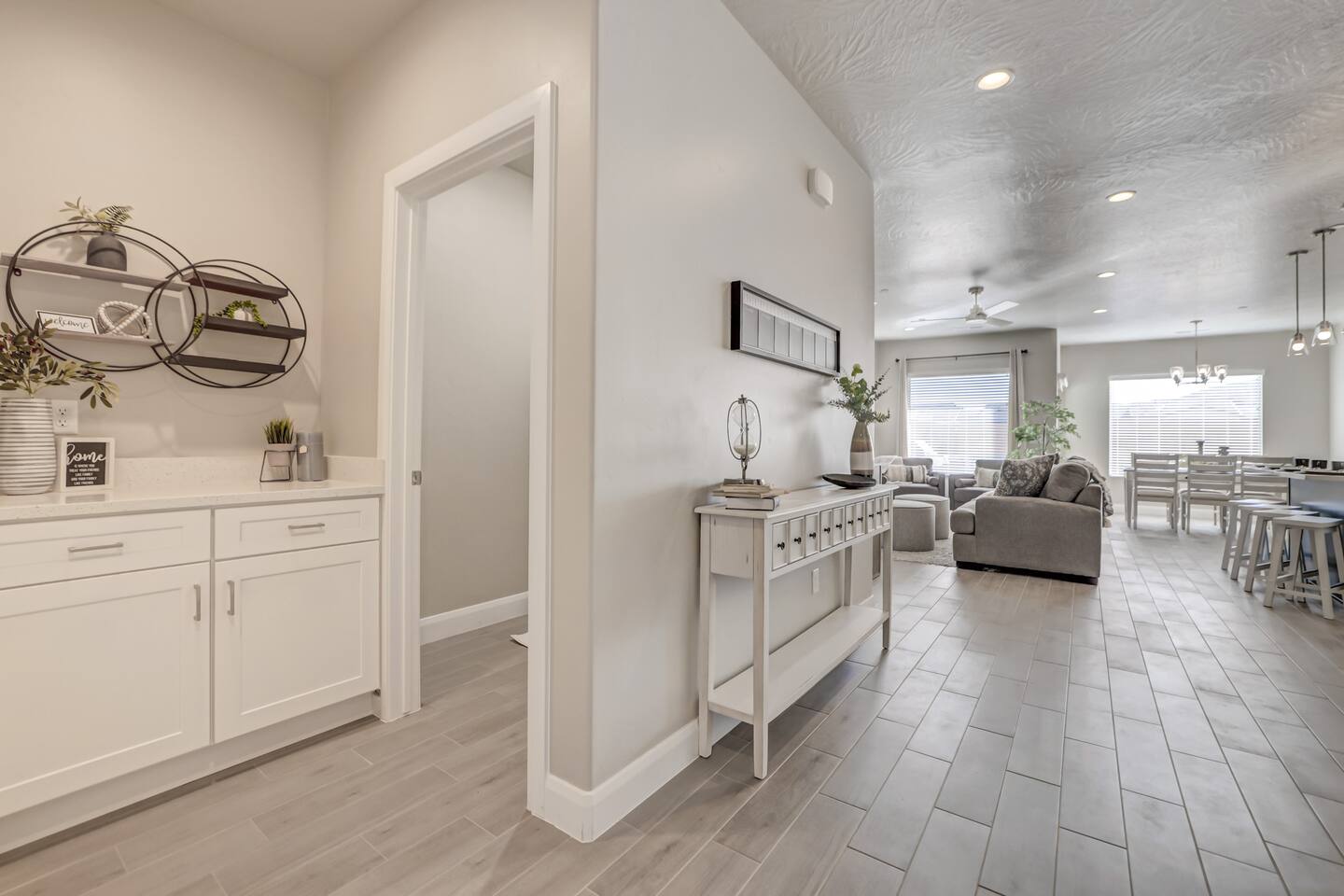 Modern meets natural beauty and desert mountain living in this new Zion Village home! The bright, well-appointed living room features plenty of seating for large groups, a flat-screen smart TV, perfect for relaxing after a day exploring Zion or Sand Hollow Parks. Fire up the gas fire pit, cook dinner on the grill on the patio, and sip a cold drink as you relax in the oversized, private hot tub under the stars. The gourmet kitchen is fully equipped, featuring granite counters and brand new stainless steel appliances to help you whip up meals with ease! Zion Village Resort amenities are the best you will find in Southern Utah. Cool off with a dip in the resort swimming pool w/lazy river, unique lounge areas, hot tub, kid splash pad and slide *HEATED & OPEN ALL YEAR* Additional Zion Village Resort amenities include: clubhouse w/fitness center, pool table, BBQ grilling area, fire pit, basketball and pickle ball courts & more! Come and experience Zion Village Resort and you see why everyone is talking about the best resort in Southern Utah! This amazing home makes for a rejuvenating and fun retreat for multiple families, large groups, and teams. This home has it all as far as things to do in the home. • Full-Size Foosball Table • Oversized, Private Hot-Tub • Fire Pit • High Speed Internet • 6 Roku Smart TVs • Work Space When it's time for bed, retreat to the master suite for a blissful night's sleep. All of our beds feature premium mattresses and various comfortable pillow options. Three bedrooms have large beds perfect for couples, flat-screen smart TVs, ceiling fans, black-out curtains and closets allows you to really settle in during your stay. Kids love the bunk room with 2 large bean bags. Bedrooms are setup with the traveling family in mind! * SLEEPING ACCOMMODATIONS * Master Suite 1: King Bed, Flat-screen Smart TV, Bench, Nightstands with Lamps, Ceiling Fan, Walkout to Private Backyard, and Closet. Ensuite Bathroom with Double Vanity, Walk-in Shower and separate Toilet Room. *MAIN LEVEL Master Suite 2: Queen Bed x 2, Flat-screen Smart TV, Desk with Chairs, Nightstands with Lamps, Ceiling Fan, Walkout to Balcony, and Large Closet. Ensuite Bathroom with Double Vanity, Walk-in Shower and separate Toilet Room. Master Suite 3: King Bed, Flat-screen Smart TV, Bench, Ceiling Fan, and Closet. Bunk Bedroom 4: Full Bunk Beds x 4 - this is the kids favorite. Also, Oversized Bean Bags x2 that convert into full mattresses. Sleeps up to 12 kids! Pack-N-Play Portable Crib, Queen Inflatable Air Mattress and additional bedding in upstairs Master Closet. * We can accommodate 1 infant in this property. If more than 1 infant, please inquire. - Sleeps up to 18 total with kids - If you have a larger group, we have several properties in Zion Village Resort and would love to help accommodate your group with one of our other properties @ Zion Village Resort. * Home is dog friendly and we do not charge a pet fee for one small dog. If you have more than 1 dog or if your dog is larger than 17 pounds - please inquire. We have made exceptions and absolutely willing to consider - pet fee may apply for larger/additional dogs. Please send us a message. We are happy to help! We know many want to know what exactly is included in a “fully stocked” kitchen. This kitchen will not disappoint. GOURMET EQUIPPED KITCHEN: Coffee Maker (Drip and Keurig) Blender Crockpot Griddle Dishes for 18+ Glasses for 18+ Coffee Cups for 12 Wine Glasses for 12 Kid Dish Set Silverware for 18+ Knife Set Mixing Bowls Serving Dishes and Platters Tupperware Pots & Pans Pyrex Dishes Colander Cookie Sheets Cake Pans Measuring Cups and Spoons Mixing Spoons Whisks and Spatulas Large Serving Spoons Vegetable Peeler Pizza Cutter Ice Cream Scoop Can/Wine Opener Outdoor Utensils for BBQ Grill and MORE!!!!