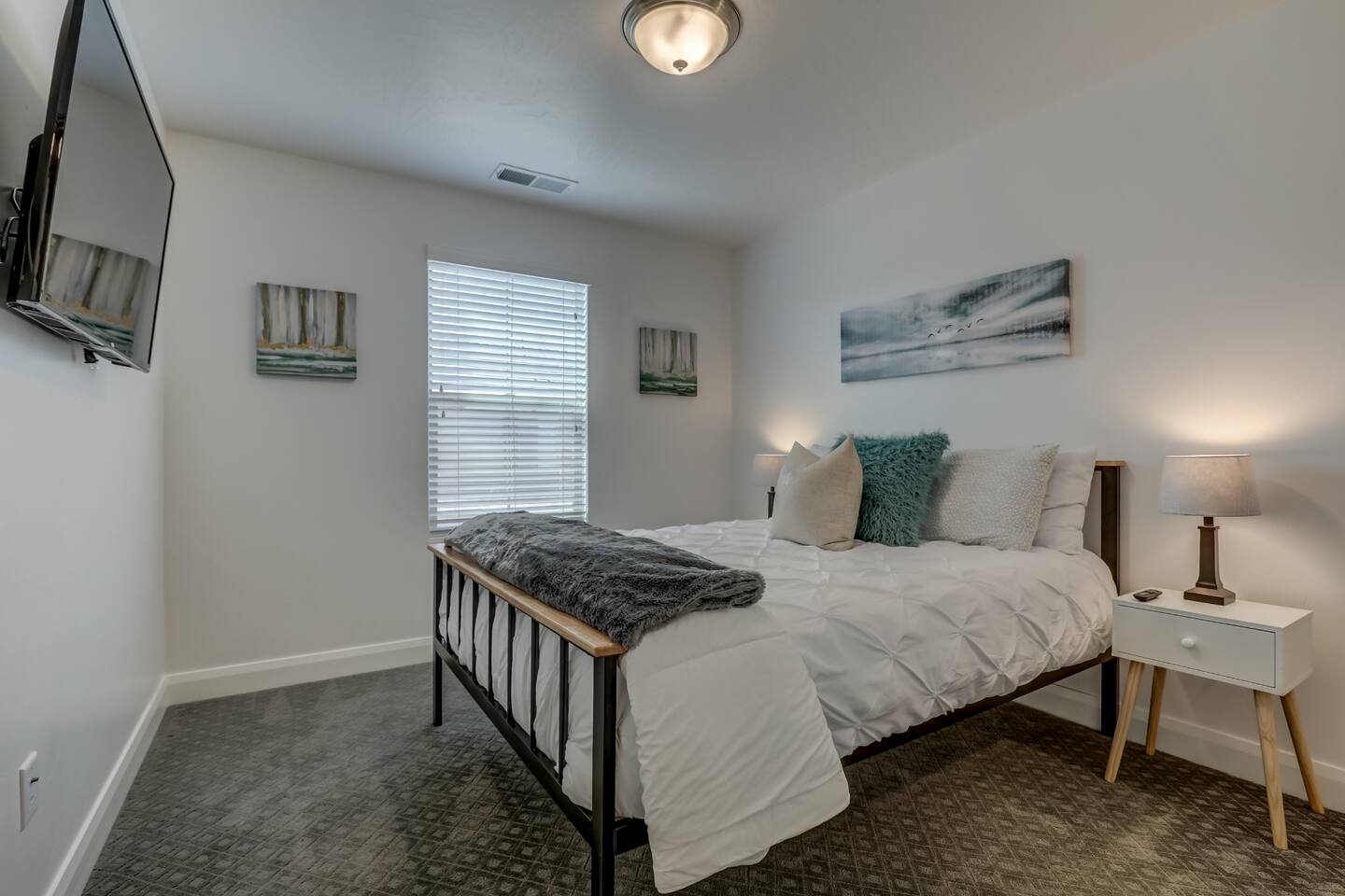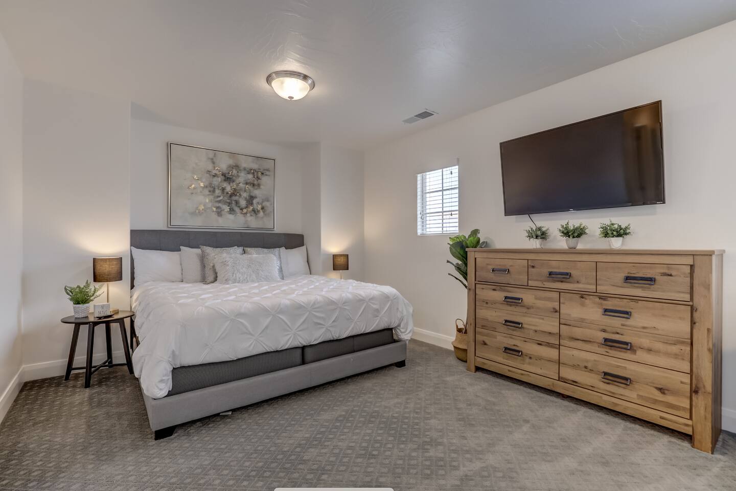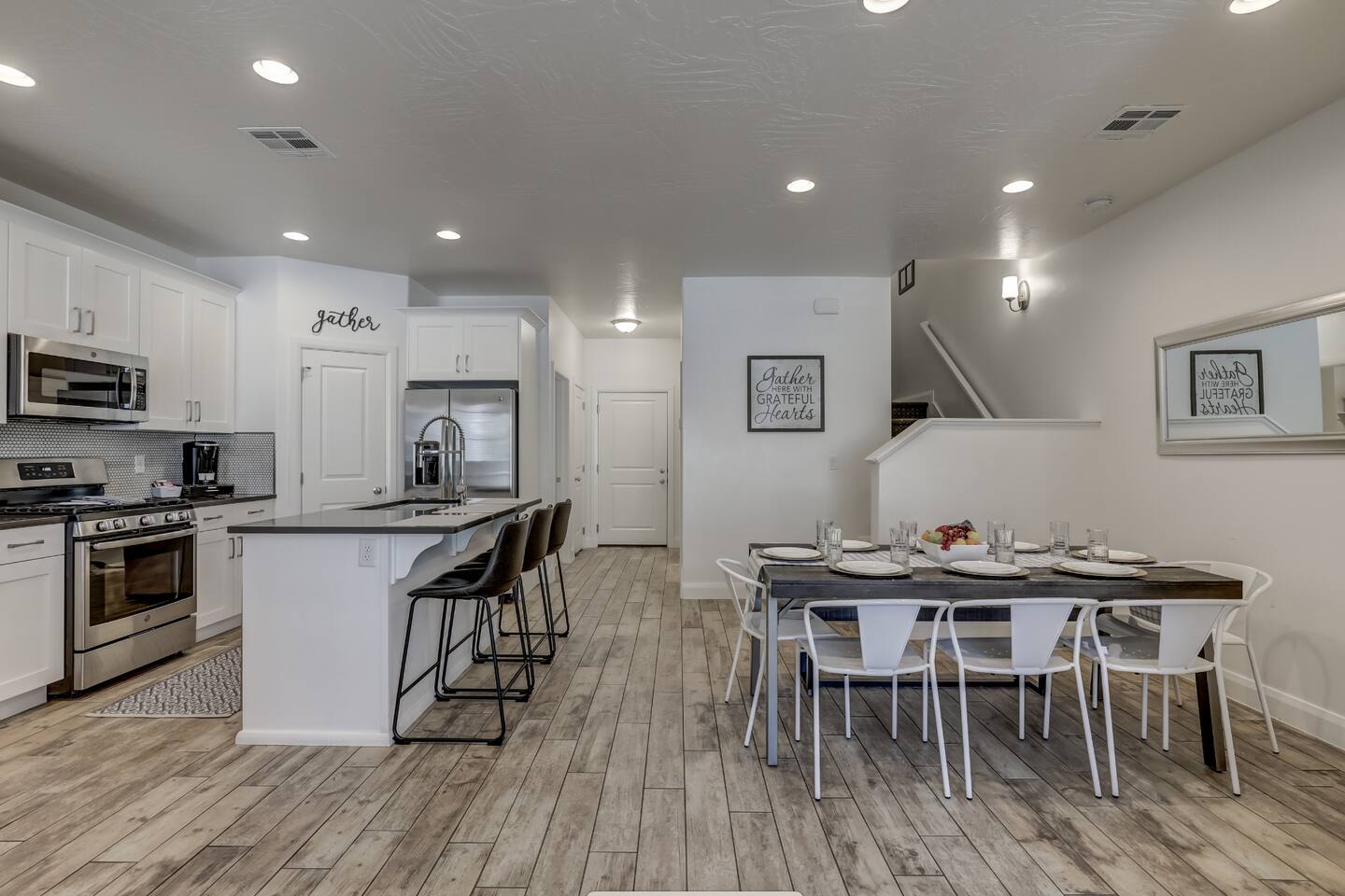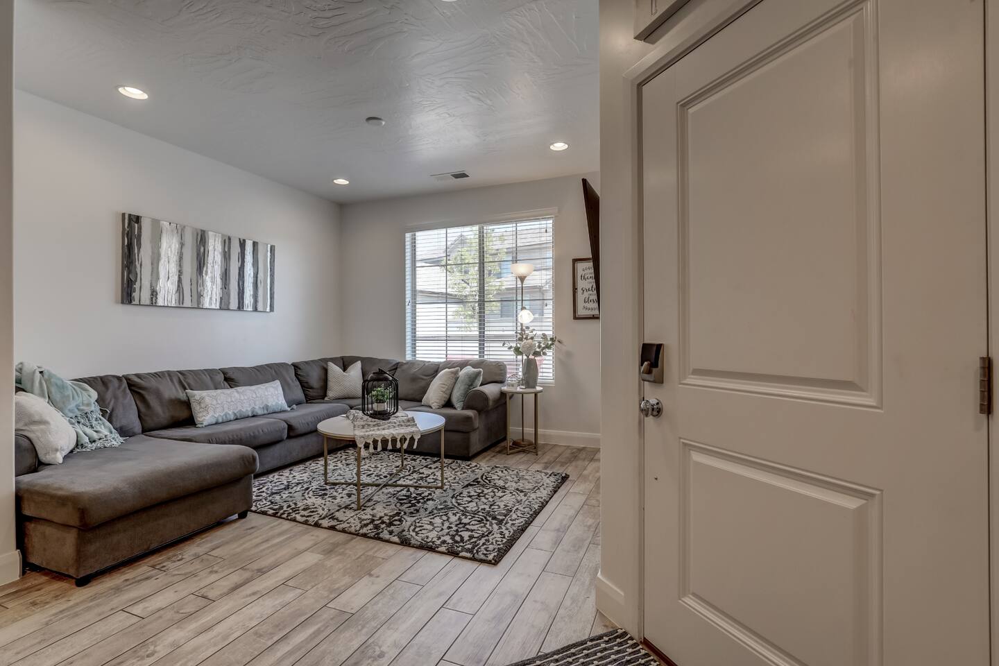 Relax and enjoy your Southern Utah vacation in this delightful rental home that provides all that you need for your getaway! The open floor plan with kitchen, dining and living room is perfect for gathering! The modern kitchen is fully stocked and upgraded with quartz counter tops, stainless steel appliances and gorgeous tile work throughout. This home boasts 10 comfortable beds sleeping large groups without having to share beds. This home is centrally located and Long Stays are Welcome!