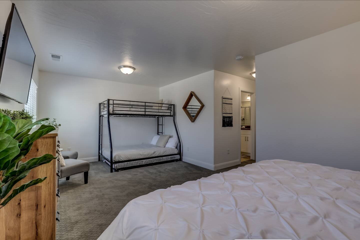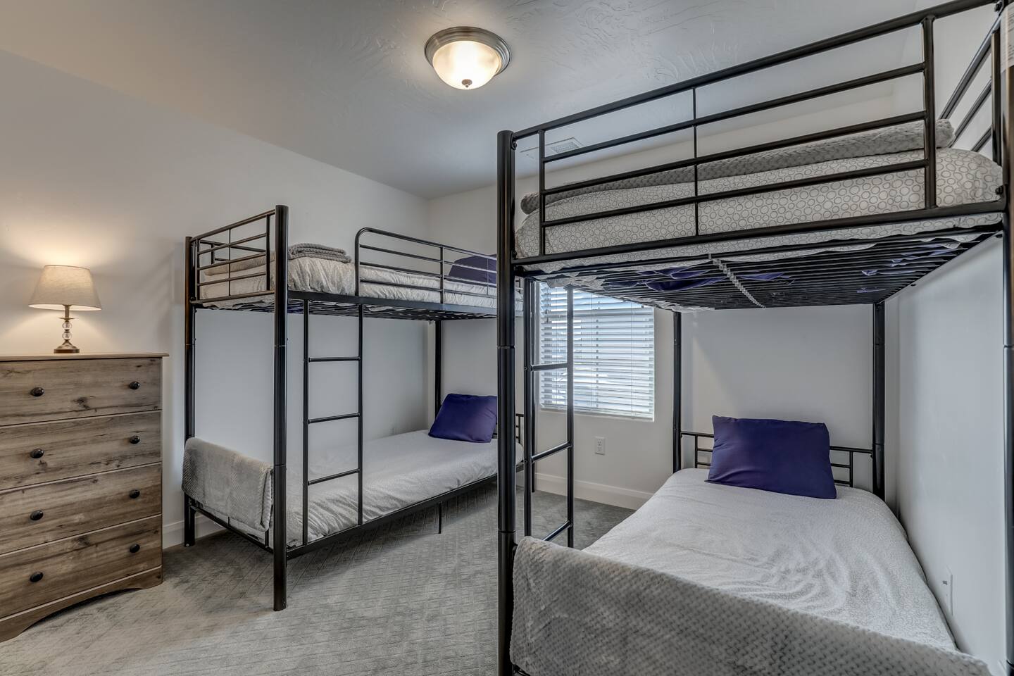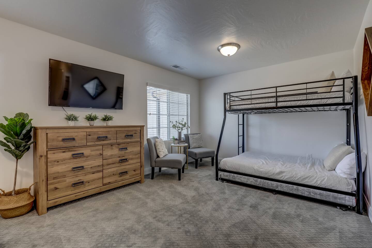 FEATURES --> • 3 Bedrooms + 2.5 Bathrooms • Spacious Kitchen/Living Room • Dining Seating 11 inside + 4 outside patio • Open Floor Plan with plenty of windows + natural lighting • Stainless Steel Appliances + Granite Countertops • Gorgeous tile work throughout • Hard floors on main level + carpet upstairs • Dog Friendly* • 3 Smart TVs • High Speed WiFi • Laundry Room w/Washer + Dryer • Portable Crib • Private patio w/ BBQ, outdoor dining table • 2-Car Garage + Extra Parking COMMUNITY AMENITIES --> • Heated Swimming Pool w/Lap Lane (open all year) • Outdoor Hot Tub • Beautiful Red Rock and Breathtaking Views • Walking Trails and Parks with Large Grass Areas SLEEPING ACCOMMODATIONS --> Total Beds: 10 • Room 1: King (sleeps 2) Double Bunk (sleeps 2) Double Trundle (sleeps 2) Single Bunk (sleeps 1) • Room 2: Single Bunk x 4 (sleeps 4) Single Trundle (sleeps 1) • Room 3: Queen (sleeps 2) • Additional Sleeping: Queen Inflatable Air Mattress (sleeps 2) PackNPlay Portable Crib (We can accommodate 1 infant in this home. If more than 1 infant, please inquire.) * Home is dog friendly and we do not charge a pet fee for one small dog. If you have more than 1 dog or if your dog is larger than 17 pounds - please inquire. We have made exceptions and absolutely willing to consider - pet fee may apply for larger/additional dogs. Please send us a message. We are happy to help!
