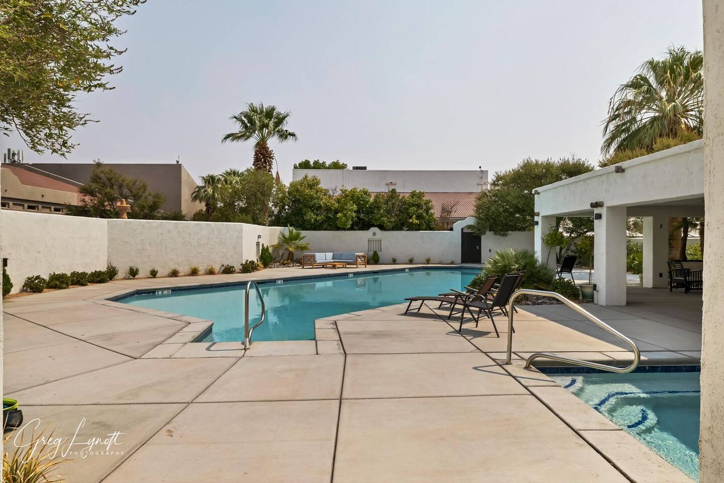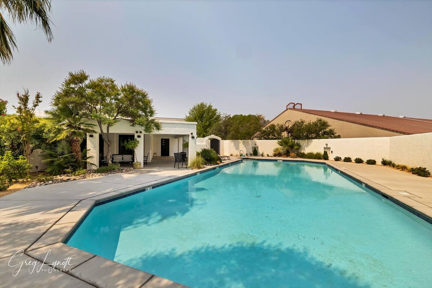 Relaxation on a whole new level in your private slice of heaven. Amazing OASIS in the desert with HUGE private pool & hot tub. Presidential Suite featuring Master Ensuite, fully stocked kitchen with open living area, and 2 full bathrooms in a stand alone home with large deck with outdoor furniture and BBQ grill. Excellent WiFi and Smart TVs. Access to resort amenities: 4 pickle ball courts, workout area, free parking, 2 resort pools and hot tub. Book this UNIQUE new listing today!