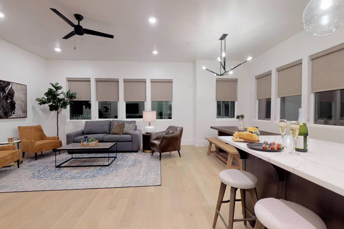 The best place for friends and family to share and celebrate memorable experiences. Be inspired by staying in our stunning home! Embrace and focus on what matters the most. All of our mattresses are top of the line with luxury linens to give you the best night rest! Sleeps up to 11: Master Bedroom 1: King B ed w/Ensuite Bathroom (Sleeps 2) Master Bedroom 2: Kind Bed w/Ensuite Bathroom (Sleeps 2) Bedroom 3: Full Bunks x 2 and Single Trundle Bed (Sleeps 2 adults OR up to 5 kids) Living Room: Queen Inflatable Air Mattress (Sleeps 2) Pack-N-Play Portable Crib (We can accommodate 1 infant in this property. If more than 1 infant, please inquire.) You will enjoy cooking and entertaining in this luxury kitchen. Featuring Stainless steel appliances as well as a side by side refrigerator, dishwasher, microwave, oven, and separate gas stove top. The kitchen is fully stocked with everything you need to make Thanksgiving dinner for 11 guests. The living room includes comfortable couches and chairs, and a large flat screen TV. You will also enjoy the large patio overlooking the Bloomington Country Club and Pool. The balcony features patio furniture to enjoy the warm desert breeze. * Home is dog friendly and we do not charge a pet fee for one small dog. If you have more than 1 dog or if your dog is larger than 17 pounds - please inquire. We have made exceptions and absolutely willing to consider - pet fee may apply for larger/additional dogs. Please send us a message. We are happy to help! With access to the country club's 18 hole championship golf course, resort style swimming pool, championship tennis courts, and full-service restaurant and bar, you'll discover why the new Bloomington Villas are the best destination resort in St. George. The 18 Hole Golf Course is located between the stunning Red Cliffs of Bloomington and the Virgin River. You can't beat the challenging serenity of playing 18 holes in gorgeous weather. Special amenities at the BCC golf course now include PGA golf lessons, club and pull cart storage, computerized tee time scheduling and more than 7000 yards of immaculate fairways and greens. Also, enjoy the fully renovated large pool. As a guest, you will enjoy the poolside service. Enjoy snacks, meals and custom drinks that can be delivered right to you as you lounge in the sun with your feet in the water. The Bloomington Villas also includes full access to the Country Club's esteemed tennis program, with adult play, weekly scheduled events, and a thriving juniors program. The Country Club also features a restaurant with a full menu that offers a relaxing yet elegant dining experience everyone can enjoy.