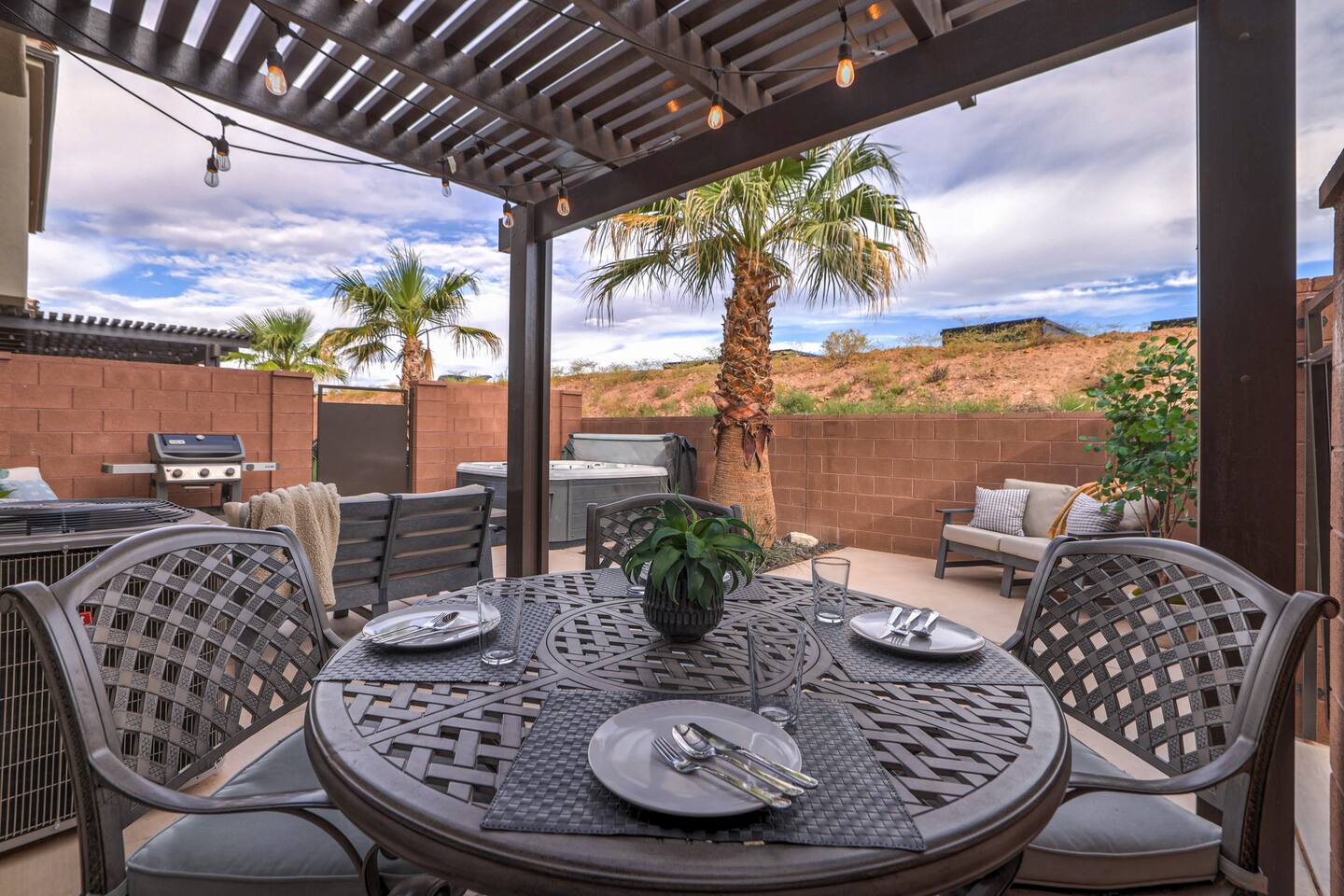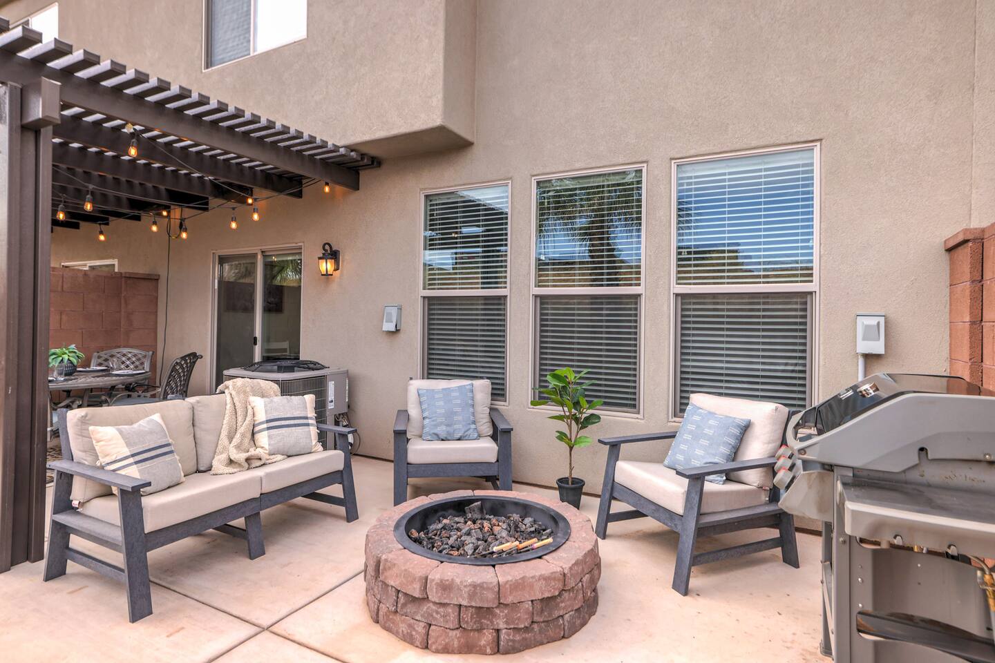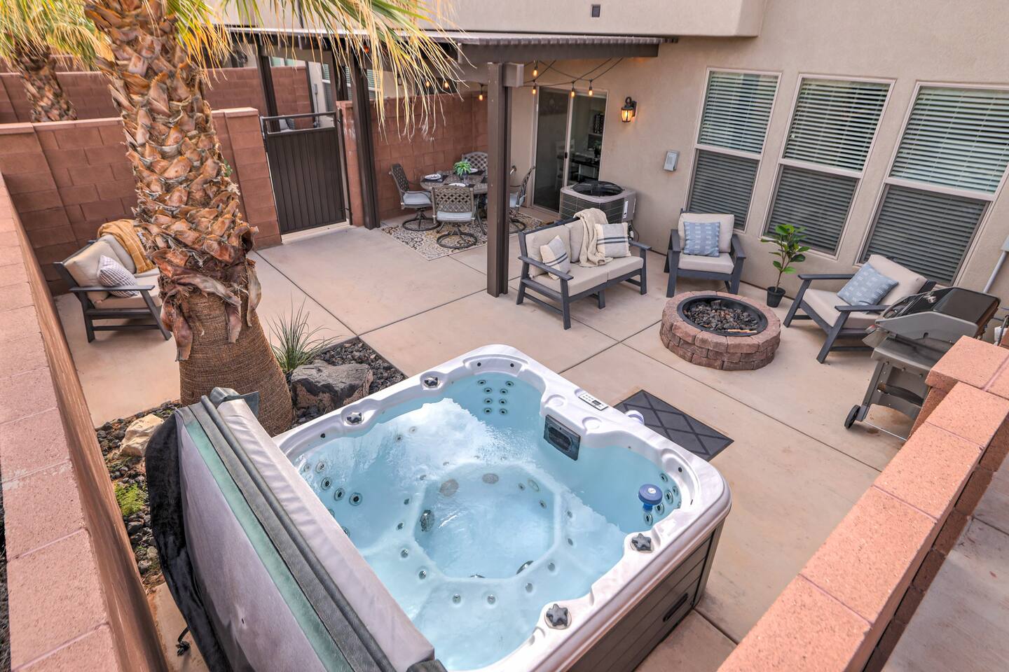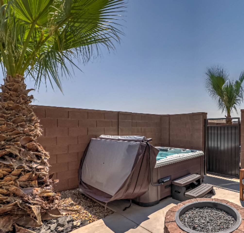 3 Bedroom/3 Bath home has it all featuring private, fenced back patio w/hot tub, fire-pit & BBQ. Home has an amazing Master enSuite, stocked kitchen & two living areas: one on the main level & another upstairs. Conveniently located 2 minutes off I-15, in a quiet upscale community. Experience St George, Zions & Sand Hollow. Enjoy a show at Tuacahn with shopping & dining close by. Community pool steps away from your front door. Book Today & you will be off to a good start on your upcoming trip!