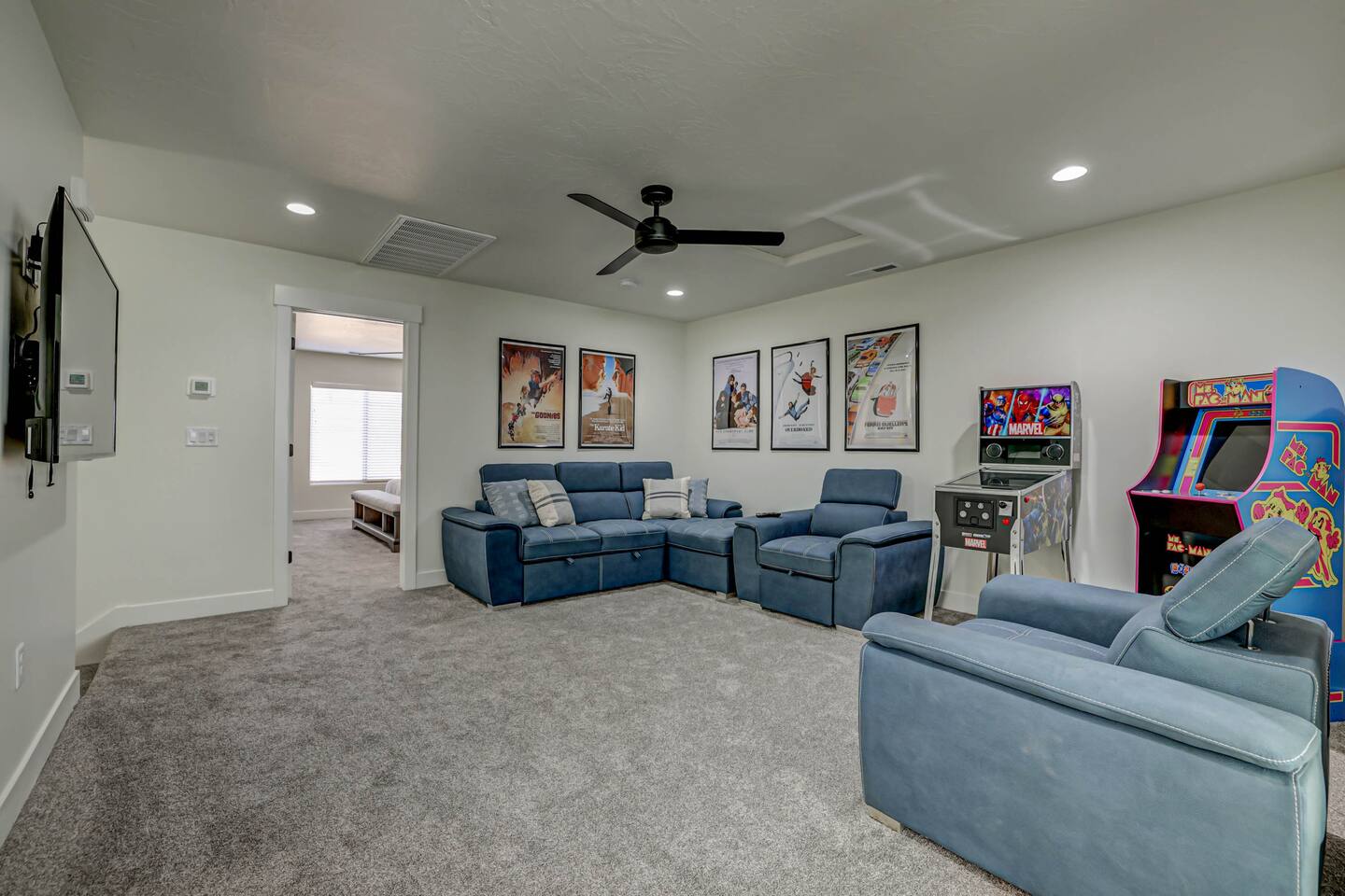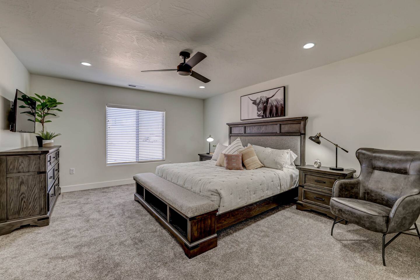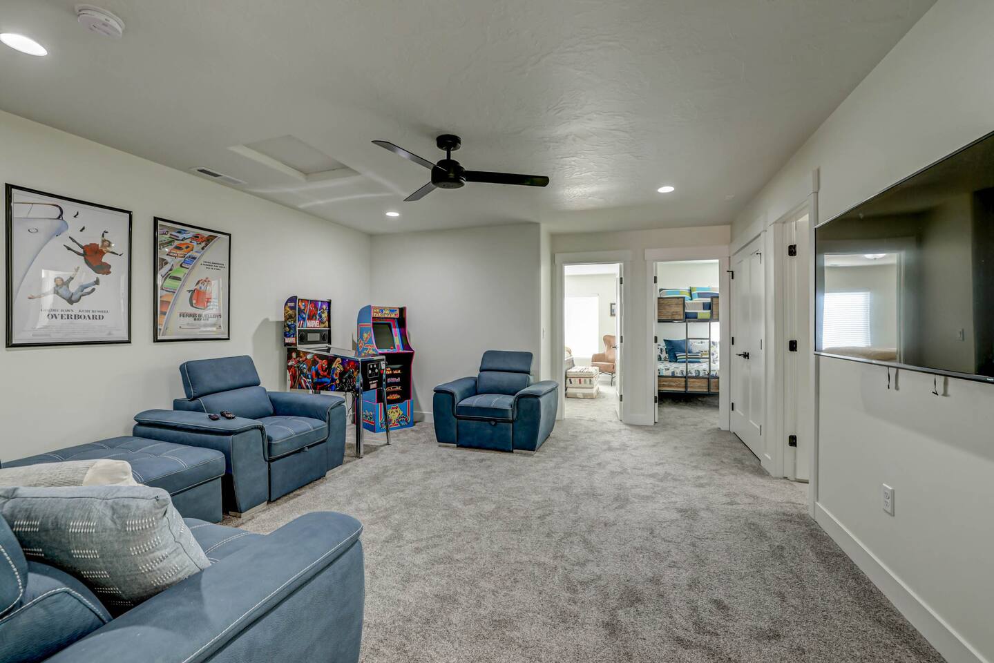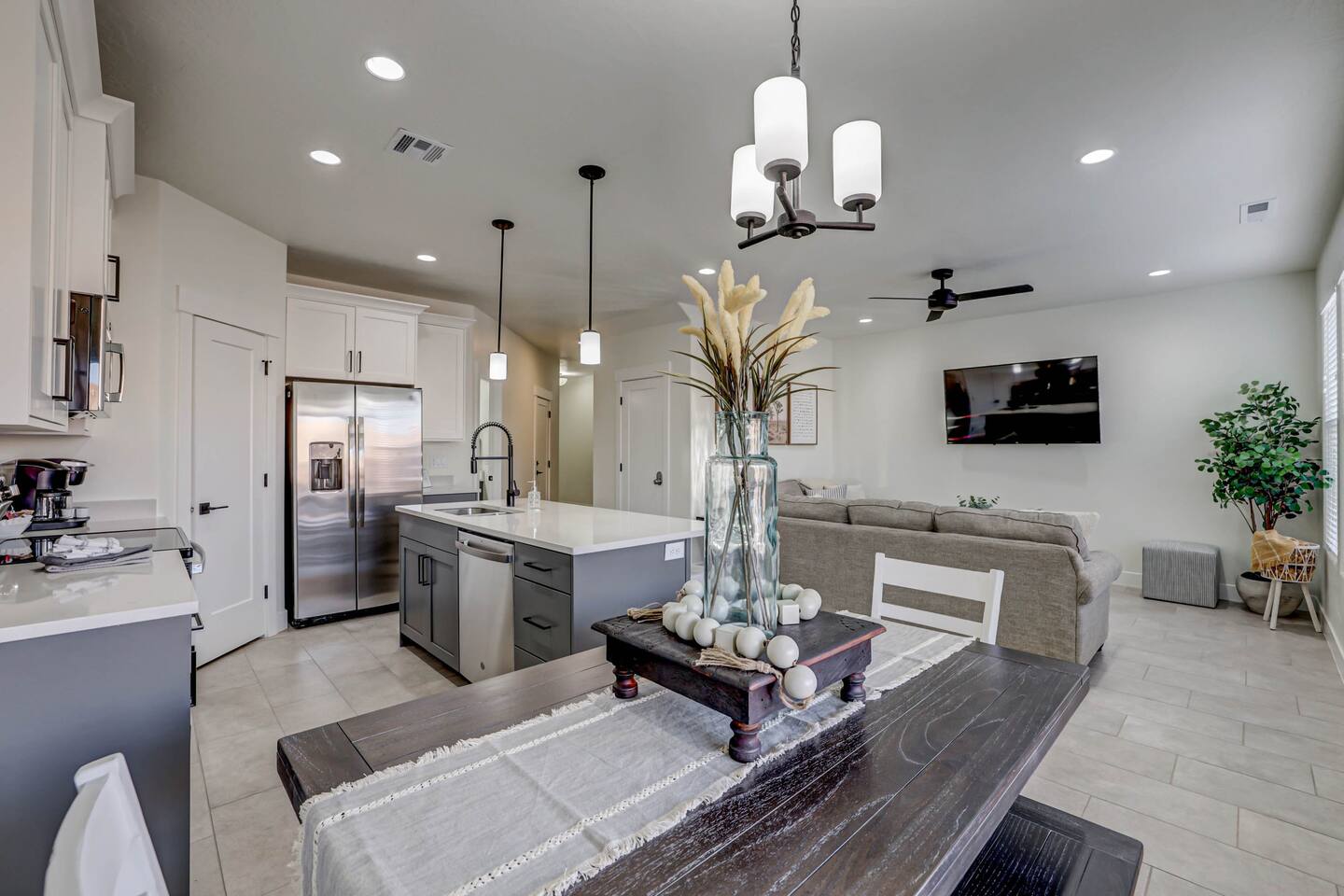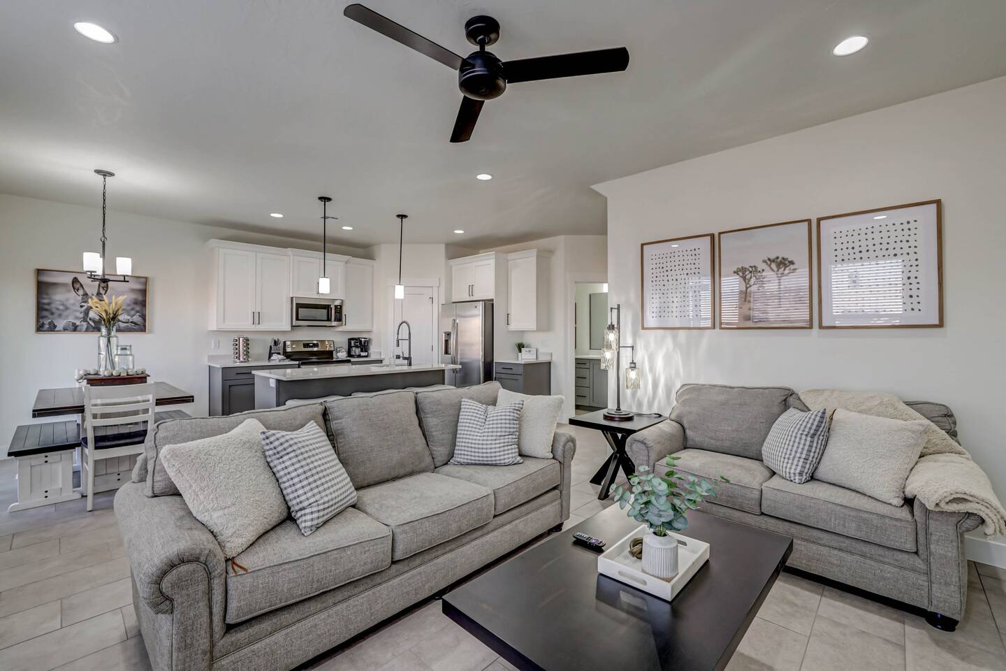 Relax and have fun in this beautiful 3 bedroom-3 bathroom home with fenced outdoor living-space including a private hot tub and fire pit. Within minutes you can sit in the swirling water and feel the stress melt away! This amazing home makes for a rejuvenating and fun retreat for families and small or large groups. The home boasts two master suites and a bunk room, each with their own closet, ceiling fan and Smart TV. Three full bathrooms give plenty of room for everyone. Gather 'round in two spacious living areas that are perfect for conversation and entertainment, complete with large Smart TVs. Kids (and adults) will enjoy the Arcade game as well as multiple board and card games. High Speed WiFi throughout allows multiple devices to stream and zoom calls simultaneously. The extended dining table seats 8, with three additional bar chairs seated at the granite kitchen island. The well-equipped kitchen has every amenity you will need to prepare Thanksgiving dinner for a family. Step out onto the patio to an outdoor dining table with seating for 6. Everything tastes better on a natural gas BBQ, and when you're done eating, relax in the private hot tub and roast marshmallows on the fire pit as you talk about your next adventure in Southern Utah. Your entire experience will make others want to be where you are! * ACCOMODATIONS * Bedroom 1: King Bed - Ensuite bathroom with walk-in shower and large soaking bath tub. Bedroom 2: Queen Bed Bedroom 3: Full Bunk Beds x 4 Other: Queen Sofa Sleeper Pack-N-Play Portable crib * We can accommodate 1 infant in this property. If more than 1 infant, please inquire. - Sleeps up to 12 guests Please contact us with any questions - We are always happy to help! *** We have additional properties and would love to help find the perfect property for you! READ our reviews to hear from thousands of previous guests and their experience with us and why we are the best choice for your Southern Utah Vacation Rental.