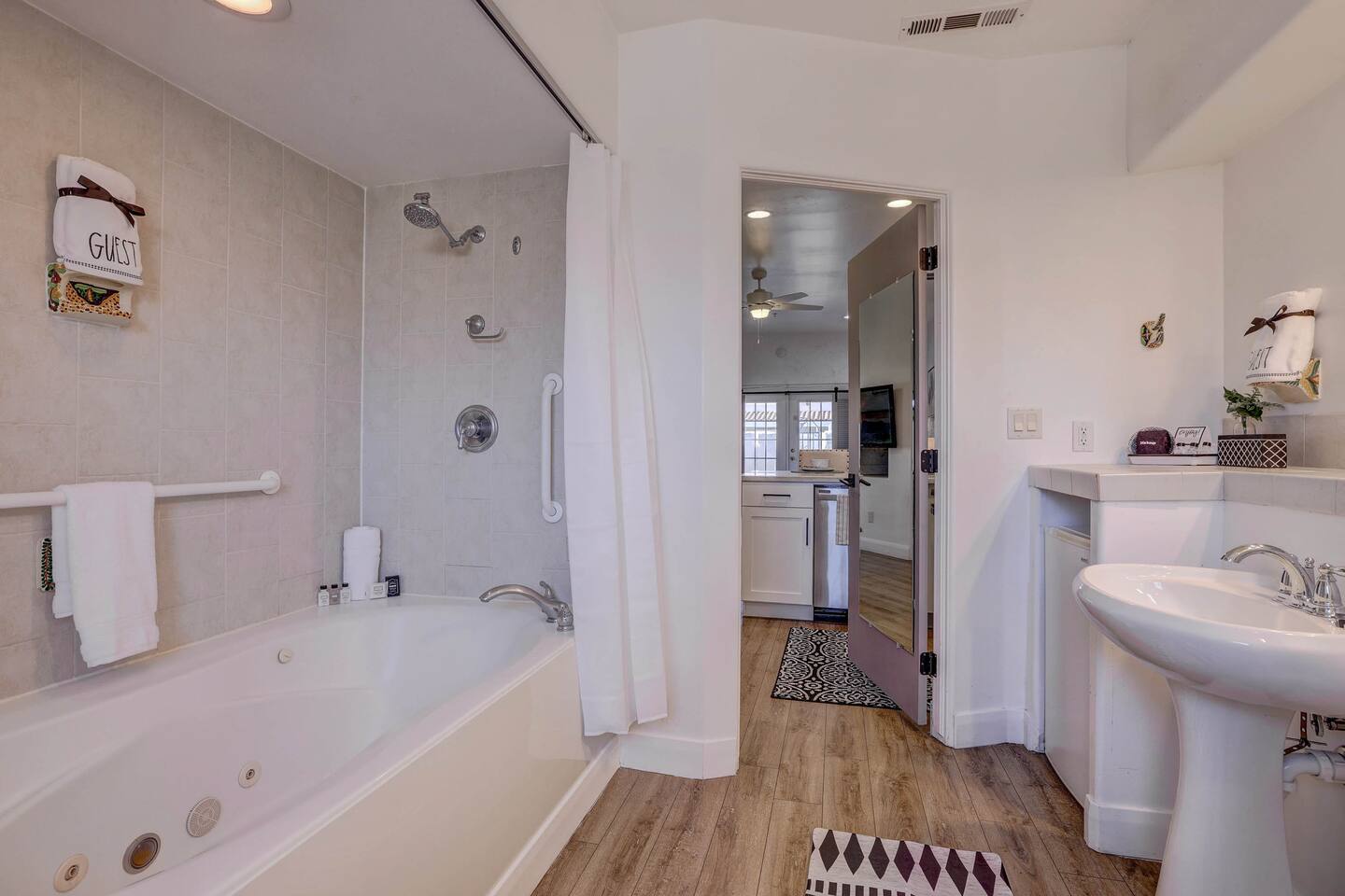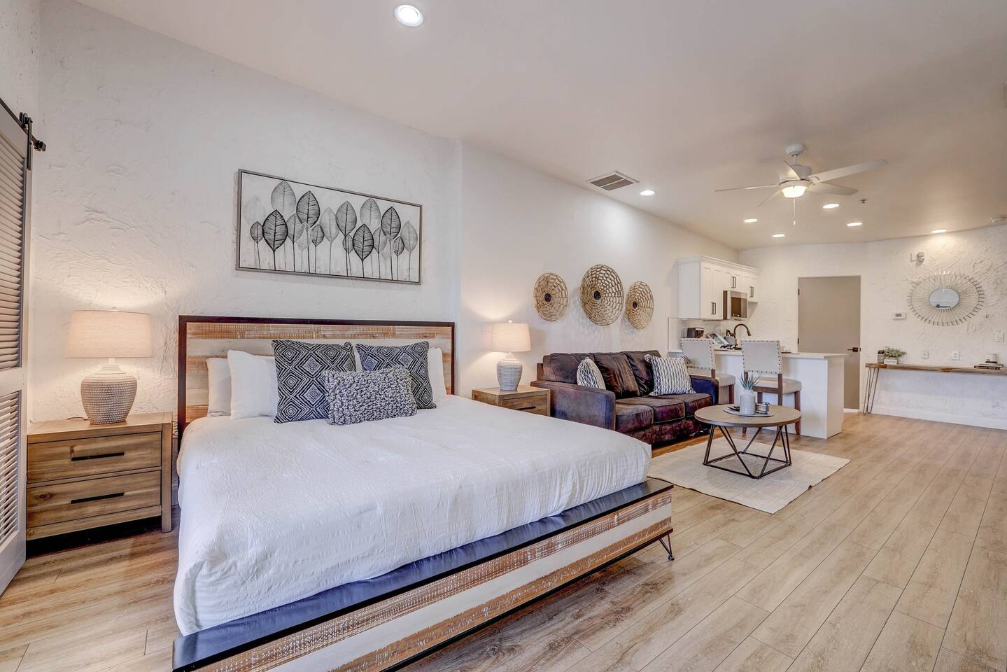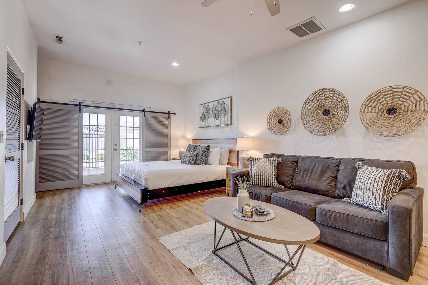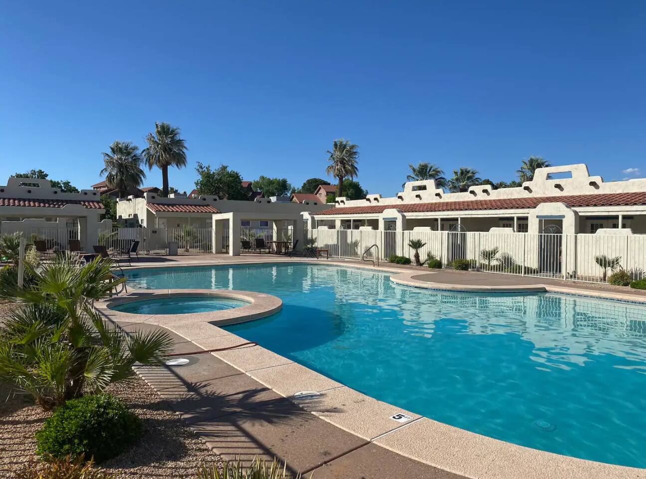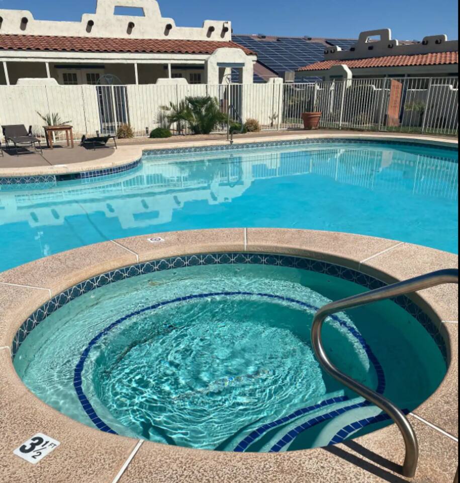 Stylish Studio Featuring --> • Dog Friendly* • Smart Roku TVs • Bathroom with Jetted Tub • Full Kitchen w/ Fridge, Oven, Microwave and Dishwasher • Fenced Patio Steps Away from Pool w/BBQ Grill Sleeping Options --> • King Bed • Queen Inflatable Air Mattress • Pack N Play Portable Crib (*We can accommodate 1 infant in this villa. If more than 1 infant, please inquire.) Also Included --> • All Towels/Bedding including Pool Towels • Toiletries and Hair Dryer • Fridge, Microwave, Oven, Dishwasher, Coffee Maker/Keurig, Dishes/Glasses/Silverware, Etc. • Fenced Patio with BBQ and Lounger • PickleBall Racquets and Balls Resort Amenities Included --> • Two Swimming Pools (Family and Adult) • Hot Tub • Pickle Ball Courts • Fitness Center w/Cardio and Weights • Laundry Room w/Laundry Supplies + Iron • Ice Machine • Spa (Services at an additional cost) --> NOTE: Pools and Hot tub will not be available Dec1-Jan31. Nightly rates have been discounted accordingly. * Villa is dog friendly and we do not charge a pet fee for one small dog. If you have more than 1 dog or if your dog is larger than 17 pounds - please inquire. We have made exceptions and absolutely willing to consider - pet fee may apply for larger/additional dogs. Please send us a message. We are happy to help!