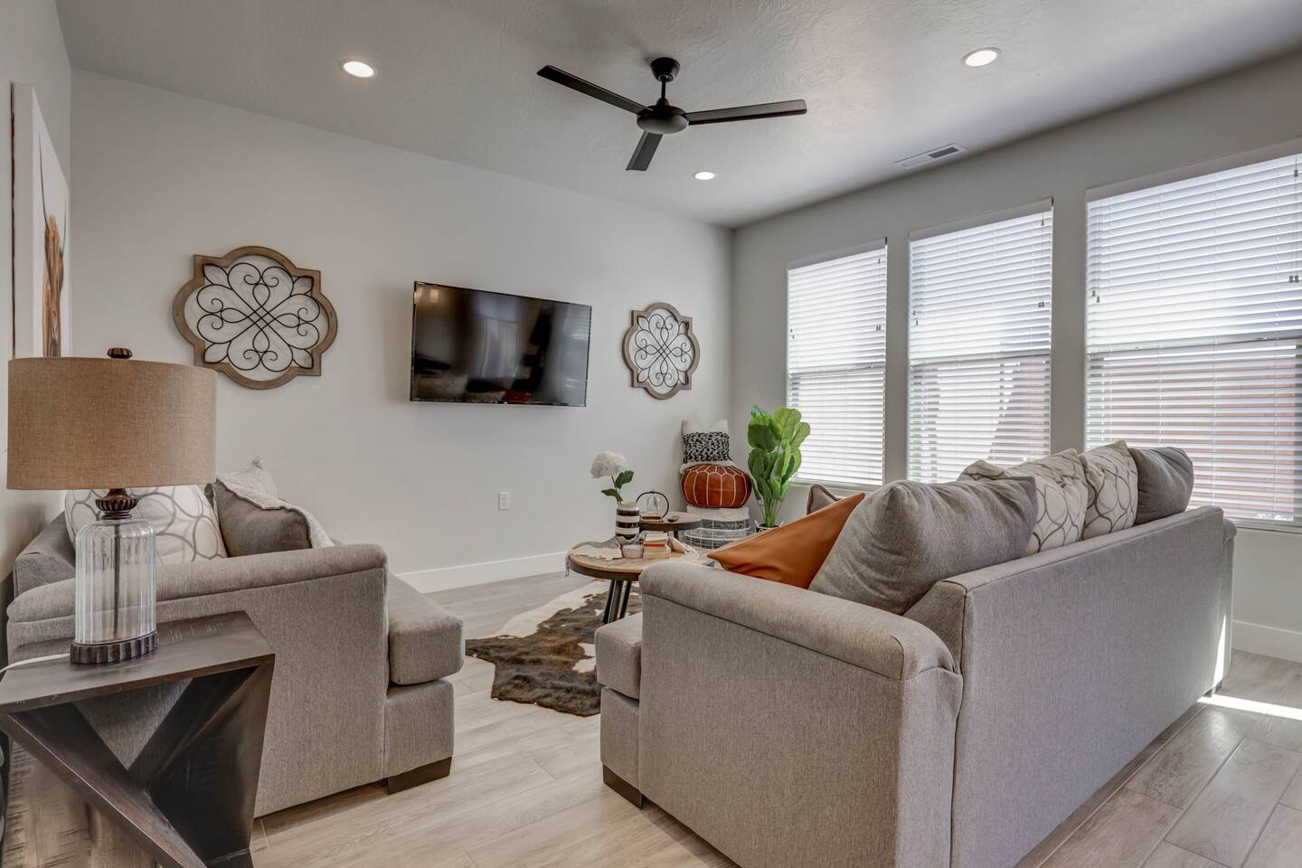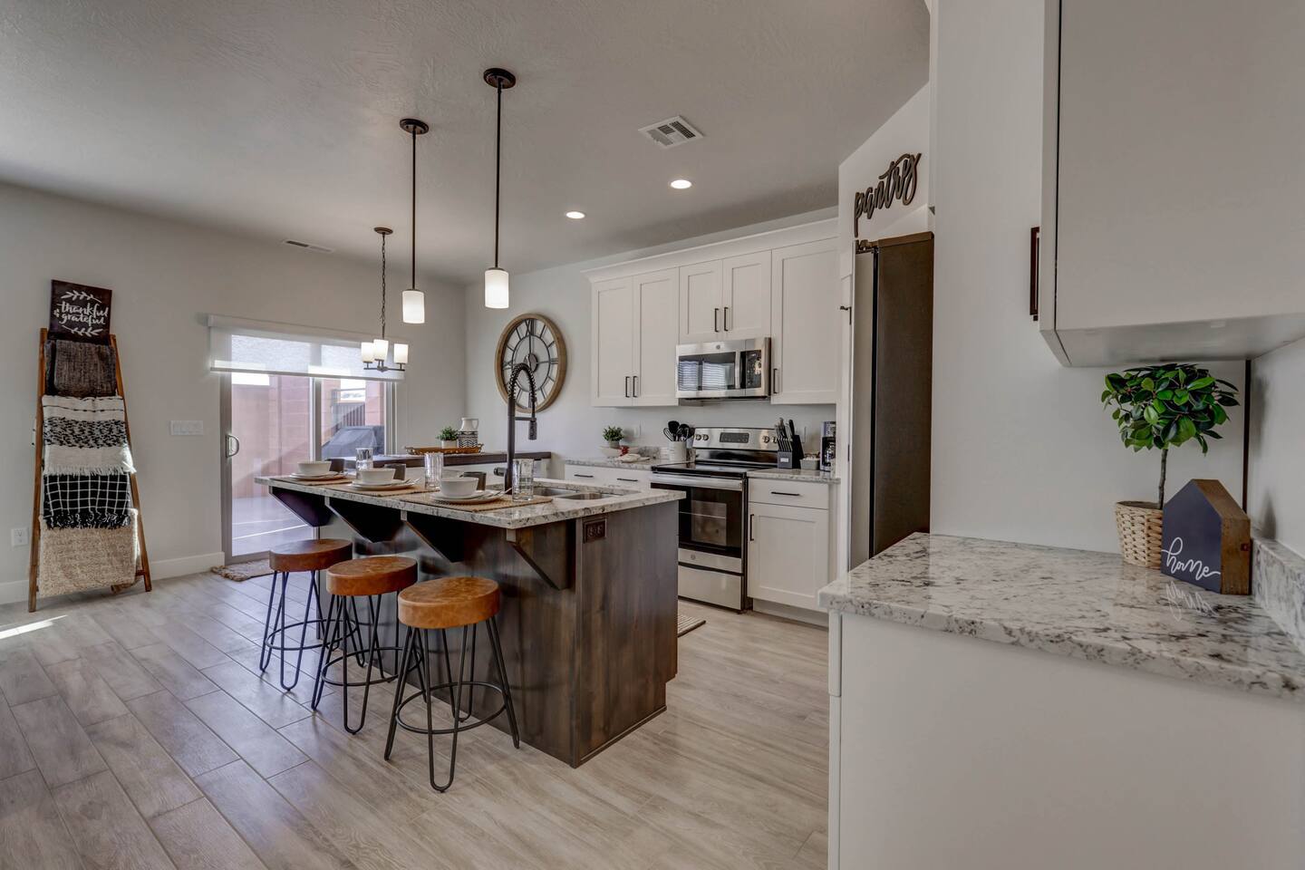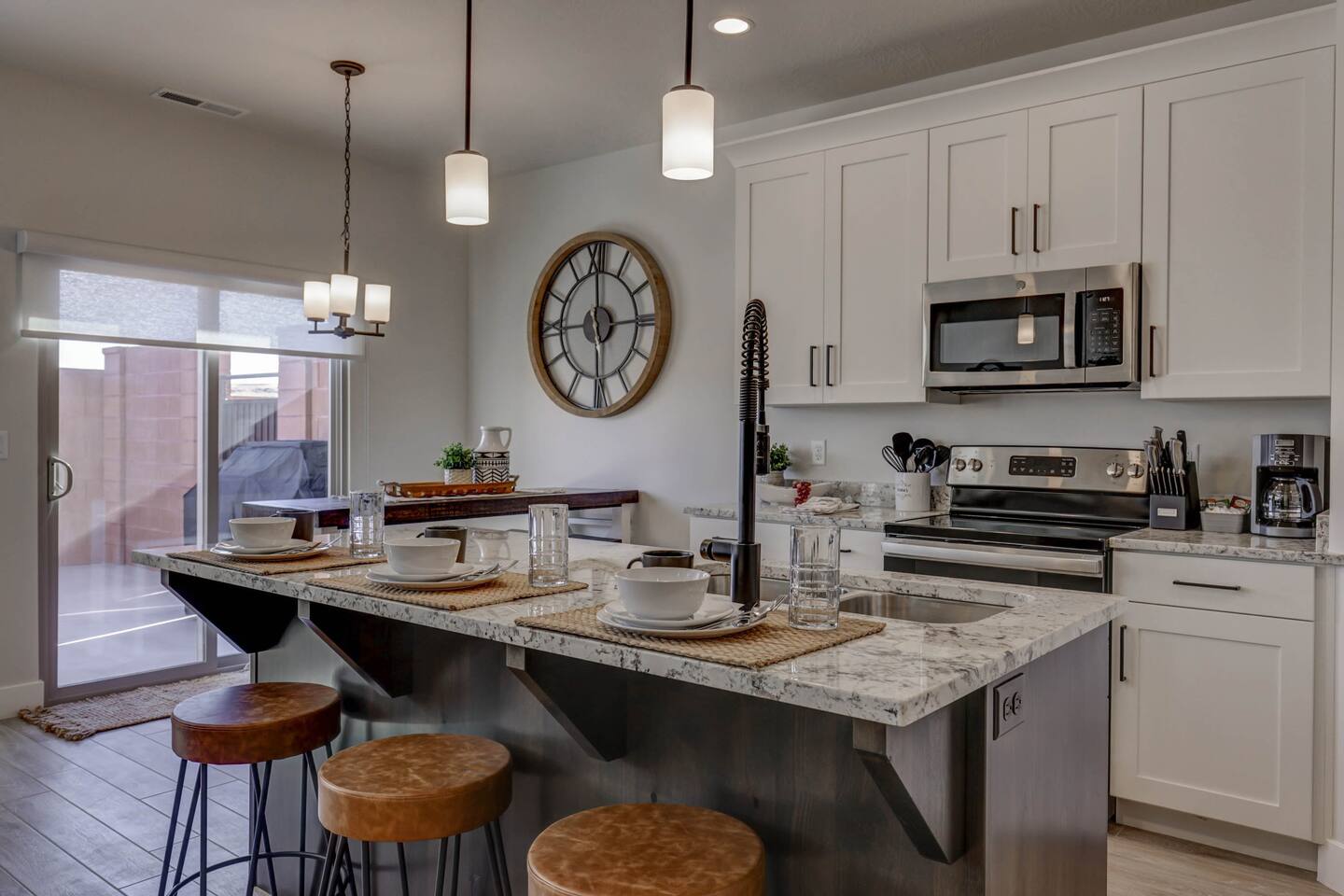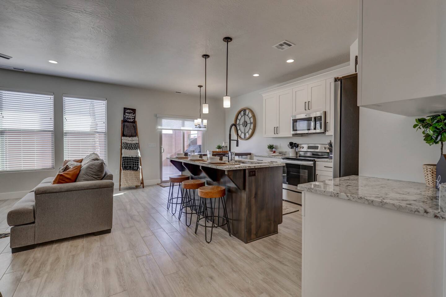 Enjoy our beautiful Southern Utah Retreat with 3 bedrooms + 3 full bathrooms and RV parking. Boasting a fenced courtyard with private hot tub, fire pit, bbq grill, outdoor dining table with additional seating makes this the perfect place. This brand new pet friendly home is professionally decorated with top of the line furnishings including a fully stocked gourmet kitchen. We have thought of every detail and you will have everything you need for an amazing and memorable stay.