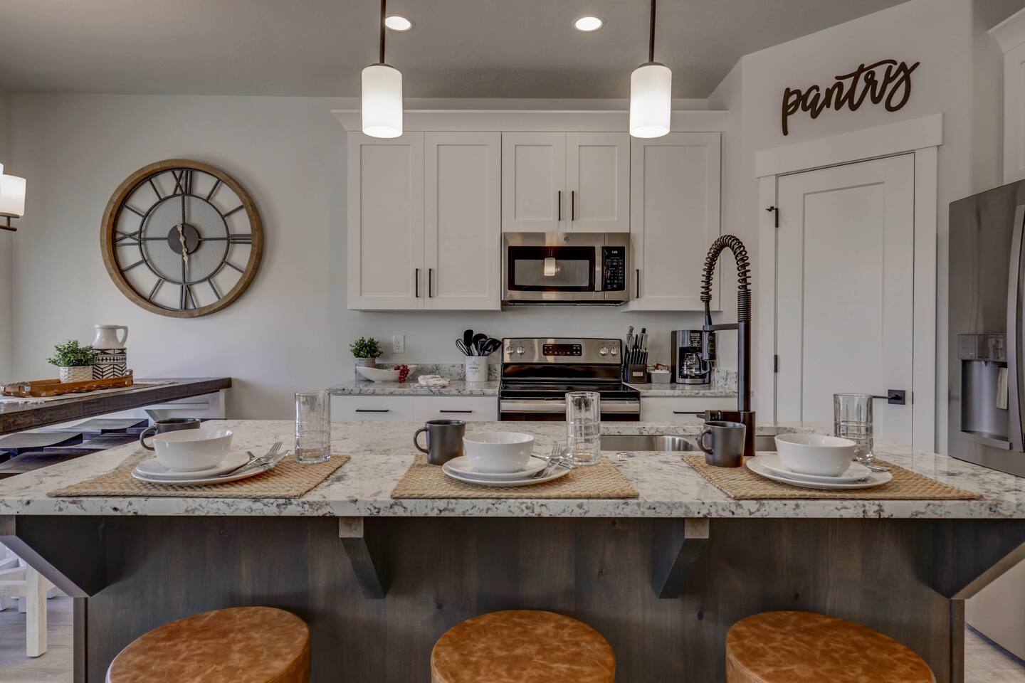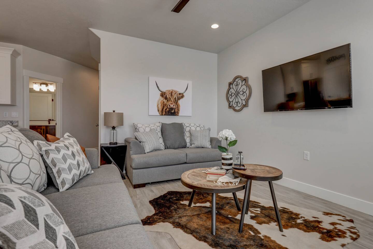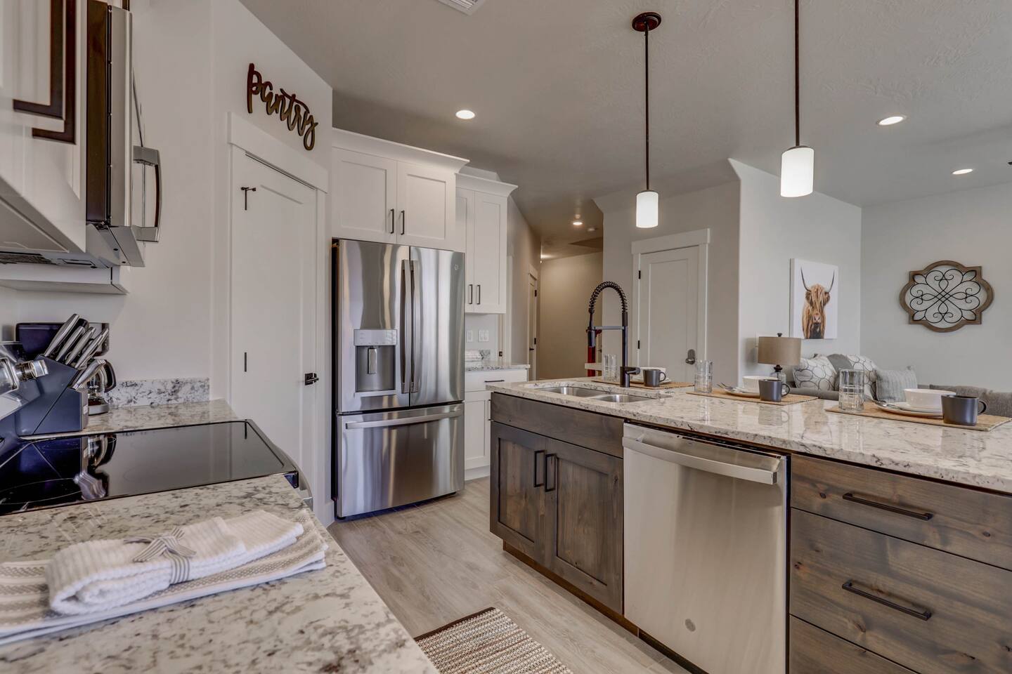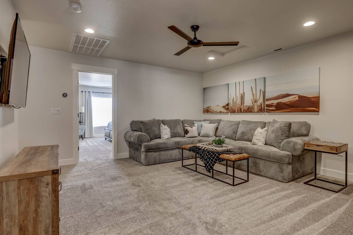 Enjoy our beautiful Southern Utah Retreat with 3 bedrooms + 3 full bathrooms and RV parking. Boasting a fenced courtyard with private hot tub, fire pit, bbq grill, outdoor dining table with additional seating makes this the perfect place. This brand new pet friendly home is professionally decorated with top of the line furnishings including a fully stocked gourmet kitchen. We have thought of every detail and you will have everything you need for an amazing and memorable stay.