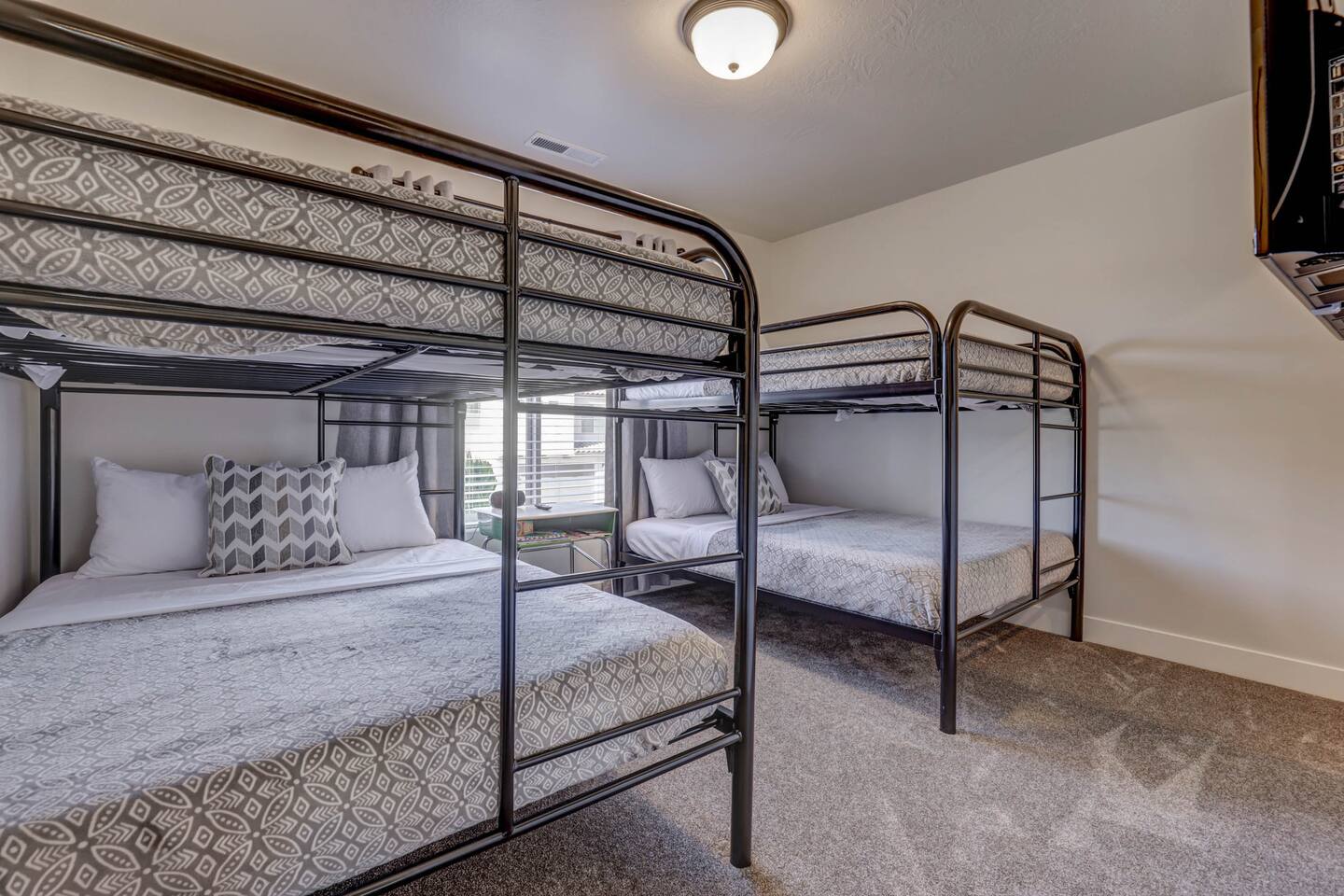 Sleeps up to 10 • Master Bedroom: 1 King • Bedroom 2: 1 King • Bedroom 3: Double Bunks x 4 • Queen air mattress in upstairs family room • Pack-N-Play portable crib in master bedroom (We can accommodate 1 infant in this property. If more than 1 infant, please inquire) Enjoy this fully equipped kitchen with all the luxuries of home. Featuring granite counter tops, stainless steel appliances and a dining room table that seats six and bar seating for three, there is plenty of room to entertain family and friends. There is also an outdoor dining table that seats six on the back patio just outside the sliding glass kitchen doors. Natural light illuminates the main living room which has two couches, comfort seats, and a 55" flat screen smart TV. The second spacious living area is upstairs and includes a comfortable sectional, a 55" flat screen smart TV with cable where you can unwind! We have even stocked some favorite card and board games ensuring total enjoyment after a day in the sun. The private courtyard includes an outdoor hot tub, BBQ grill, fire pit, outdoor dining table with plenty of additional patio seating, perfect for relaxing beneath the stars. Home has a large 2 car garage with an electric car charger. Community swimming pool is heated and open year round! You will truly feel spoiled during your stay with too many amenities to list. Rest assured, we have thought of everything and know you will love our Southern Utah Retreat. We get asked often about our fully stocked gourmet kitchen so we have included what is provided for your stay: Coffee Maker w/Coffee Starter Toaster Blender Crockpot Griddle Dishes for 12 Glasses for 12 Coffee Cups for 12 Wine Glasses for 12 Plastic Kid Dishes Pitcher and Cups Silverware for 12 Knife Set Wine Glasses for 12 MIxing Bowls Serving Platter Tupperware Pots & Pans Pyrex Colander Cookie Sheets Cake Pans Measuring Cups and Spoons Mixing Spoons Whisks Spatulas Large Serving Spoons Vegetable peeler Pizza Cutter Ice Cream Scoop Can/Wine opener Roasting Sticks for Fire pit Outdoor Utensils for BBQ grill Salt and Pepper Spice Rack w/20 Spices NonStick Cooking Spray Ziplock Baggies Aluminum Foil Paper Towels Napkins Fire Extinguisher First Aid Kit Basic Cleaning Supplies and MORE!!!! * Home is dog friendly and we do not charge a pet fee for one small dog. If you have more than 1 dog or if your dog is larger than 17 pounds - please inquire. We have made exceptions and absolutely willing to consider - pet fee may apply for larger/additional dogs. Please send us a message. We are happy to help!